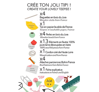 Dans ce coffret, Happy go lucky a glissé un tipi pré-découpé et pré-troué, 4 jolies baguettes et des perles de bois découpées par leur menuisier du Jura, des bouts de feutrine autocollante certifiés oekotex et découpés à Grenoble, des attaches parisiennes de la marque BOHIN et un cordon ciré français.