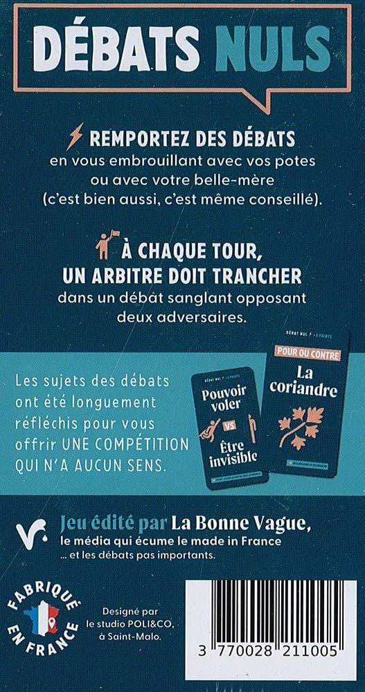 Un jeu de société d’ambiance made in France dédié aux débats futiles par La Bonne Vague.