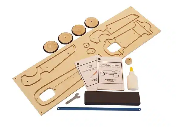 - Une planche de bois prédécoupée avec chaque partie de la voiture à détacher
