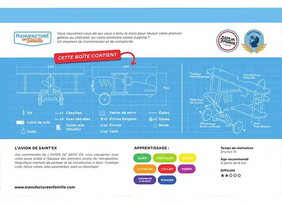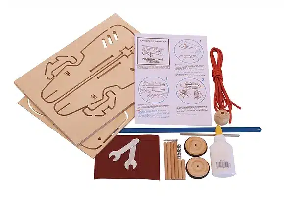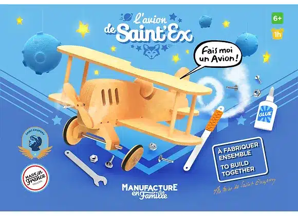 L’avion de SAINT EX, un biplan retro, sobre et élégant, plongera votre enfant dans l’univers des premiers vols postaux. Il découvrira comme le petit prince avec sa rose, que c’est le temps passé à construire son avion qui fait son avion si important…