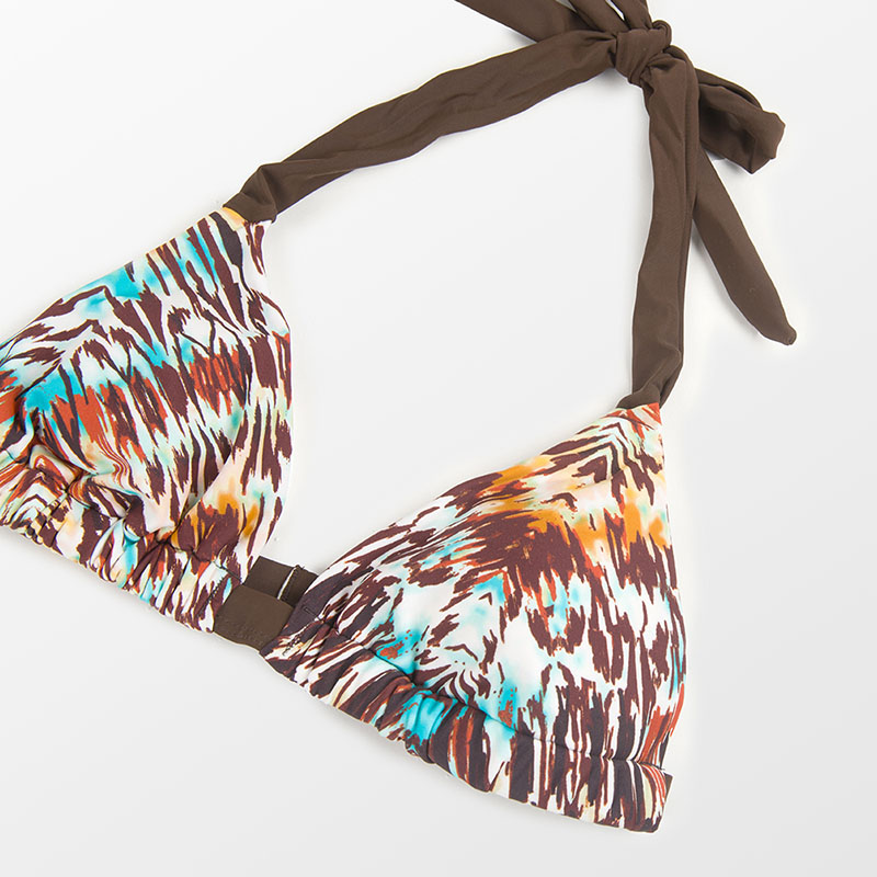 Cet ensemble de bikini se compose d’un magnifique haut triangle en maille extensible. Malgré l’absence d’armatures, une bande élastique sous poitrine garantit un meilleur maintien. Liens doubles à nouer en tour de cou. Fermeture dos par crochet .