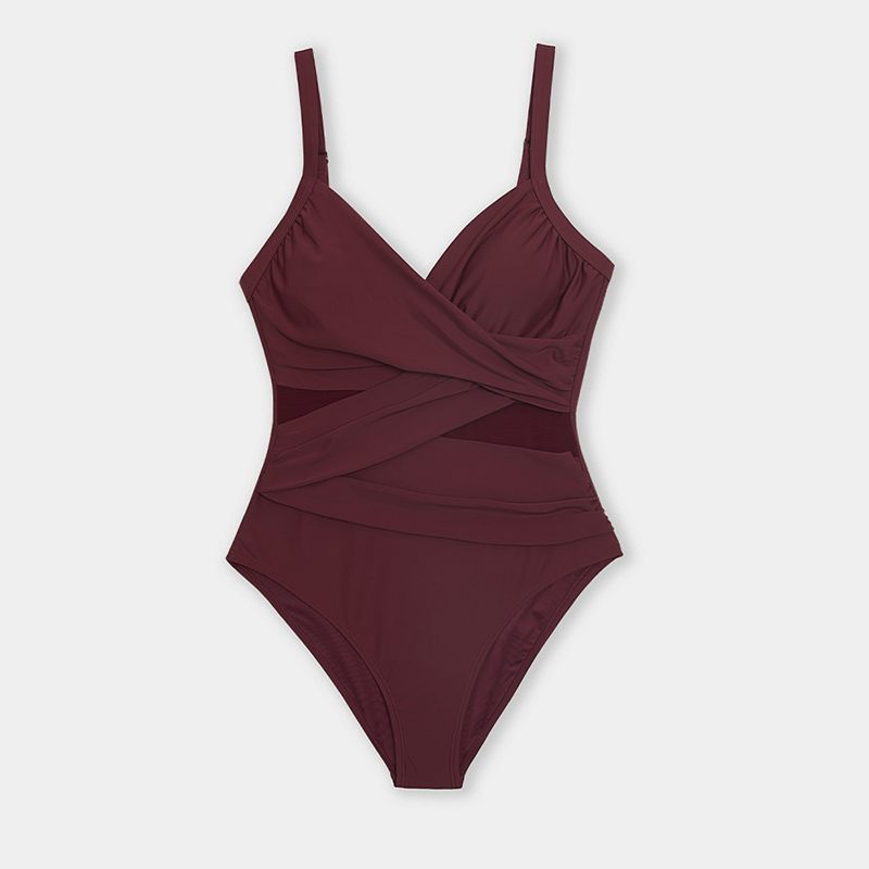 Magnifique maillot de bain 1 pièce boho gainant bordeaux en maille extensible. Les bonnets à coques sans armature offrent un décolleté éblouissant et un excellent maintient.  De chaque côtés, des empiècements de tulle jouent la carte de la transparence en dévoilant subtilement la peau. A l’avant, l’effet sculptant est renforcé par le drapé en cache-cœur élégant. La poitrine est quant à elle sublimée par un léger mais irrésistible décolleté.