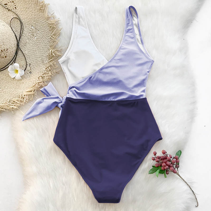 Ce maillot de bain est original car son décolleté ainsi que son échancrure de dos sont en V. Un côté glamour accentué par son petit nœud à la ceinture. La coupe classique au niveau des fesses dévoile légèrement les courbes tout en assurant une couvrance rassurante