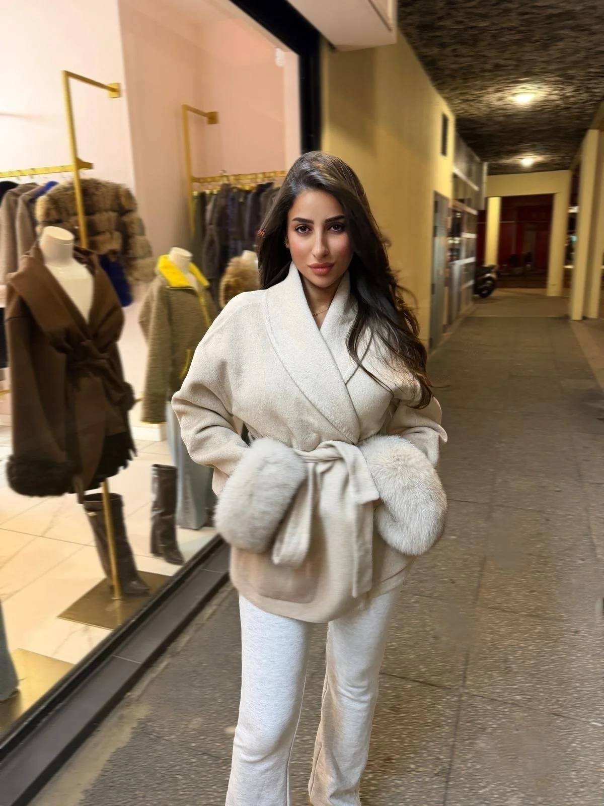 Fabriqué en pur cachemire et orné de fourrure de renard de première qualité, ce manteau est une fusion de luxe et de chaleur. Profitez de la douceur et de la chaleur de la cachemire tout en étant élégant grâce à la touche de fourrure de renard.
