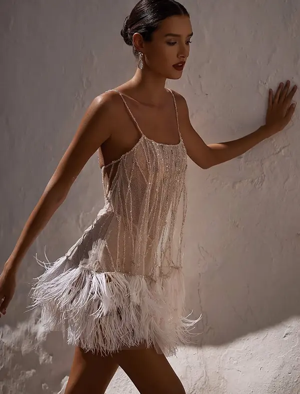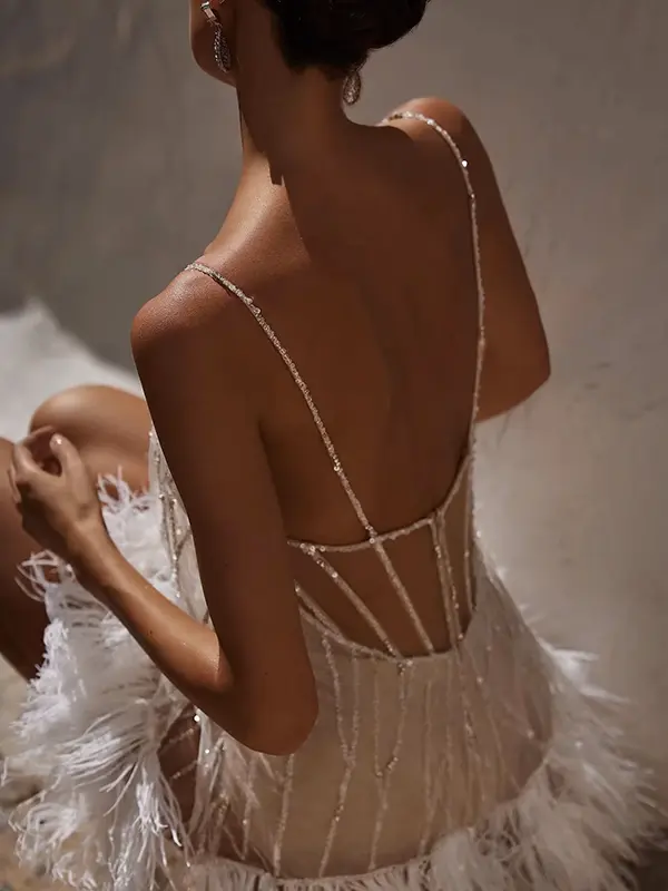 - Détails : coupe ample, col bateau, bretelles fines strass, ourlet franges et dos perlé.