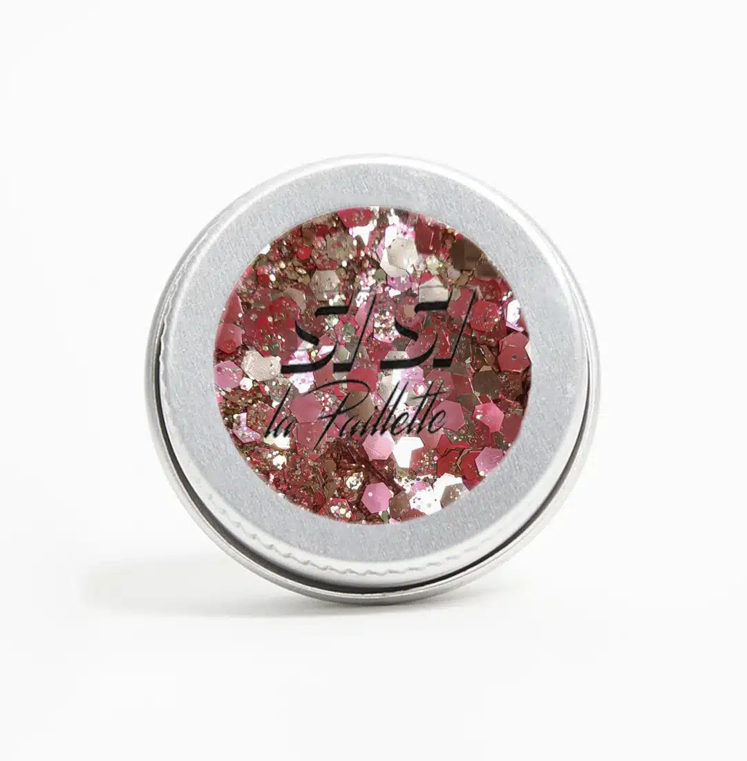 Un mélange de paillettes à base de plantes aux couleurs or rose et rouge, avec des pointes de doré, argenté et rose, et de toutes les tailles pour toujours plus de brillance !