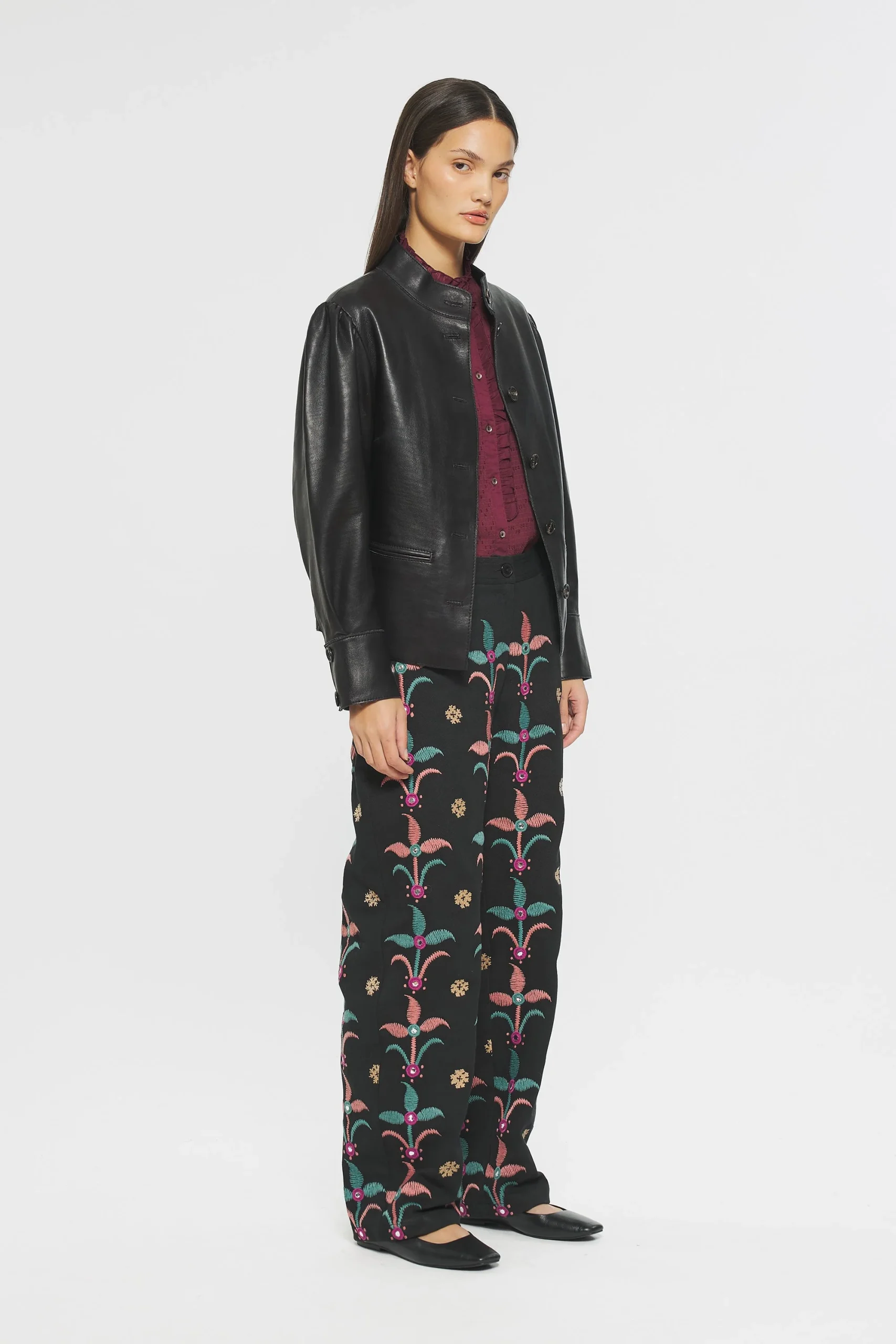 Pantalon en twill de coton. Broderies artisanales sur l’ensemble du pantalon, devant et derrière. Pantalon orné de miroirs fantaisie brodés. Deux grandes poches sur le devant et l’arrière et deux petites poches à l’avant. Fermeture avec un zip et un bouton en polyamide. Doté de passants pour ceinture.