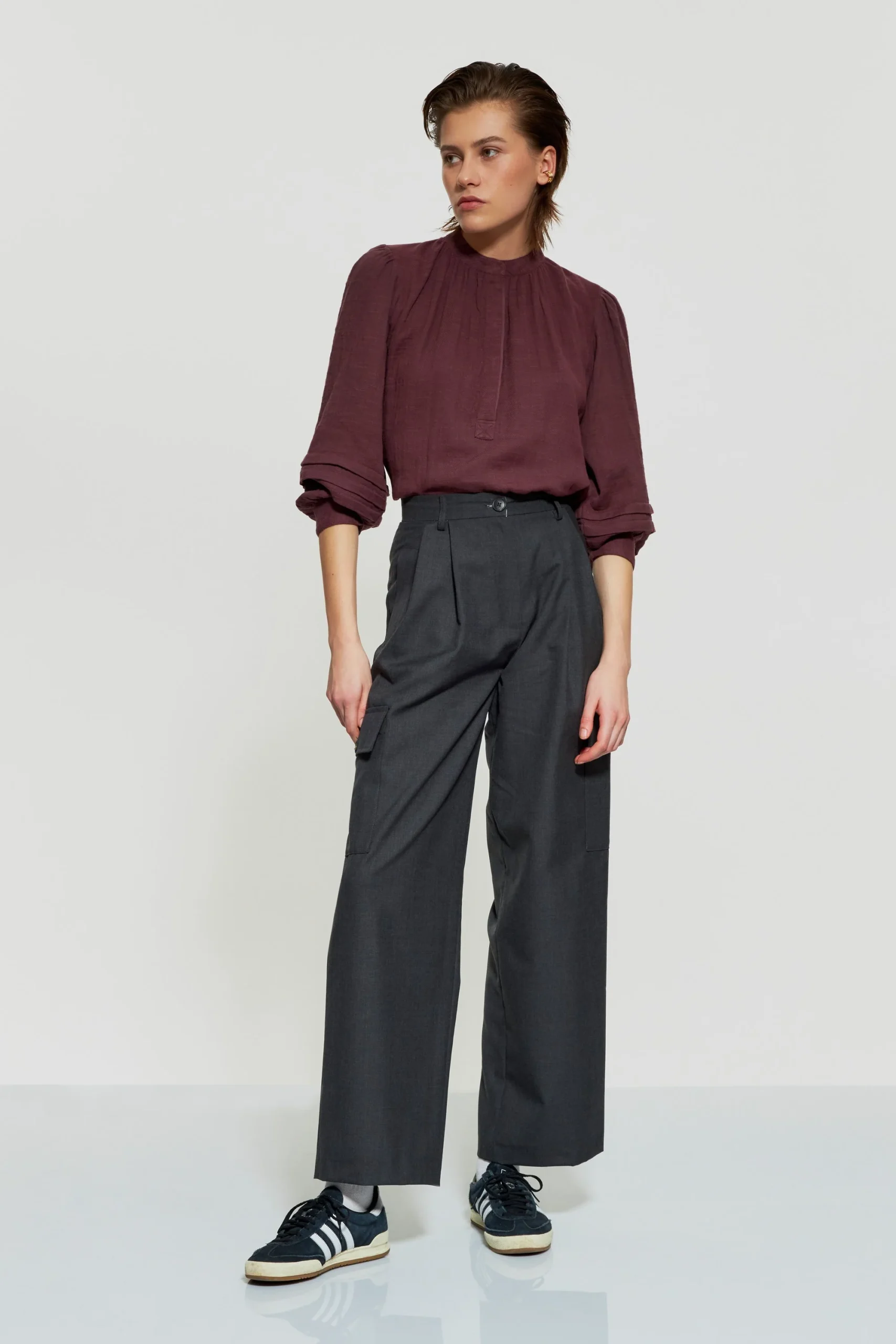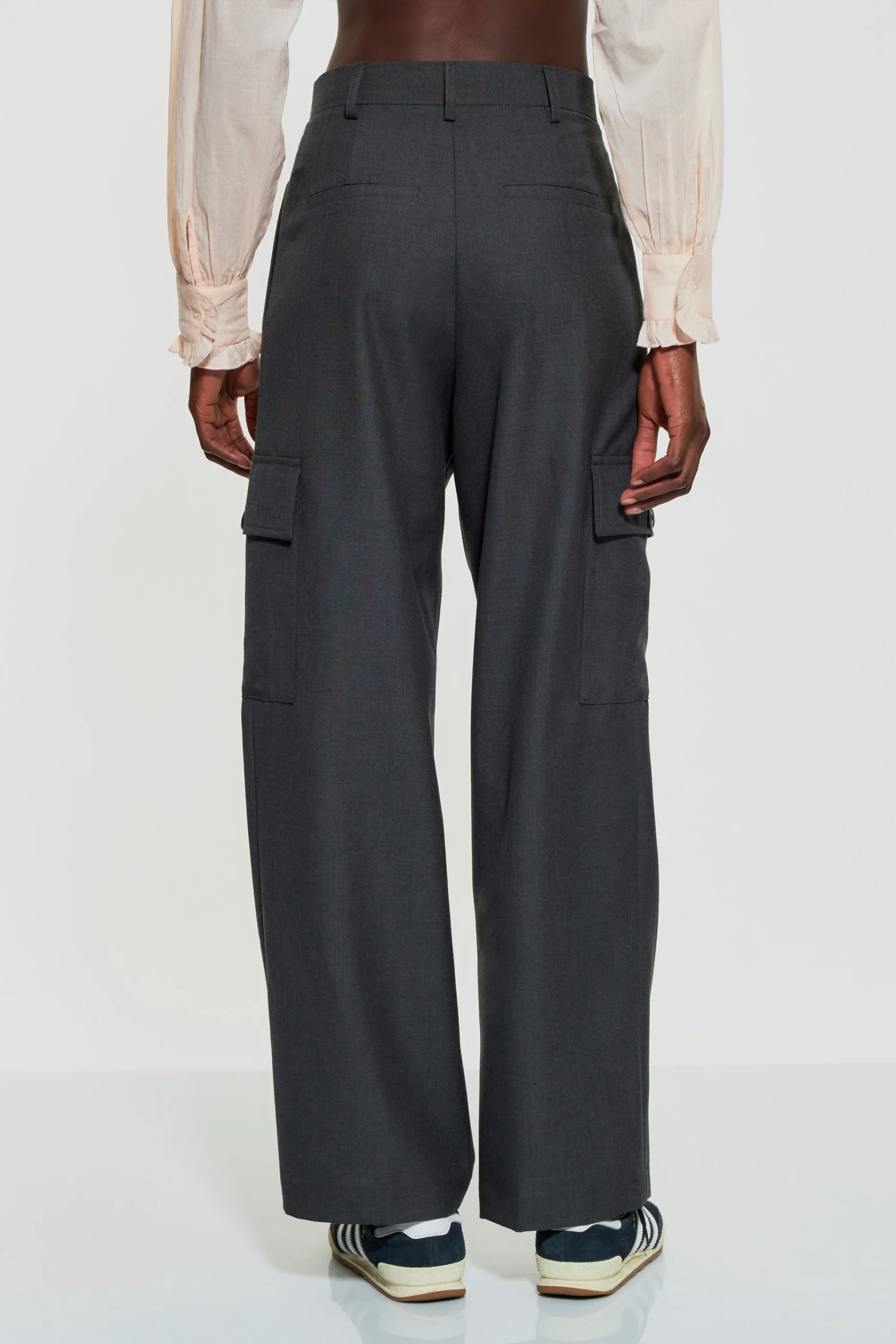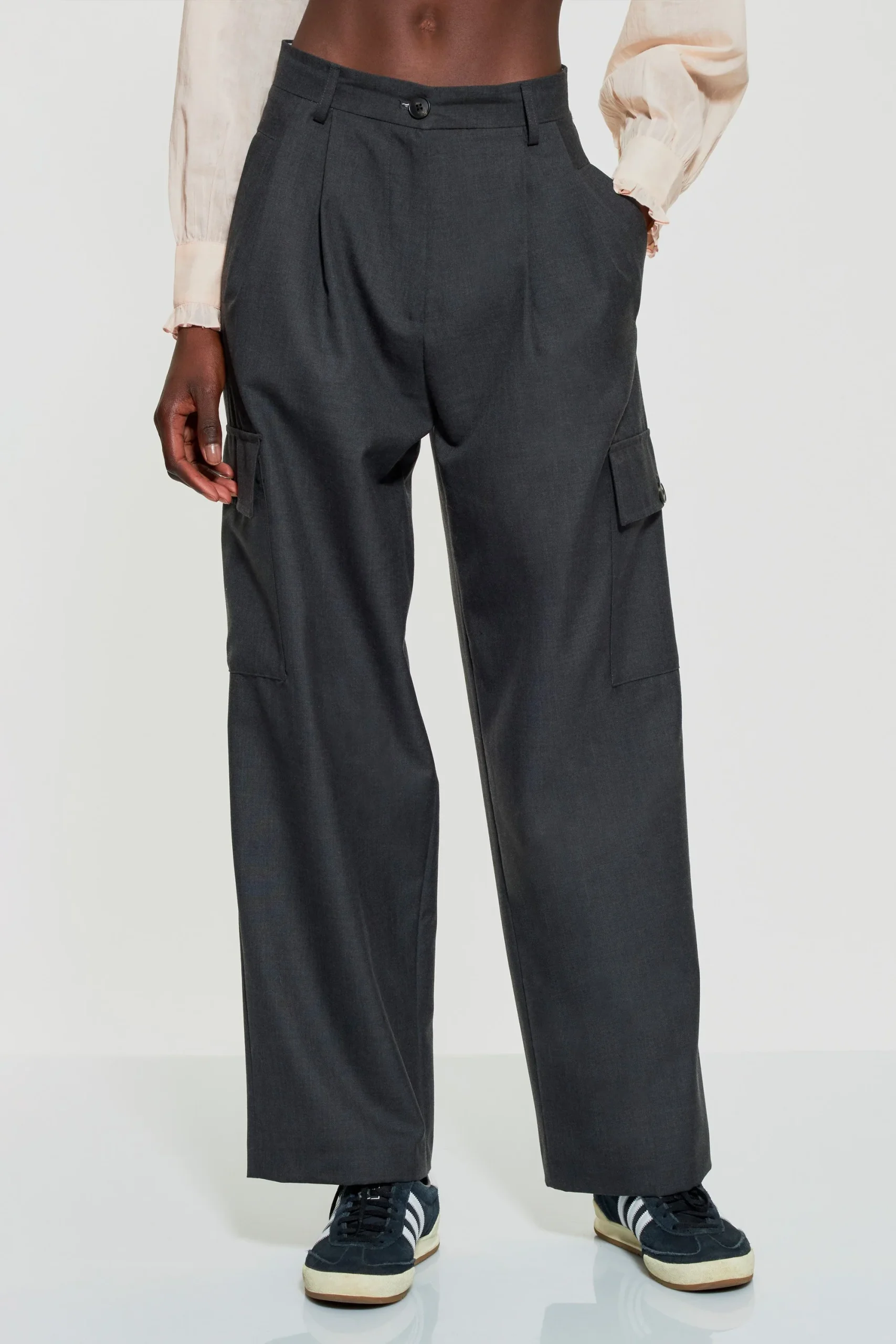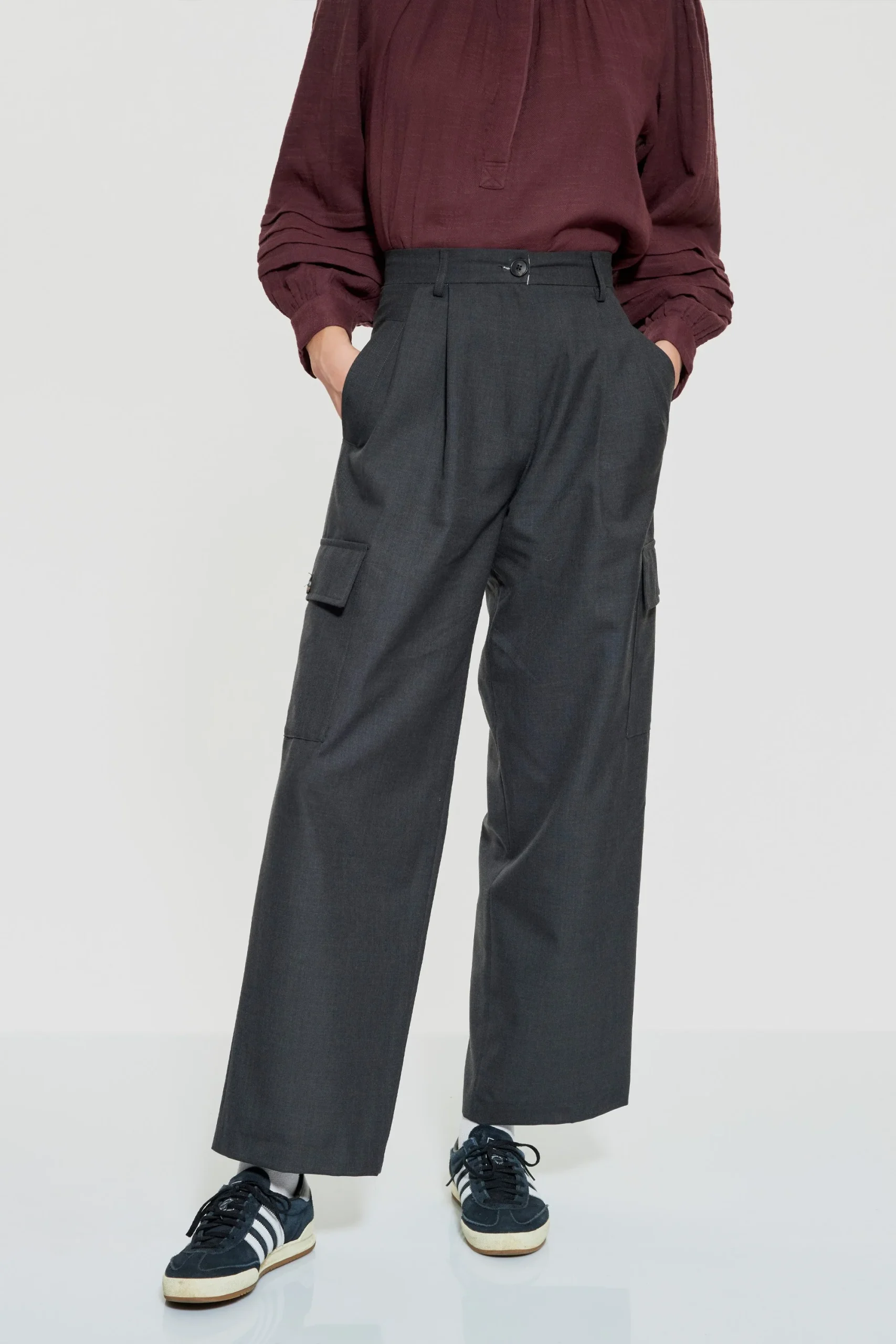 Pantalon cargo à plis en laine. Taille haute. Coupe large et droite. Deux poches latérales et deux poches cargo. Fermeture par bouton et zip. Passants pour ceinture.