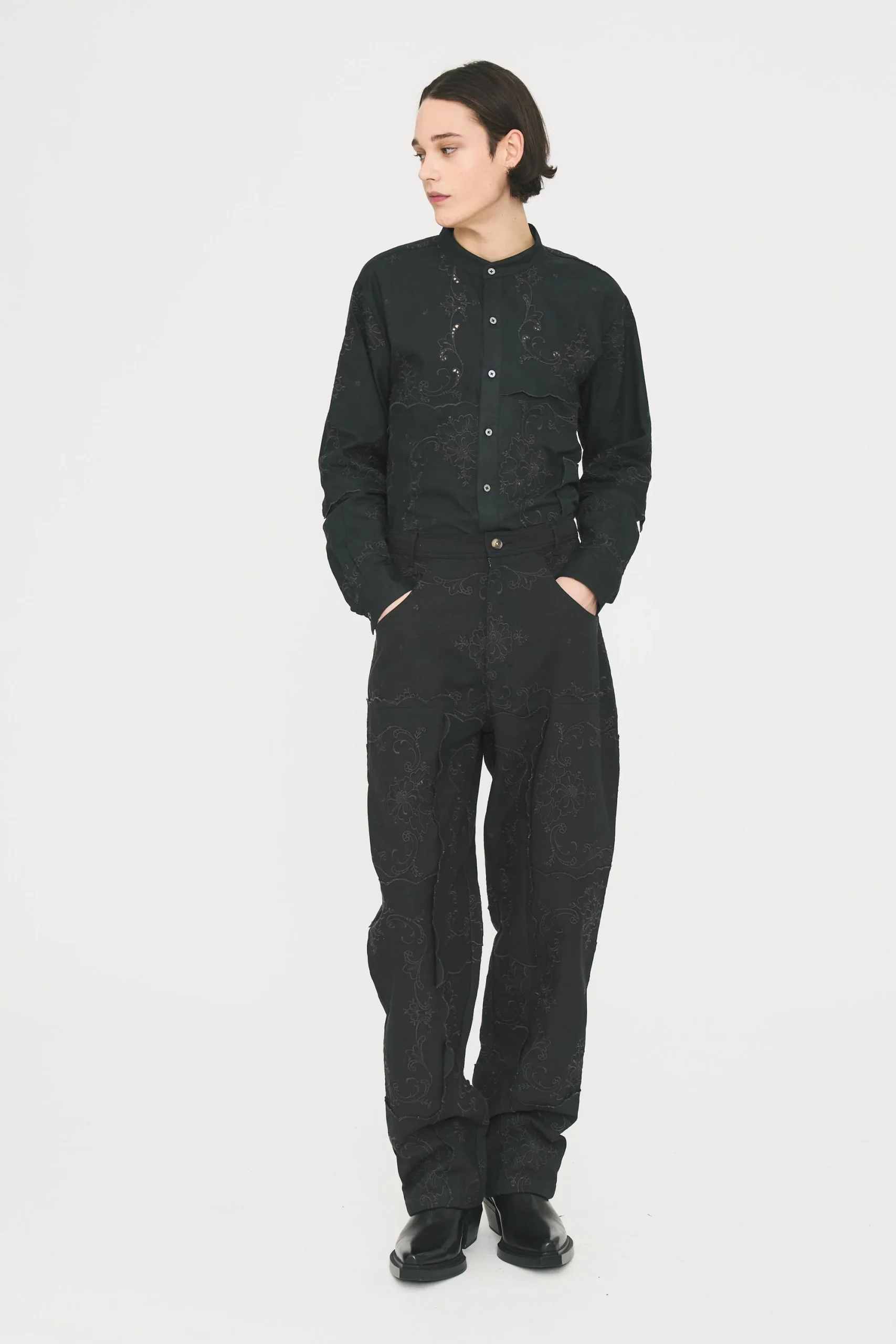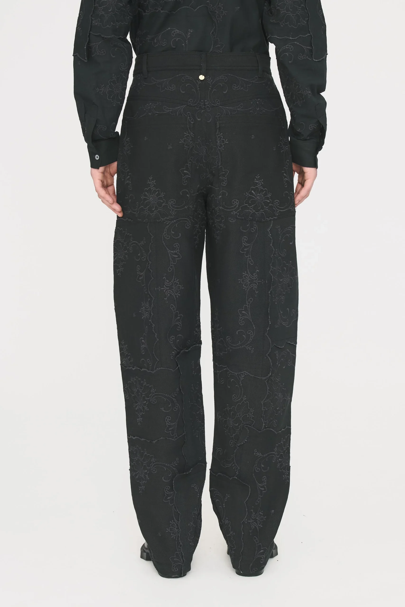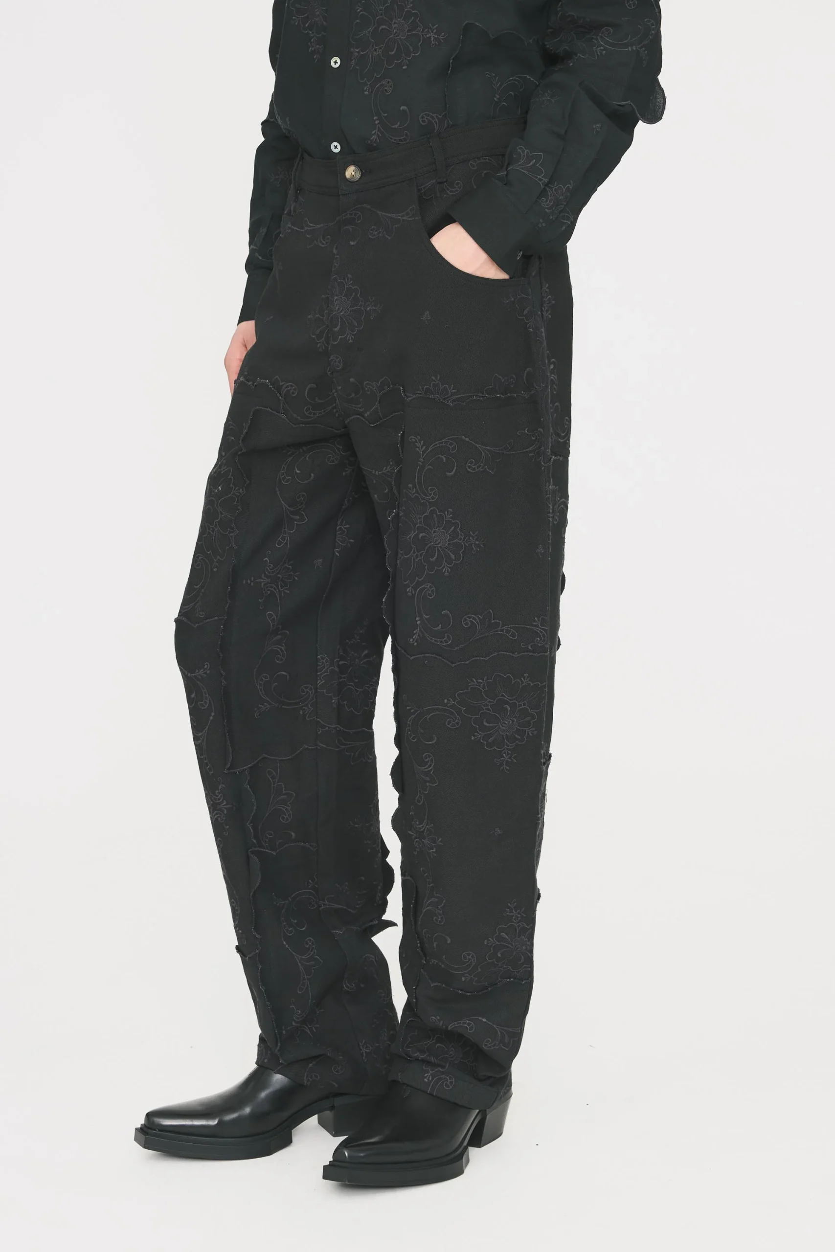 Pantalon en coton denim et lin. Tissu patchwork entièrement brodé artisanalement. Deux poches latérales sur le côté. Ouverture boutonnée et braguette.