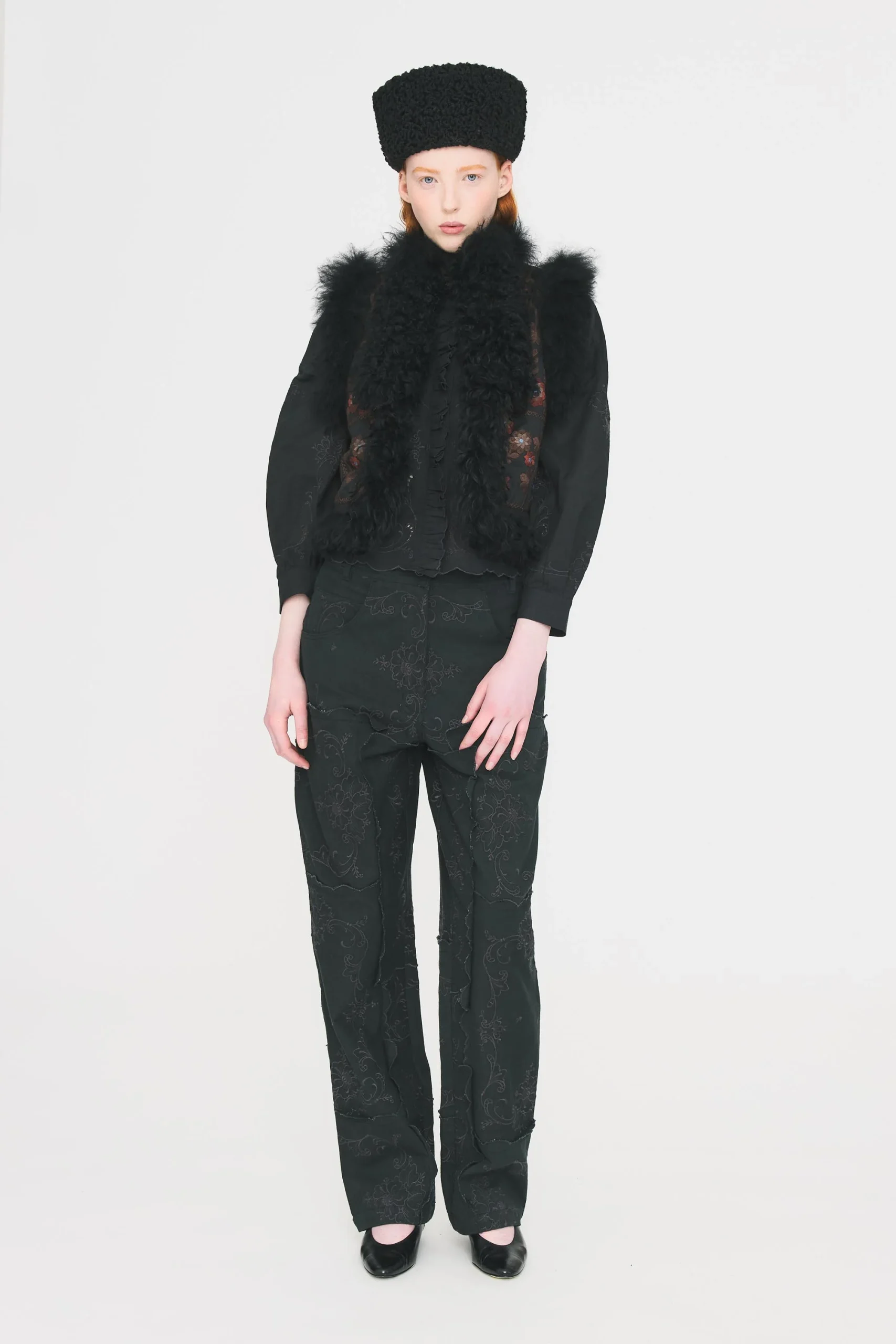 Pantalon en coton denim et lin. Tissu patchwork entièrement brodé artisanalement. Deux poches latérales sur le côté. Ouverture boutonnée et braguette.