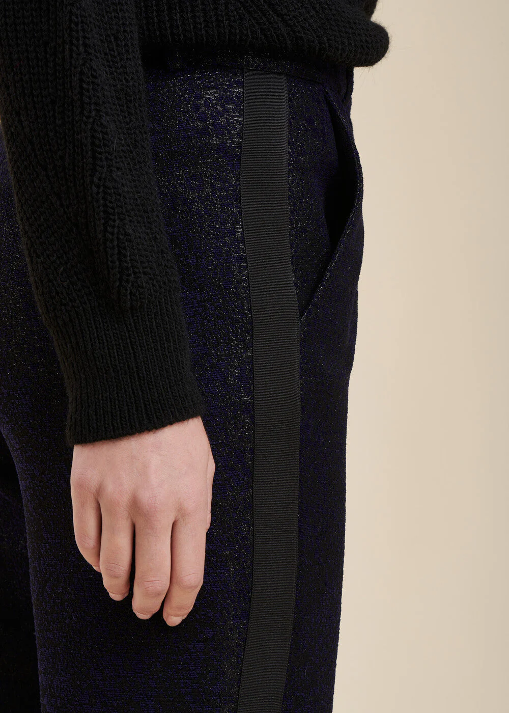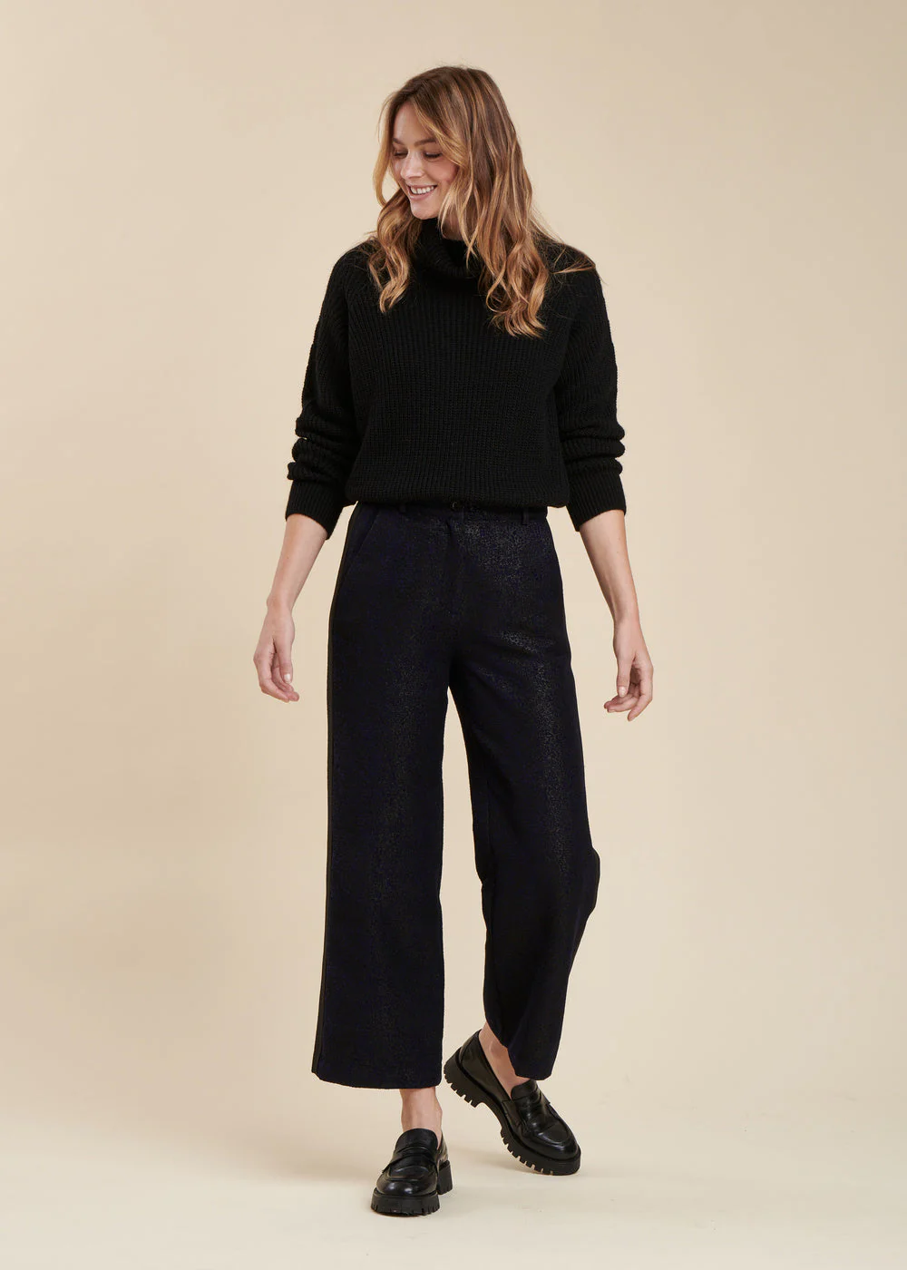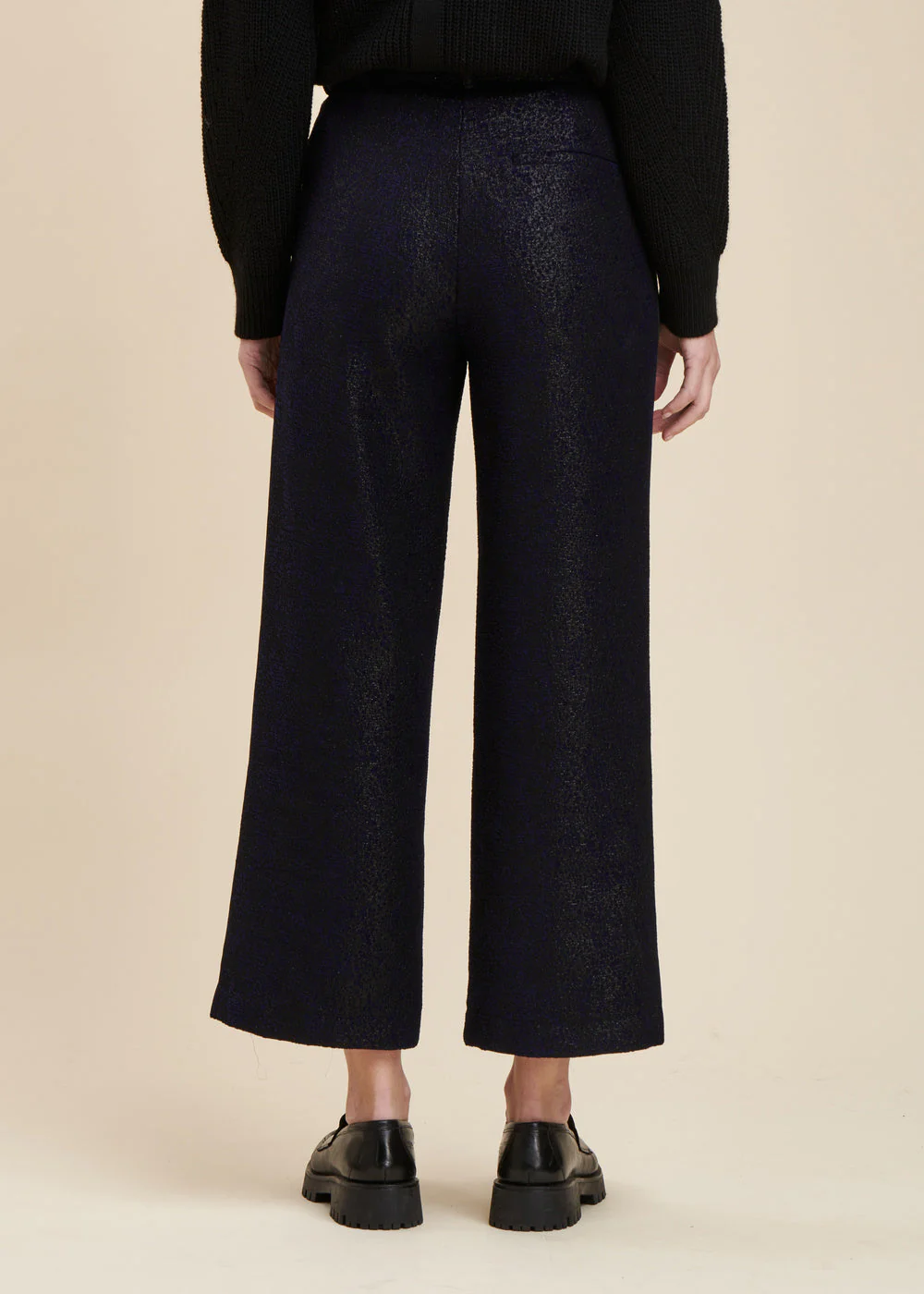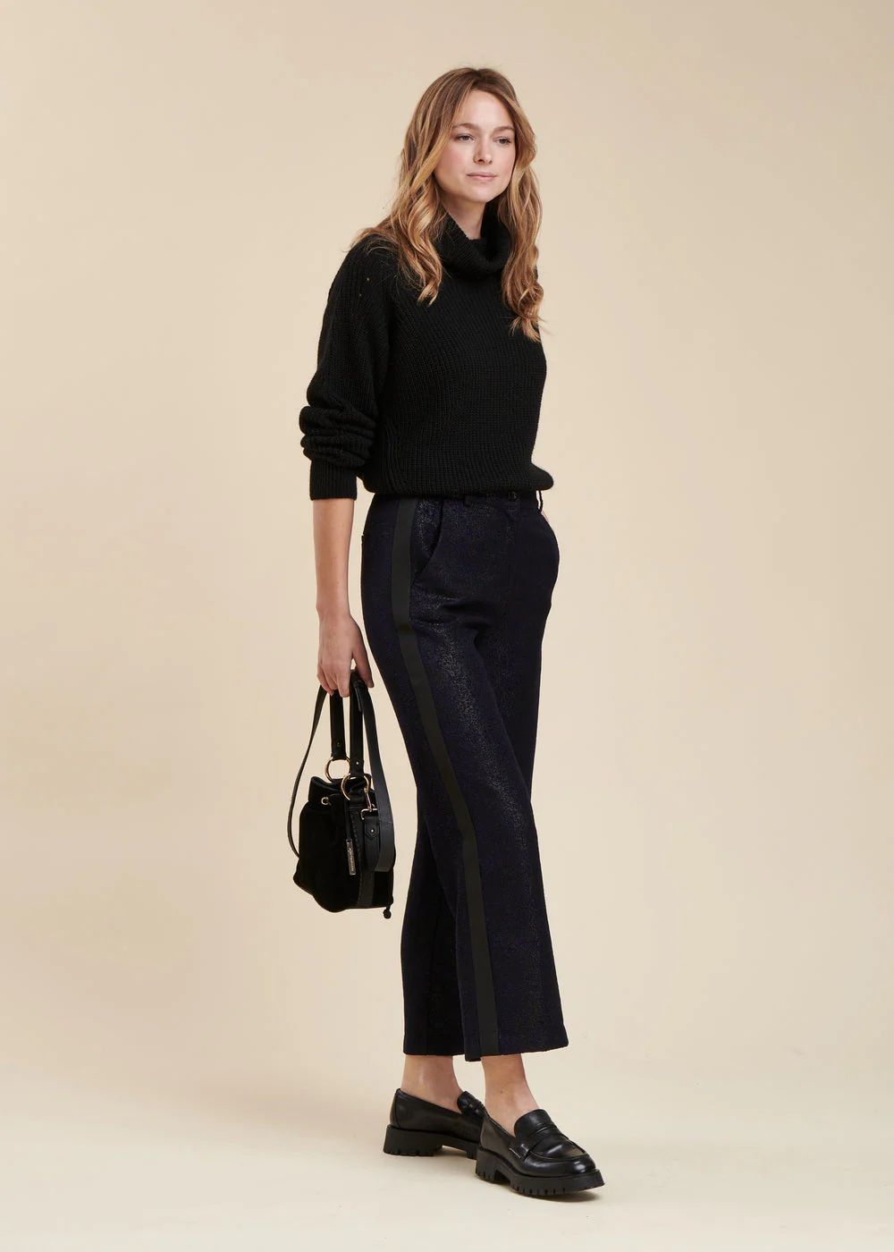 Pantalon coupe large dans un tissu jacquard, longueur 7/8ème, taille mi-haute, fermeture par un crochet et un bouton caché sous patte. Braguette zip. Poches italiennes (en biais sur les côtés).