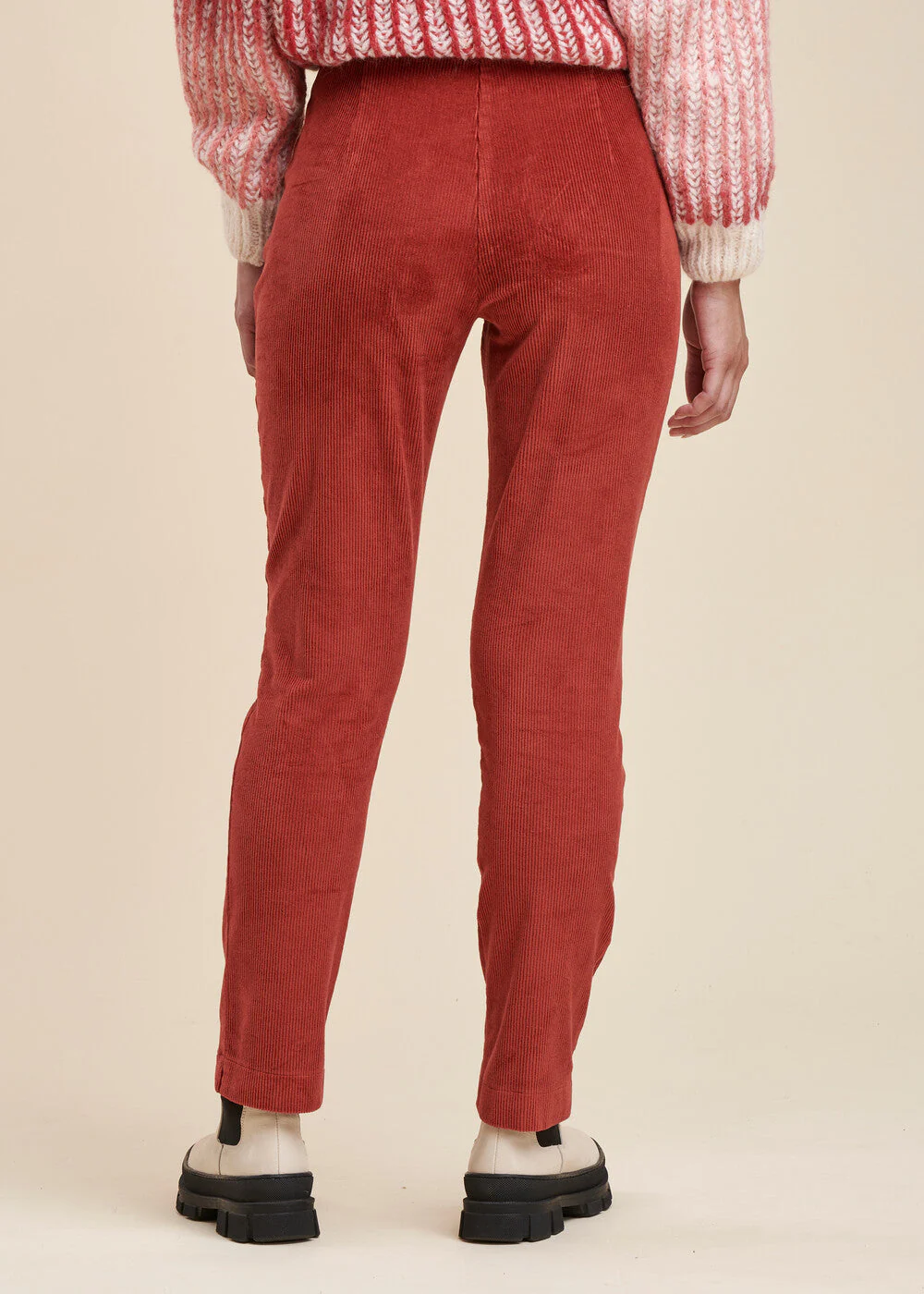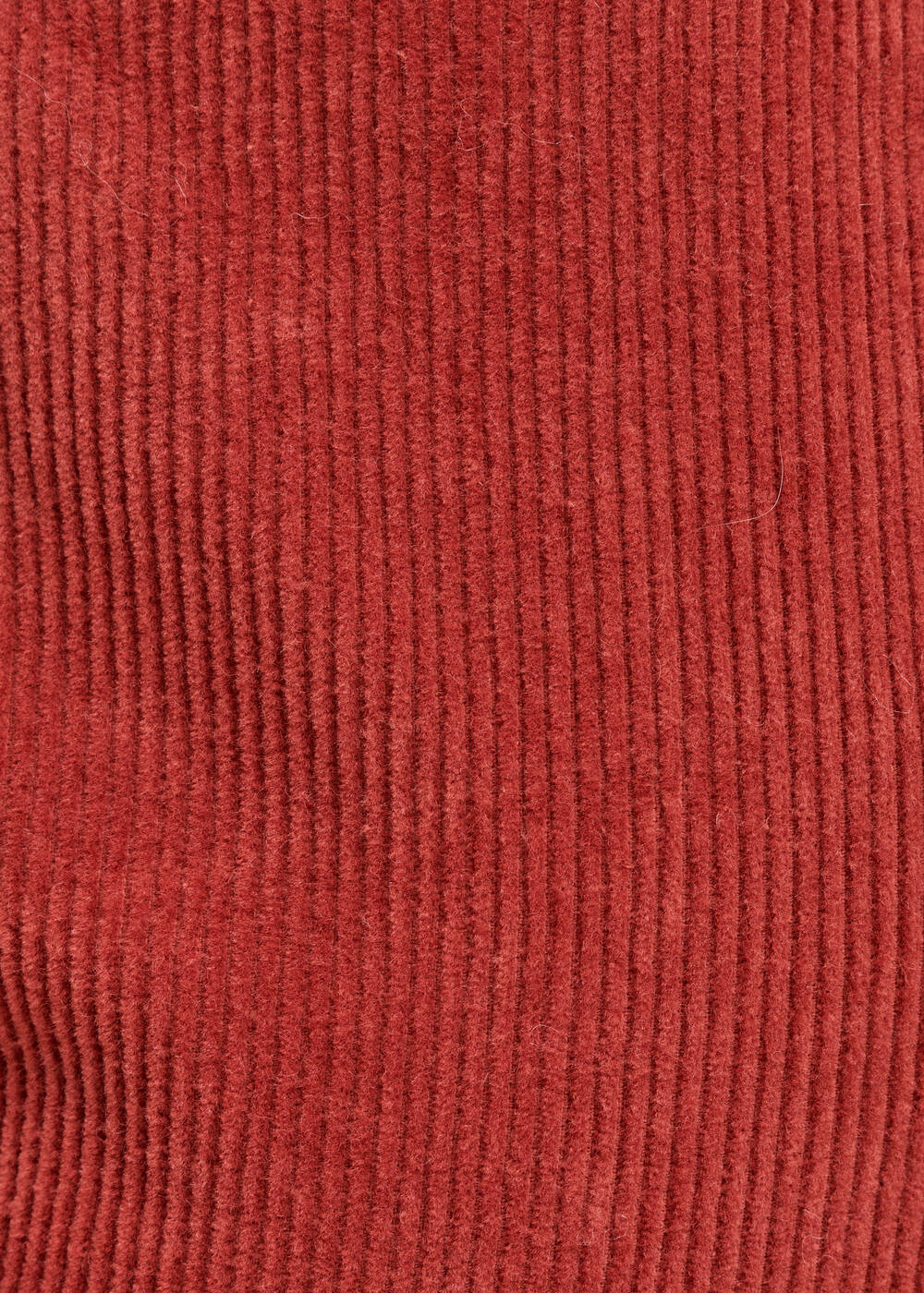 Pantalon droit en velours côtelé. Poches italiennes (en bais sur les côtés). Ouverture côté à l’aide d’un zip. Ceinture montée. Petite fente en bas de jambes.