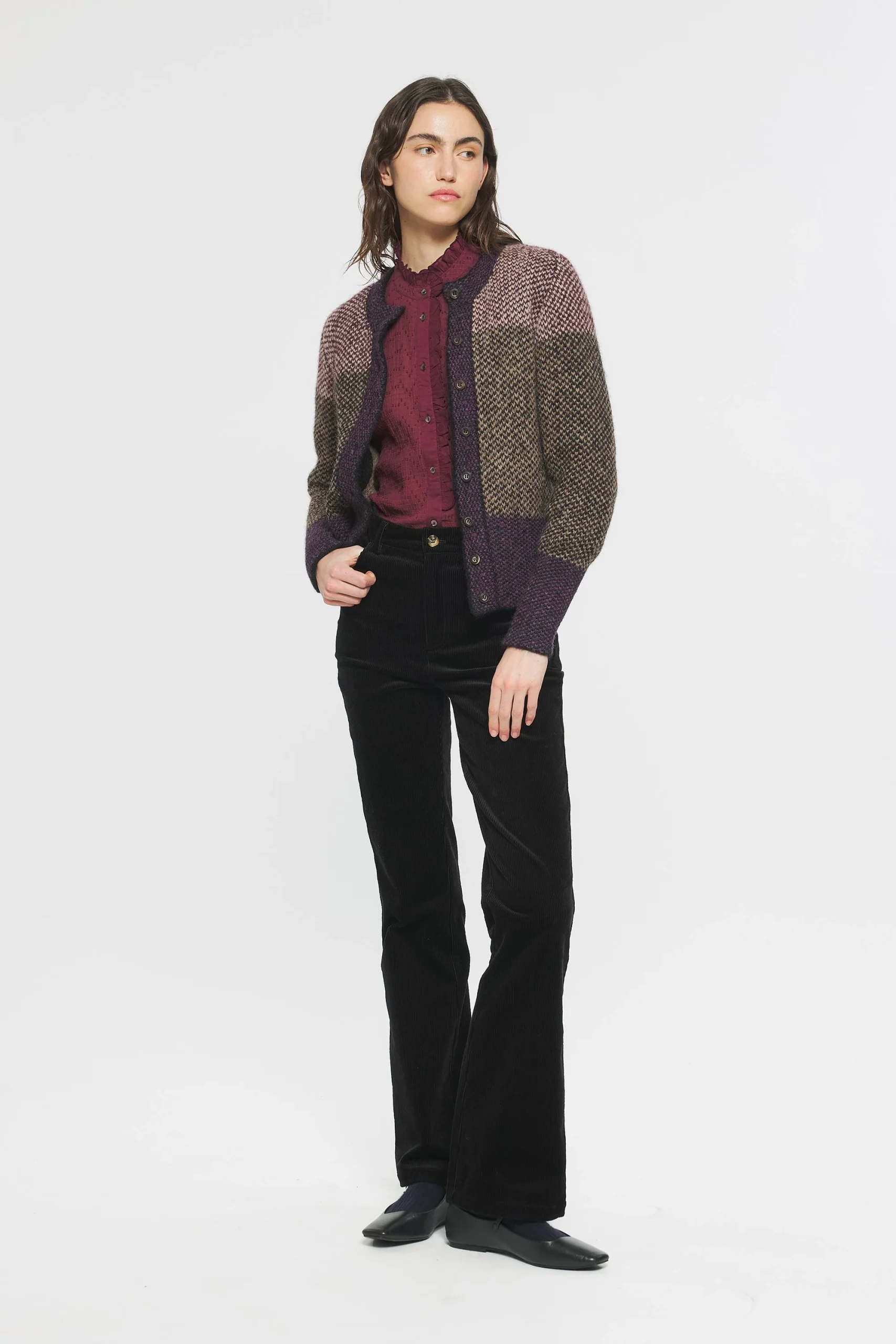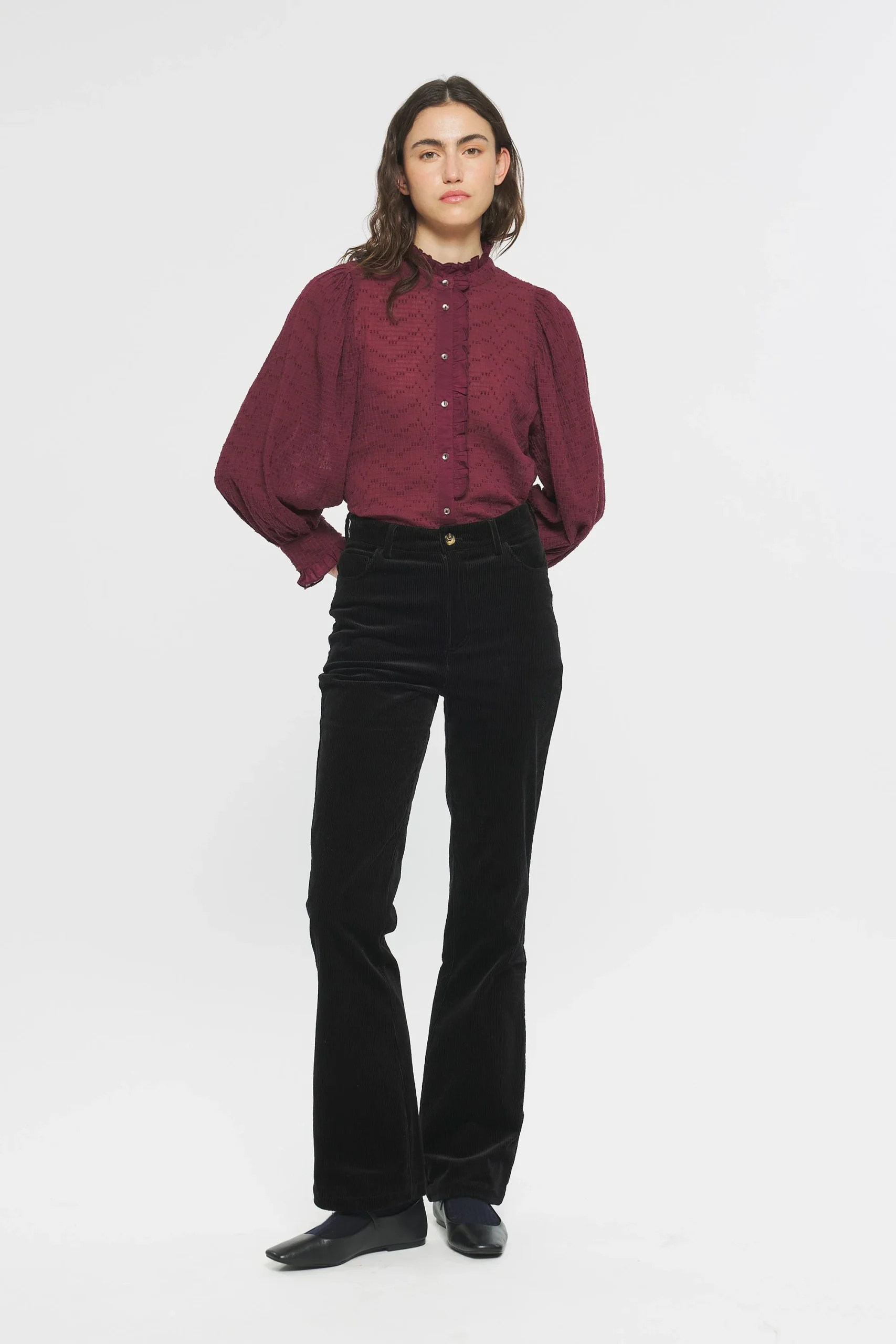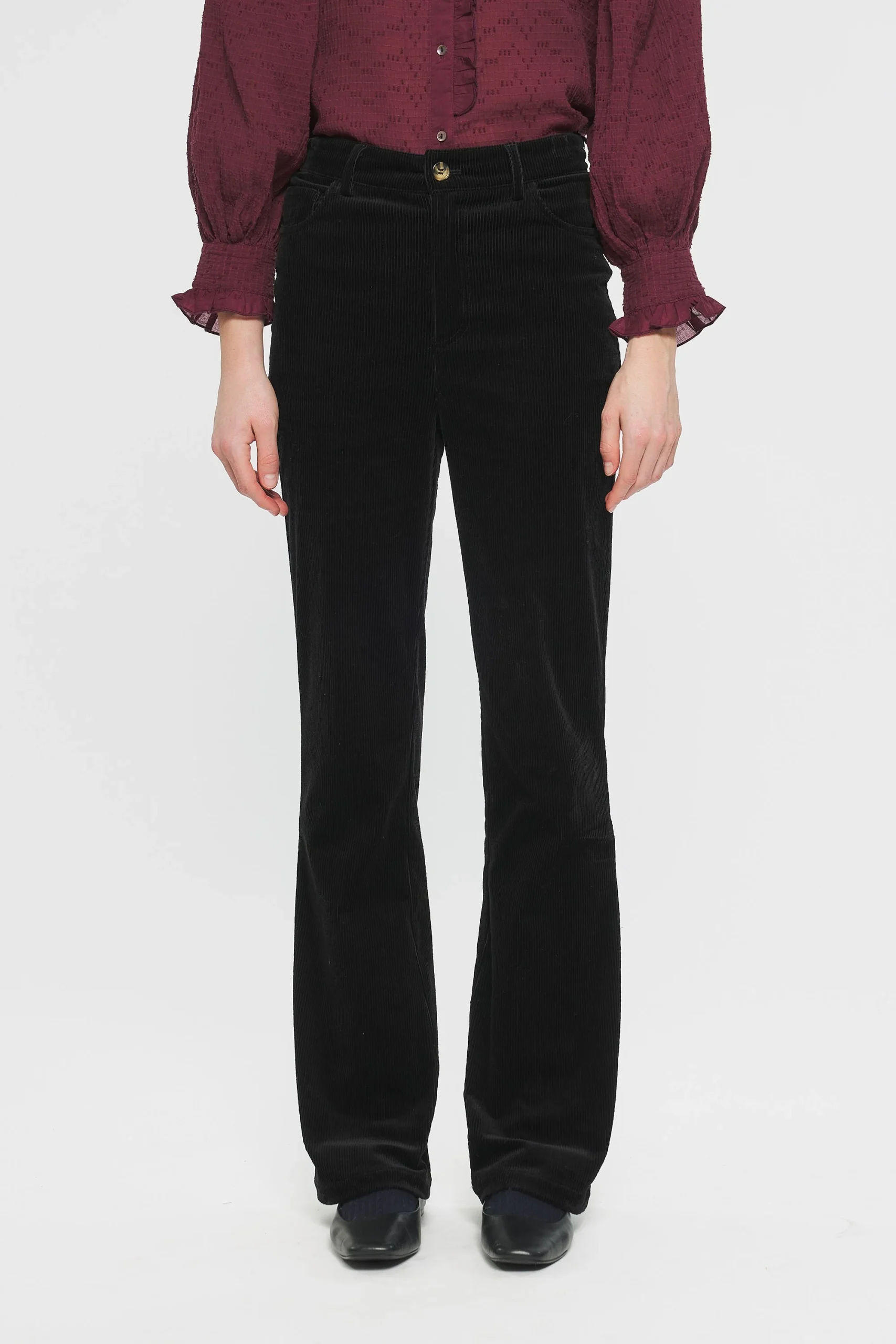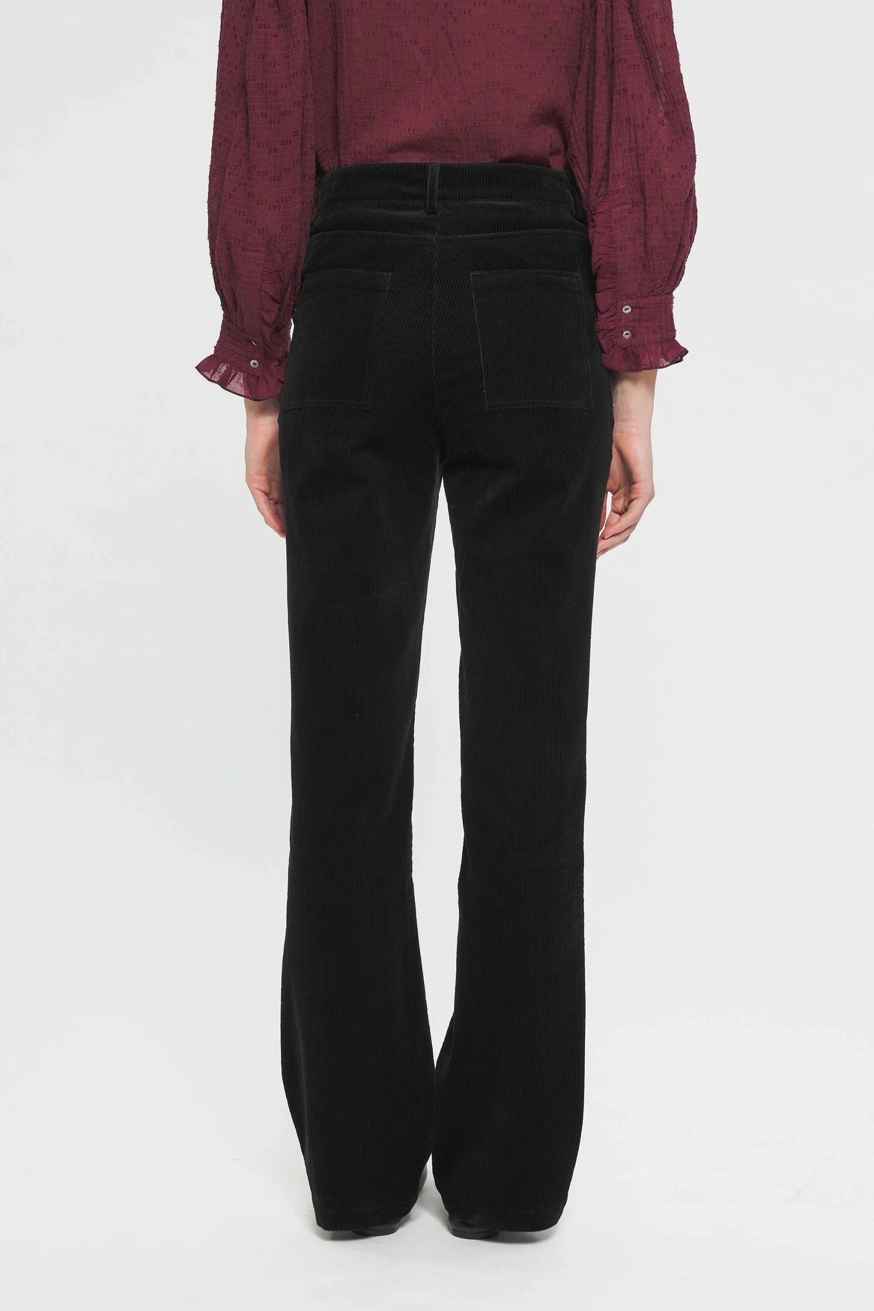 Pantalon flare en coton évasé aux chevilles. Fermeture avec un bouton et un zip sur le devant. Deux poches sur le devant et à l’arrière du pantalon. Passants pour ceinture.