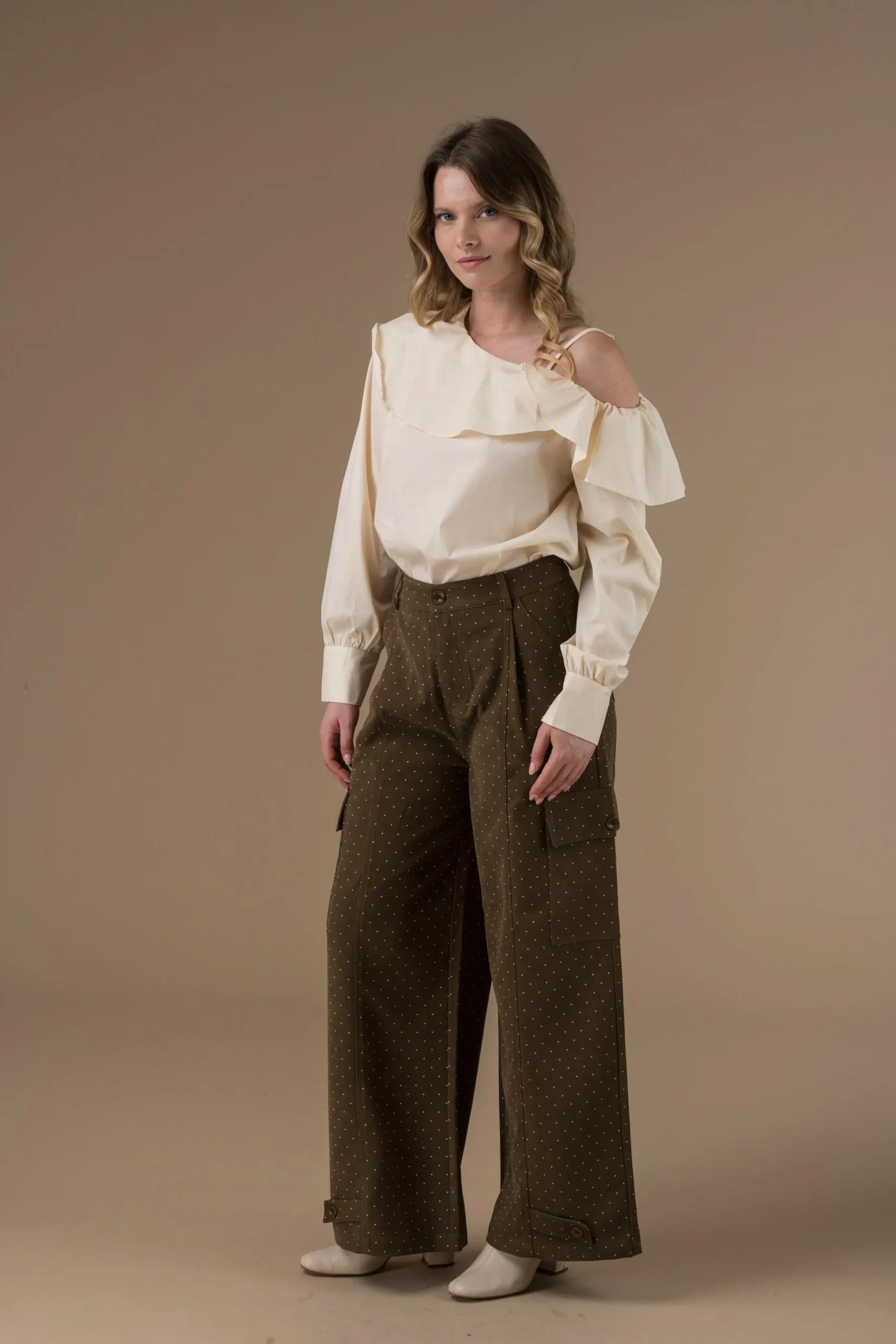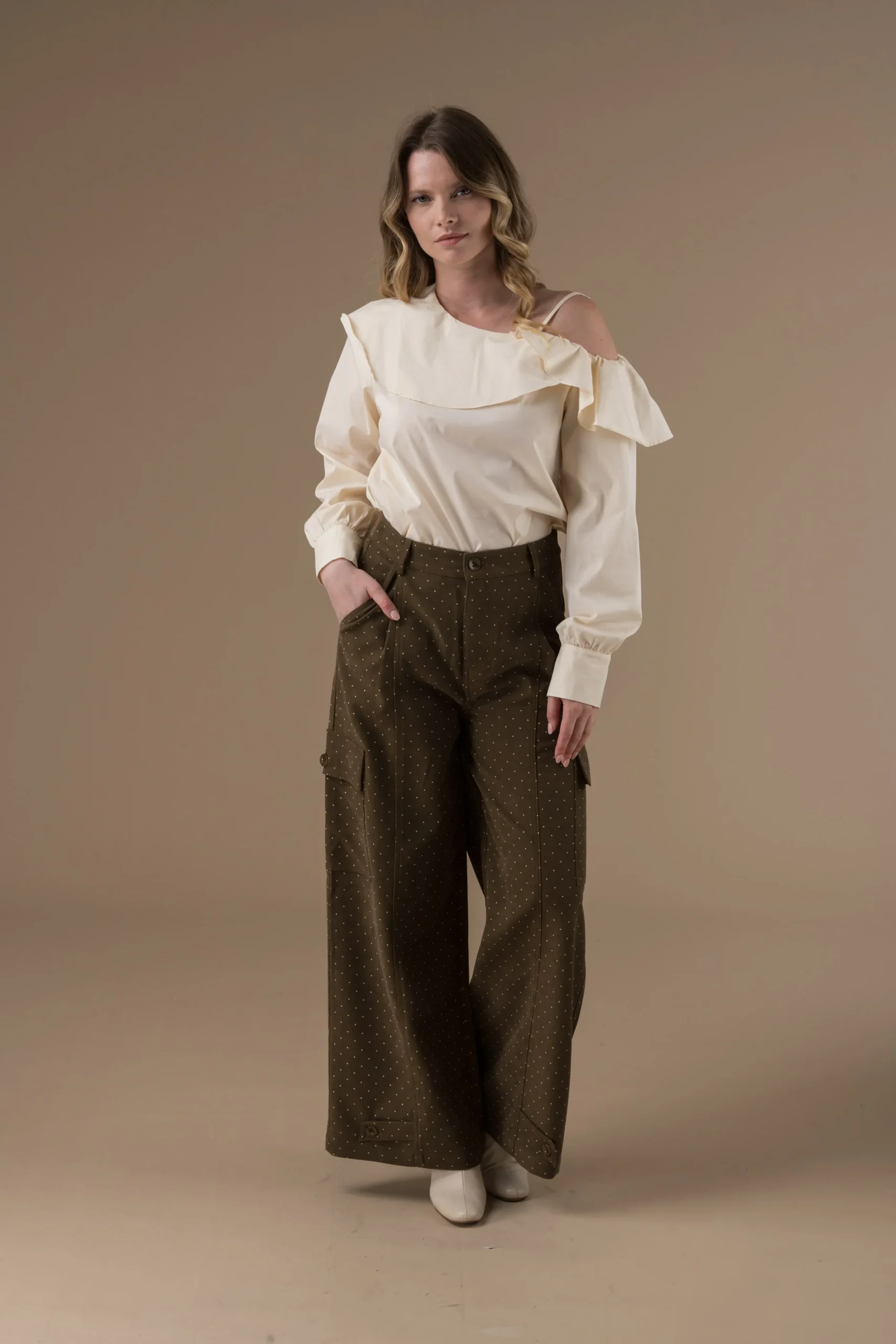 Le pantalon Gaya imprimé à petits pois se distingue par sa coupe ample et fluide, pensée pour allier confort et style. Son imprimé à petits pois subtils ajoute une touche raffinée et contemporaine à ce modèle facile à porter au quotidien. Ses poches latérales sont pratiques et modernes. Disponible en kaki et bordeaux.