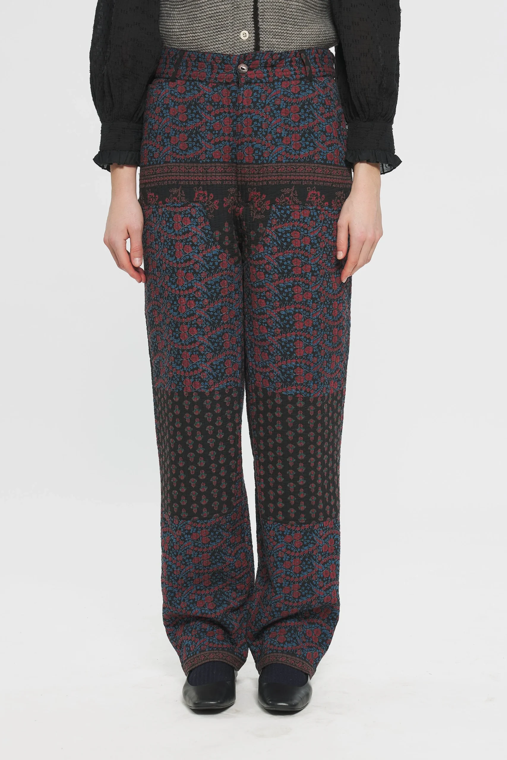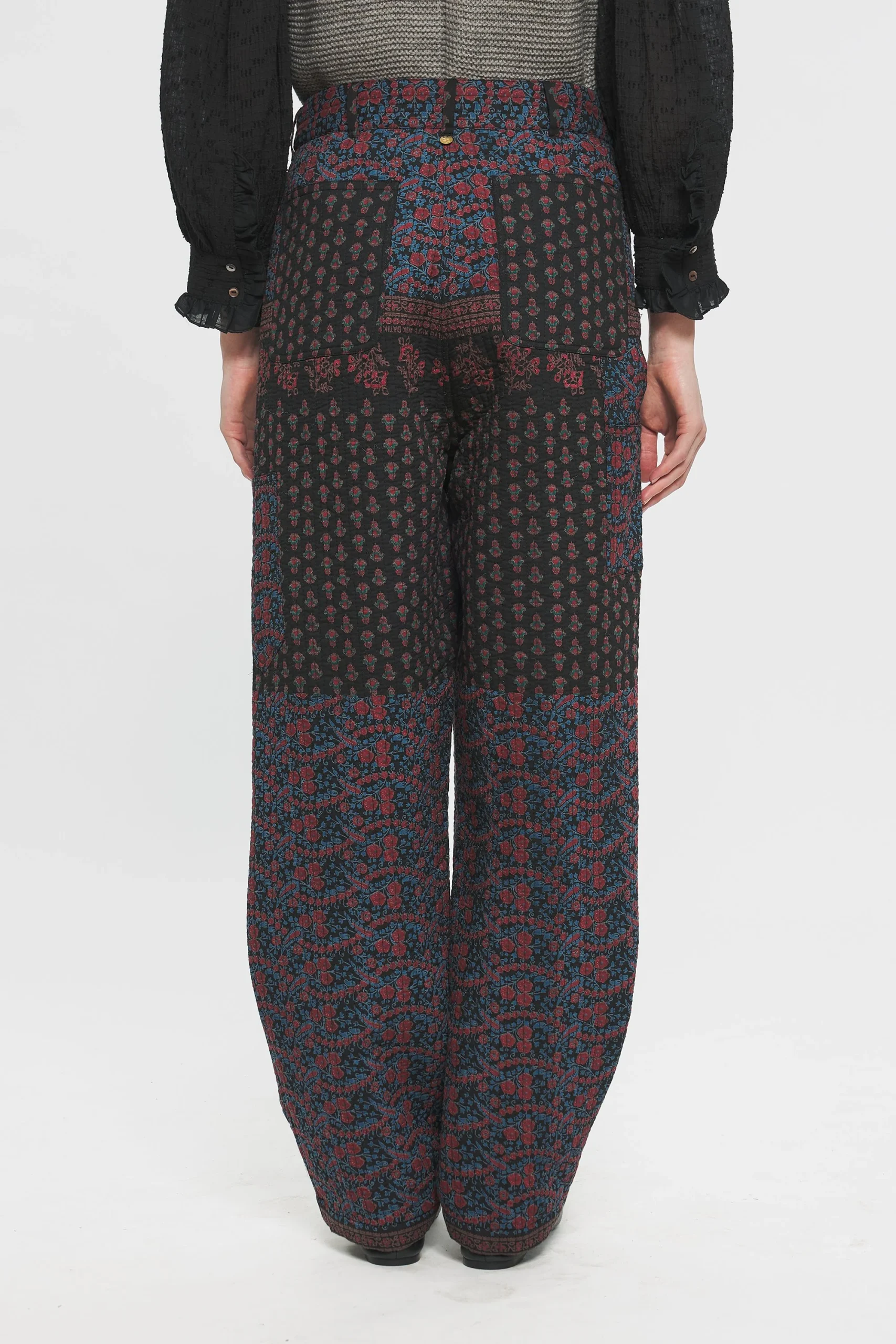 Pantalon en jacquard de coton doublé et quilté. Deux grandes poches sur le devant et le derrière du pantalon. Fermeture éclair et boutonnée.