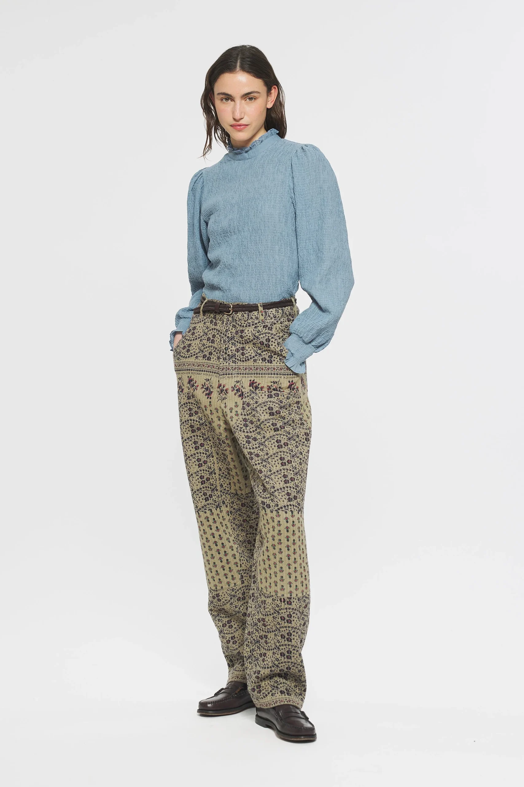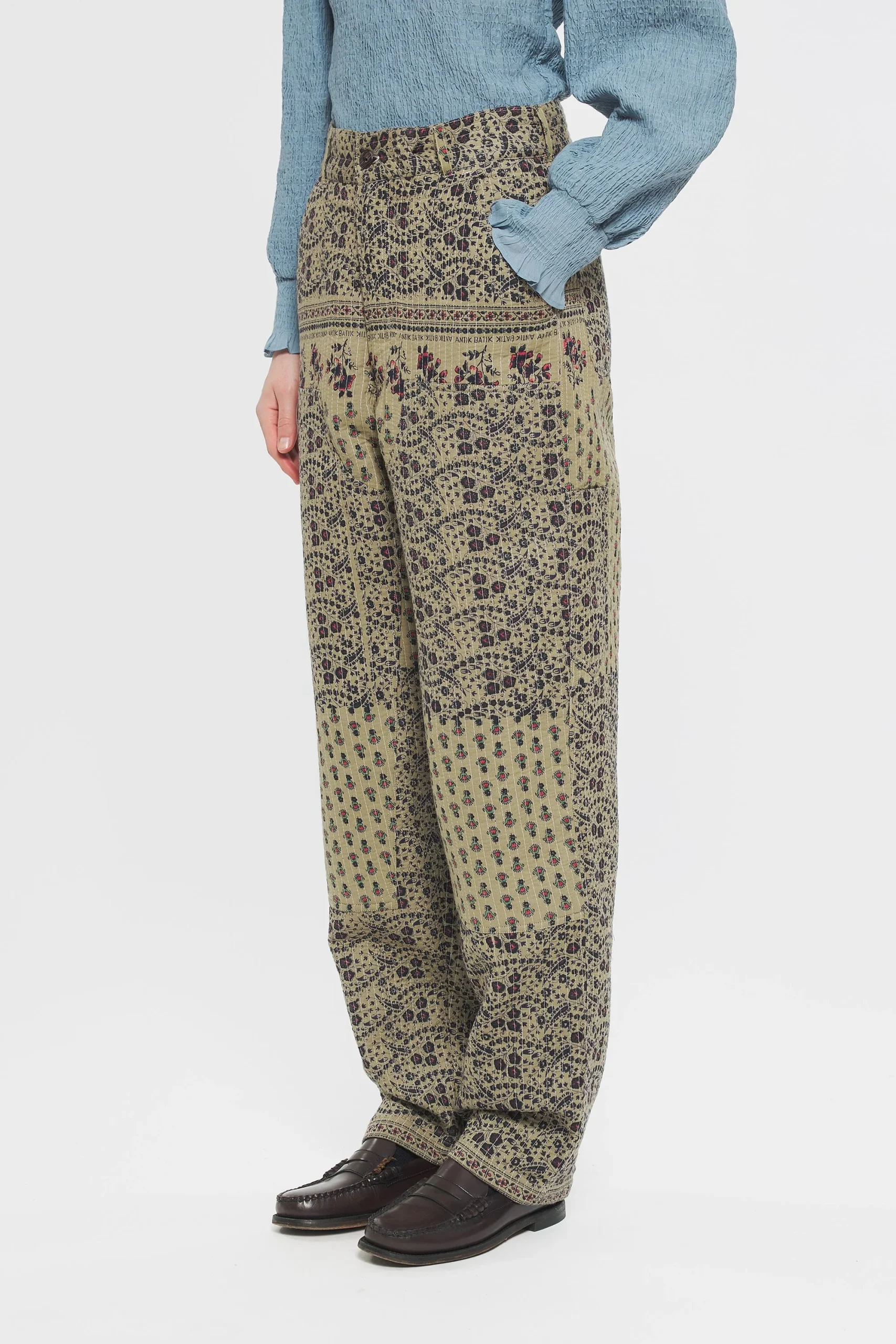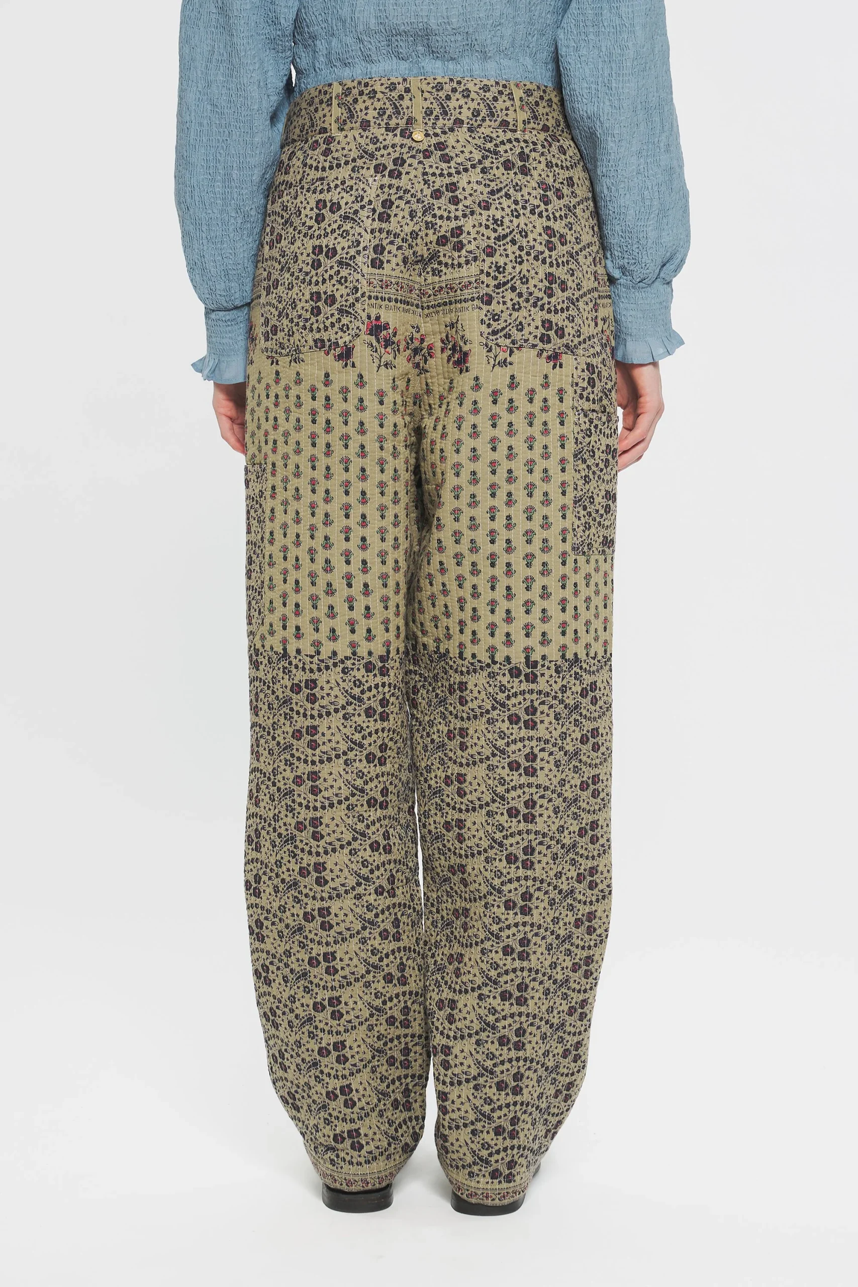 Pantalon en jacquard de coton doublé et quilté. Deux grandes poches sur le devant et le derrière du pantalon. Fermeture éclair et boutonnée.