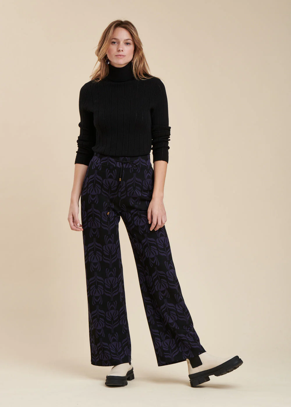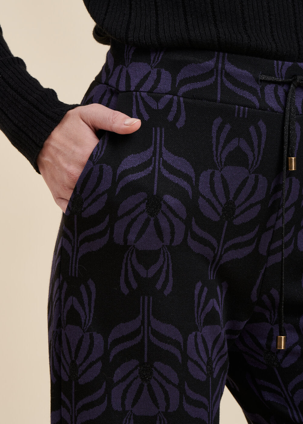 Pantalon en jersey motif floral discret, coupe large, taille élastiquée avec un lien de serrage.
