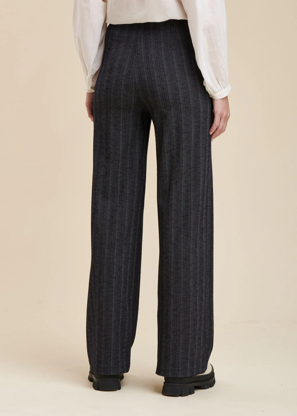 Pantalon en jersey rayures discrètes, coupe large, taille élastiquée. Modèle extrêmement confortable.