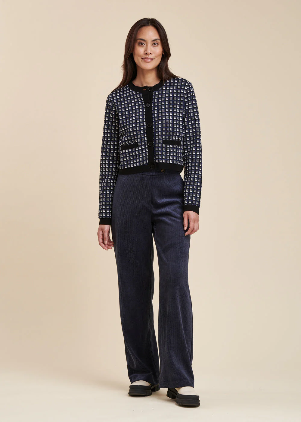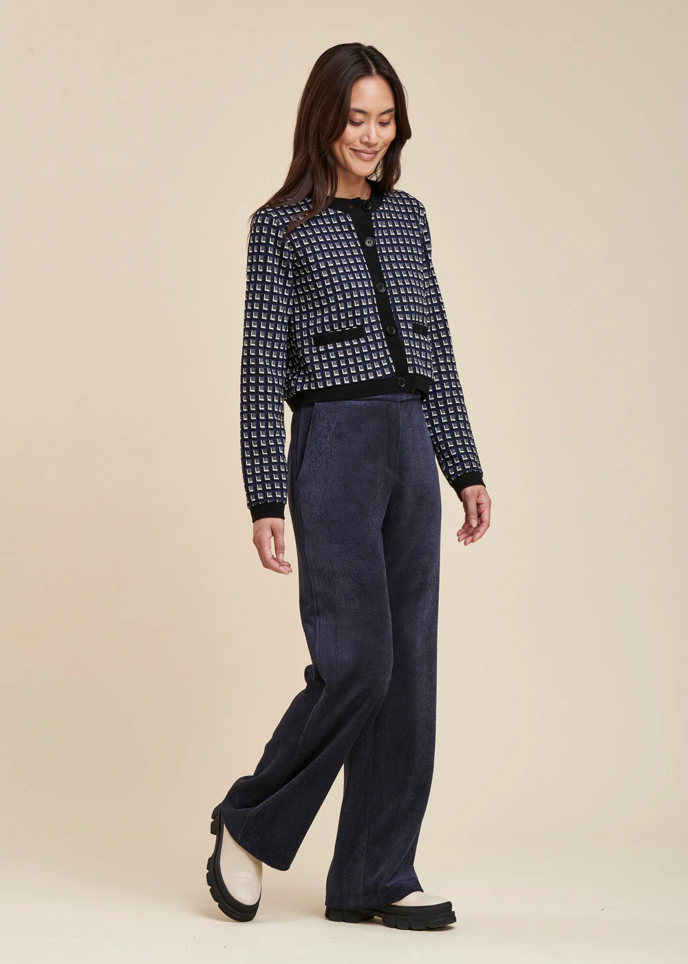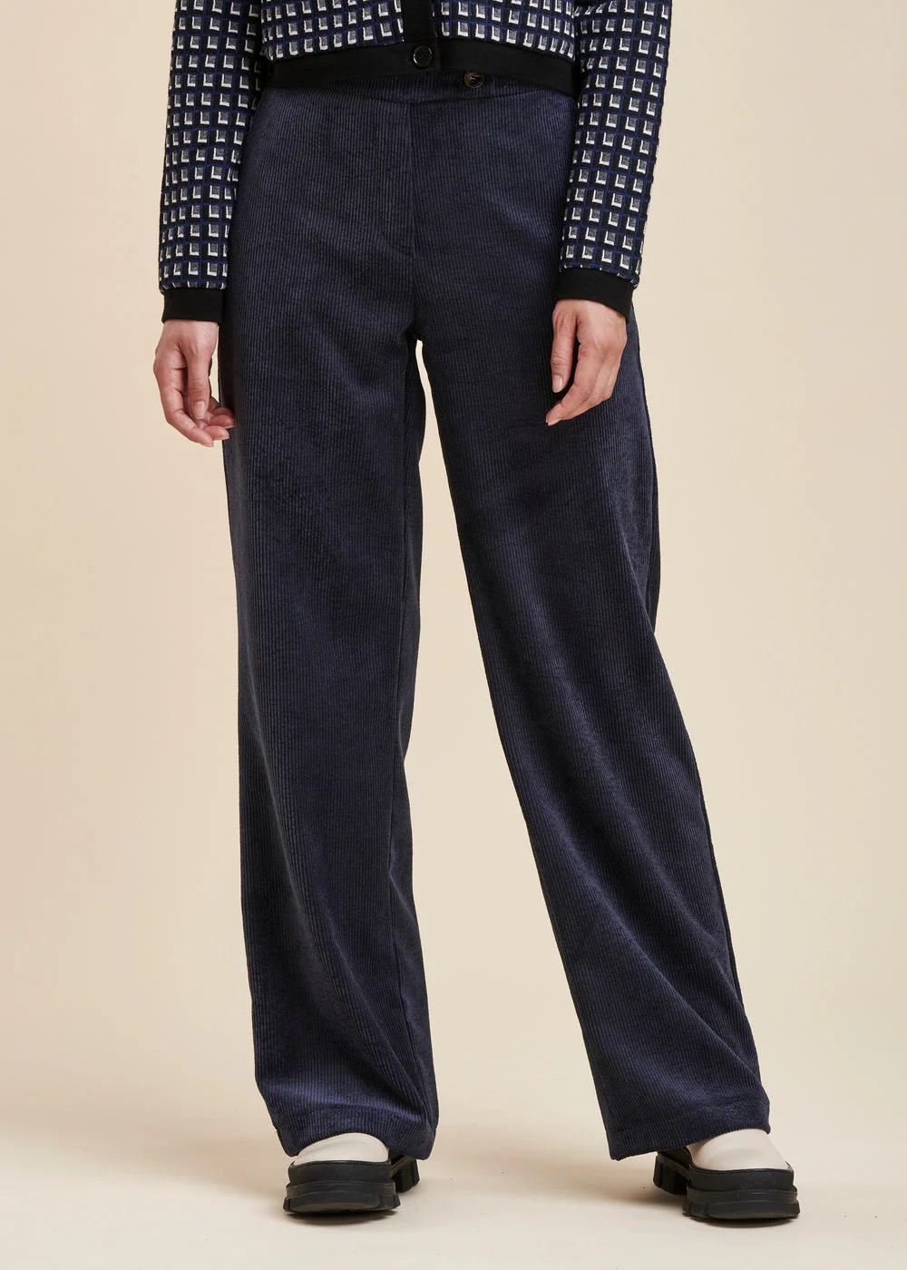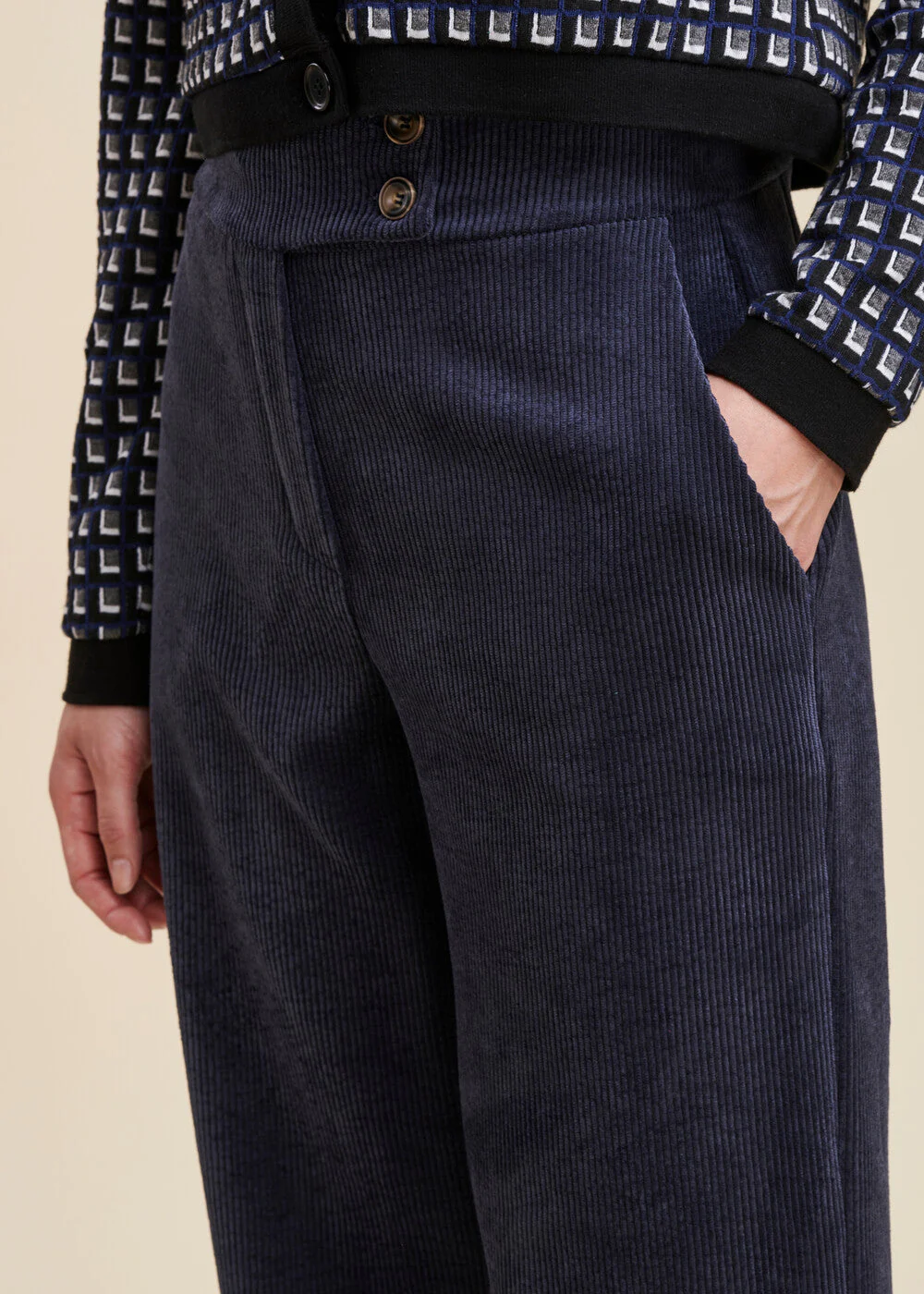 Pantalon en velours souple, coupe large, poches italiennes, fermeture asymétrique par deux boutons.