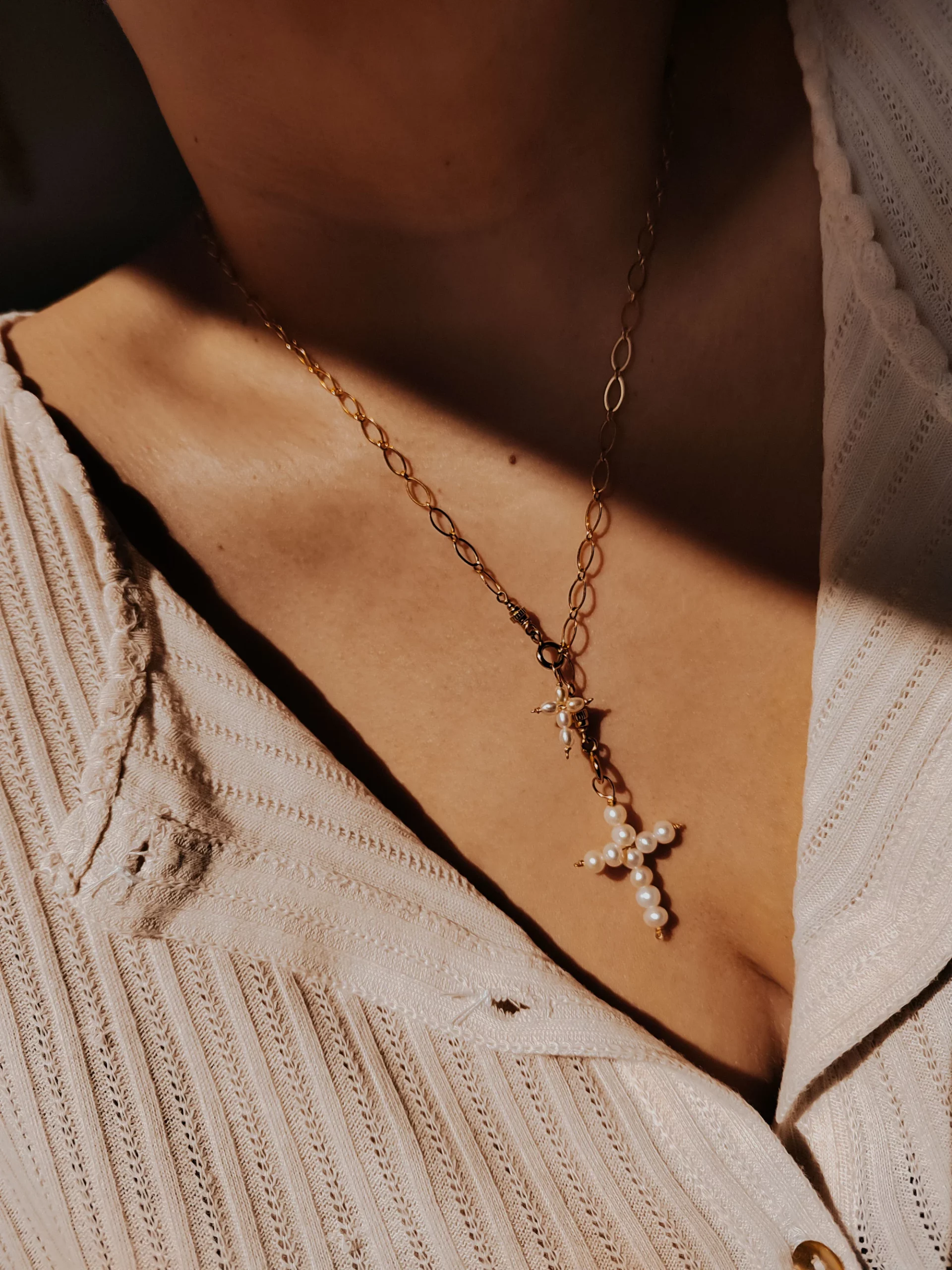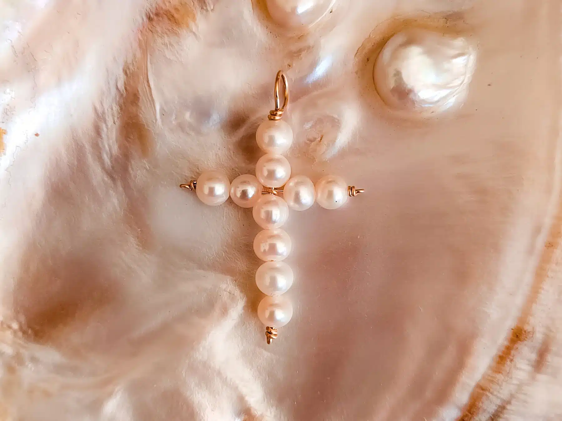 Pendentif en forme de croix, composé de perles d’eau douce et de fil gold filled.
