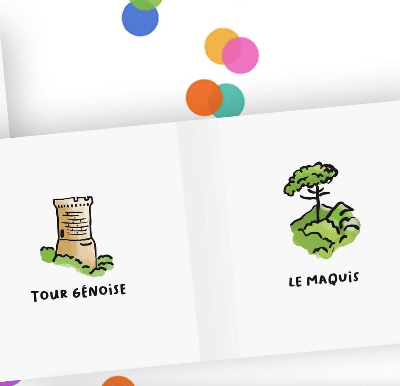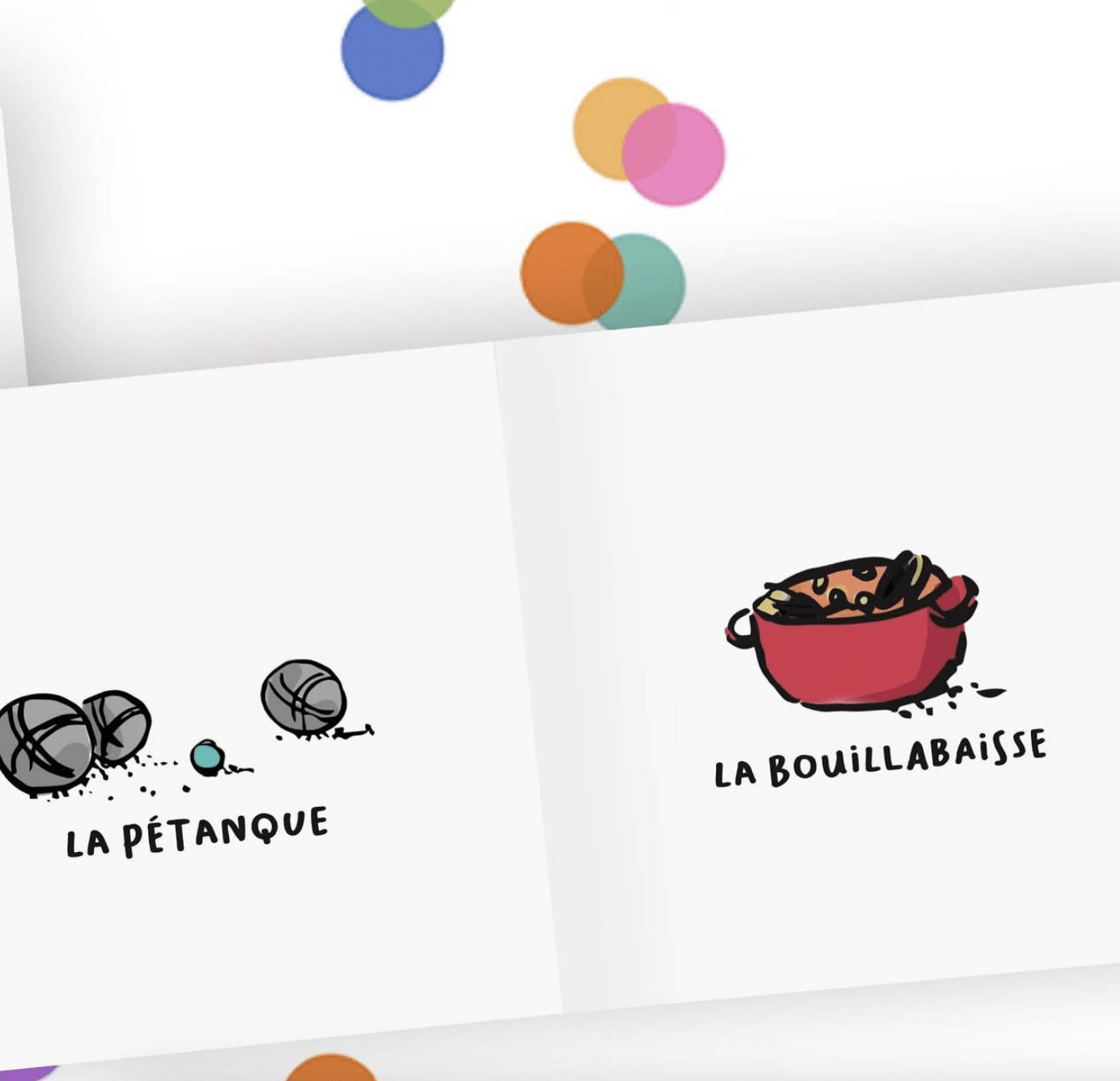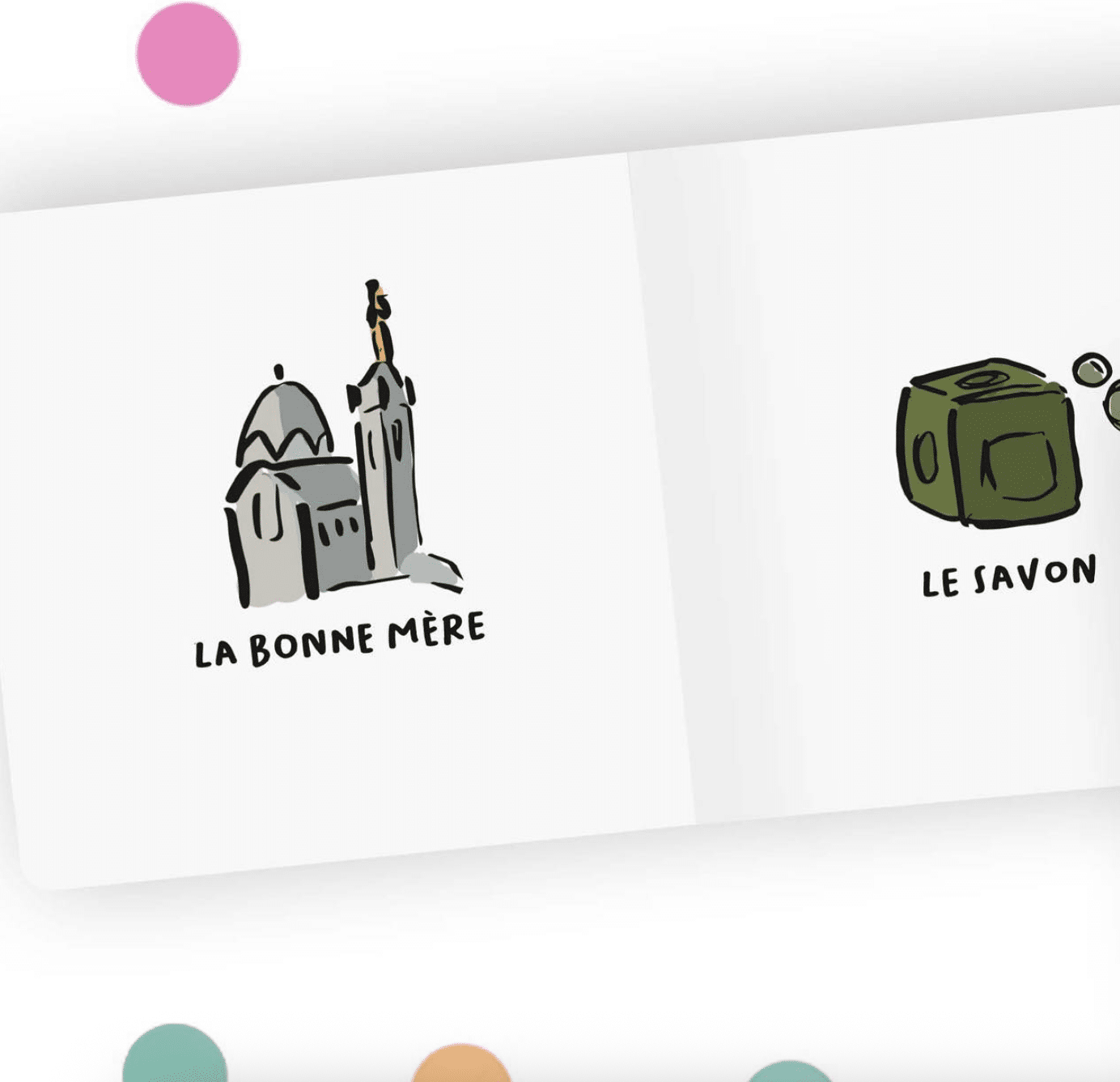 Les 21 illustrations sont ludiques, minimalistes et colorées. Elles sont accompagnées d’un mot décrivant l’image.
