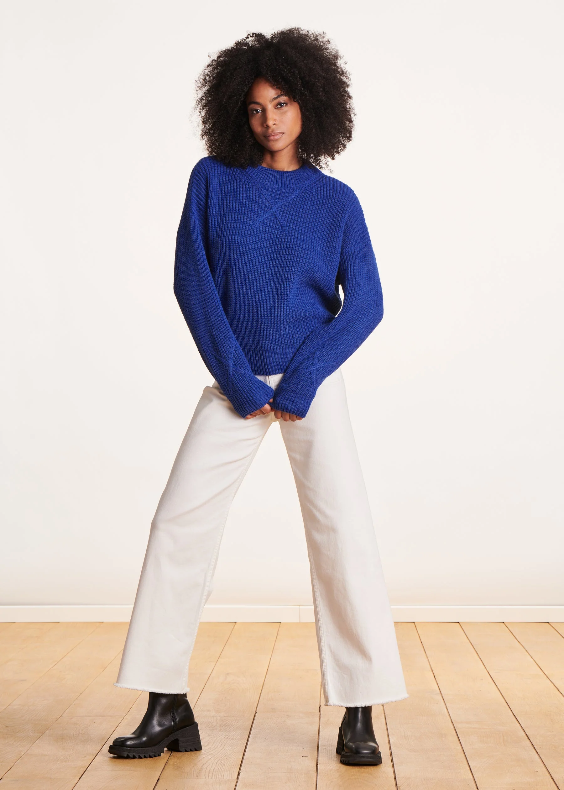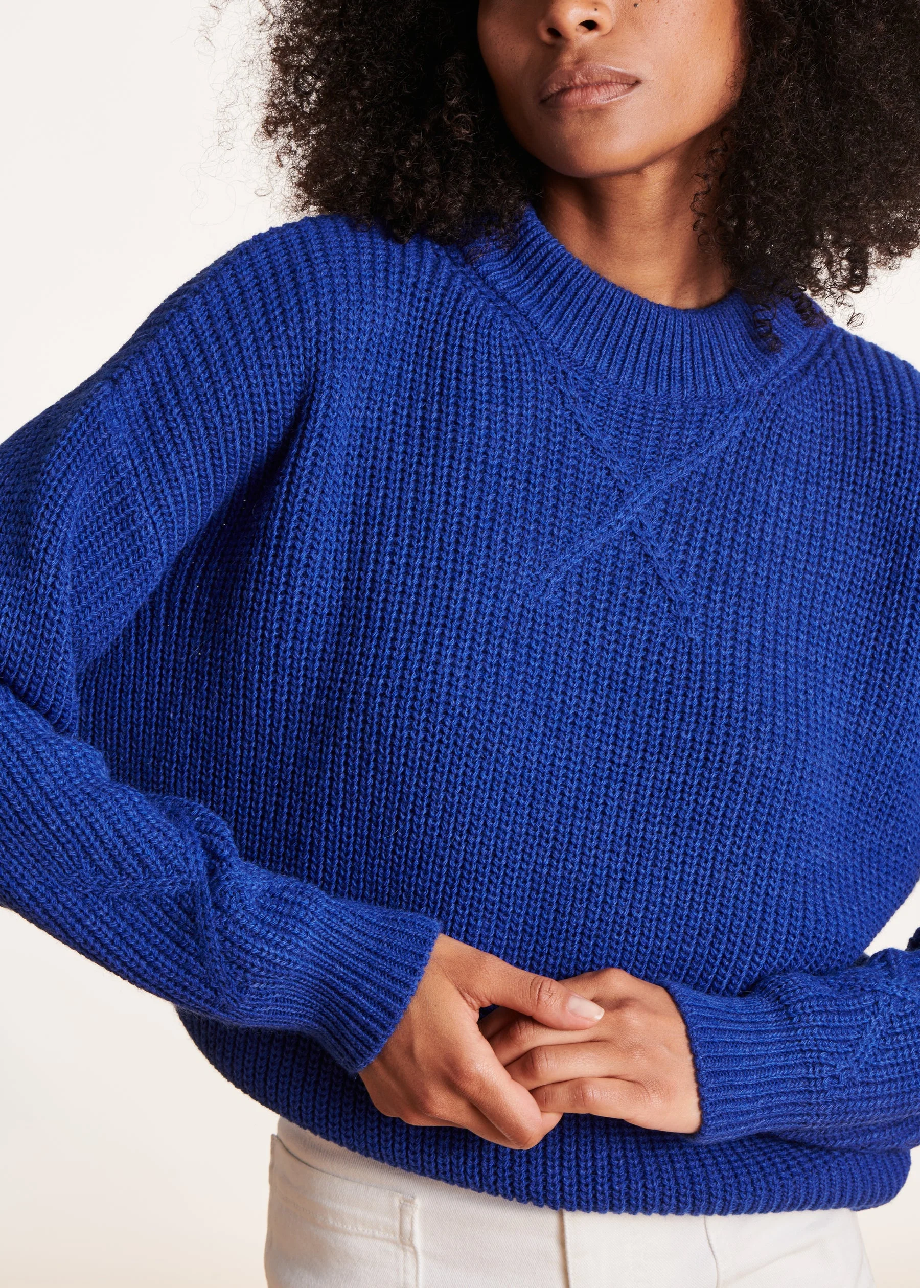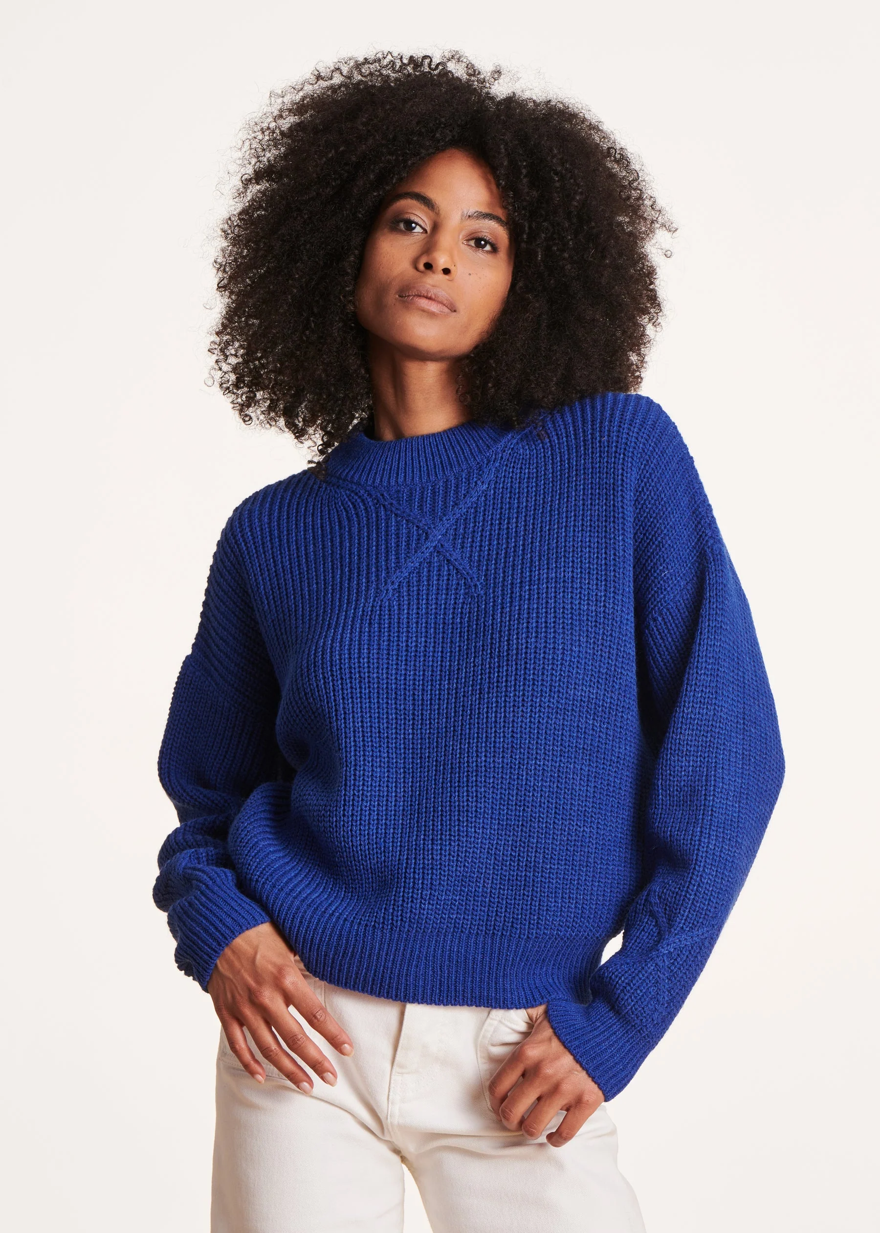 Soyez le premier à laisser votre avis sur “Pull bleu à col montant en maille côtes perlées”
