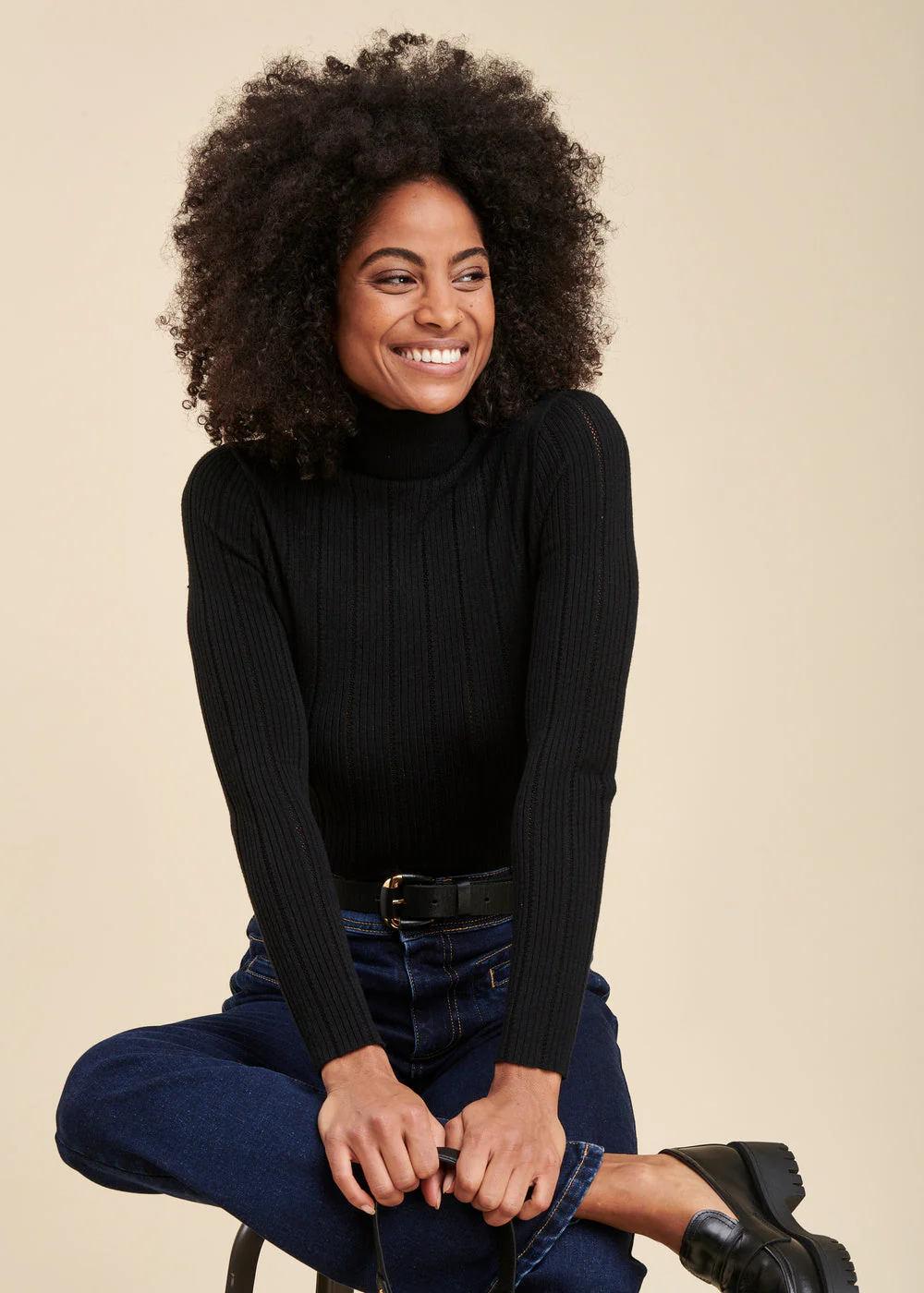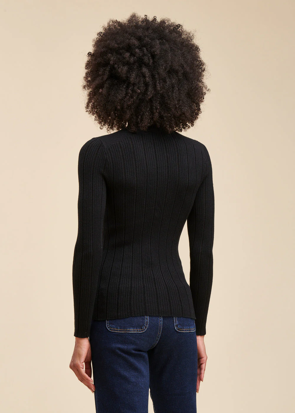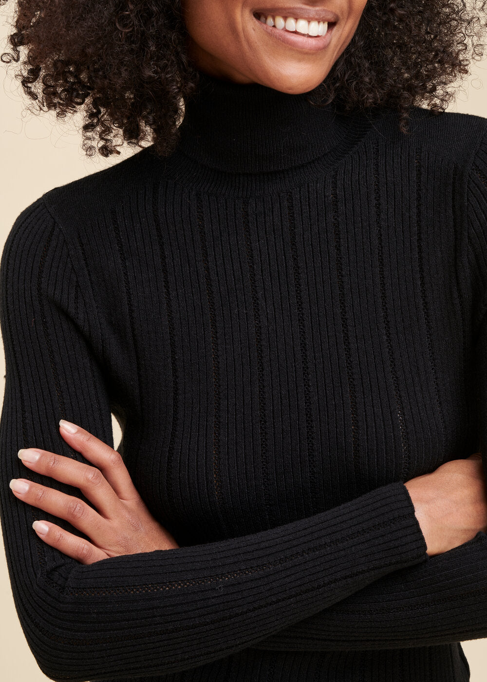 Pull chaussette col roulé en maille à côtes fantaisie, manches longues.