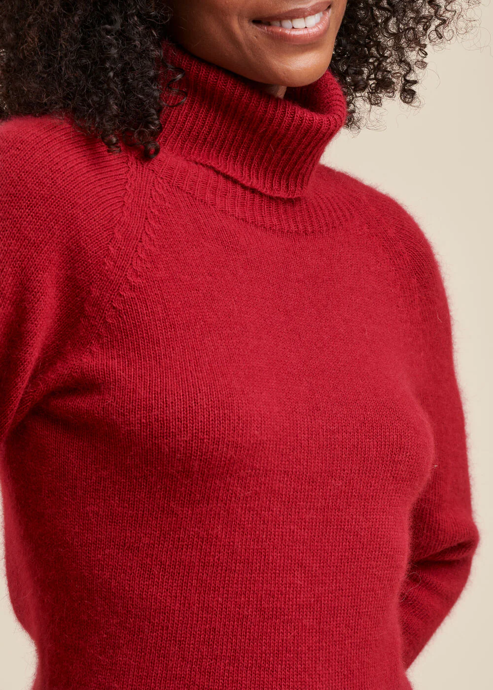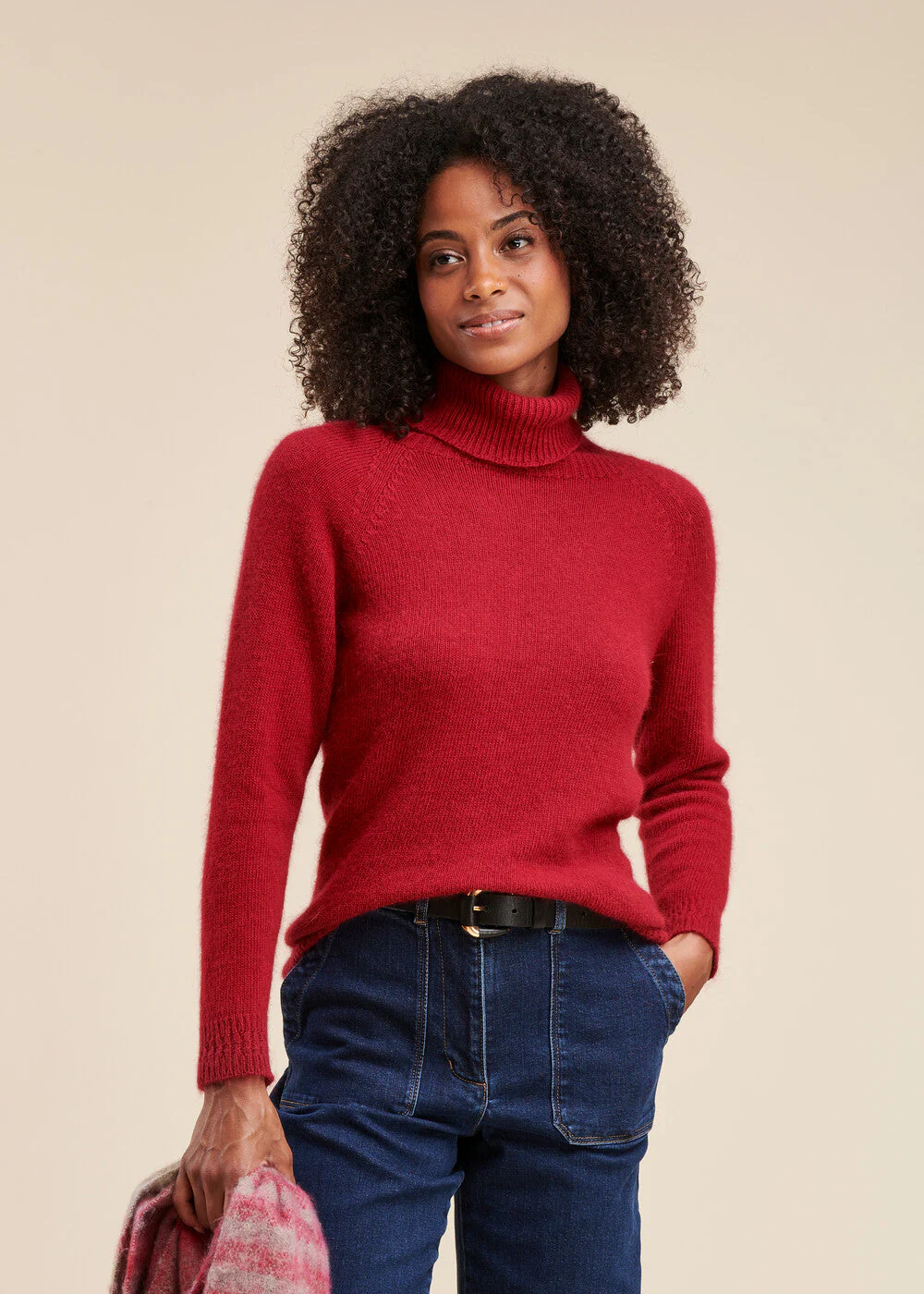 Pull en maille angora, col roulé très enveloppant, bas de manche et bas de corps en bord-côte.