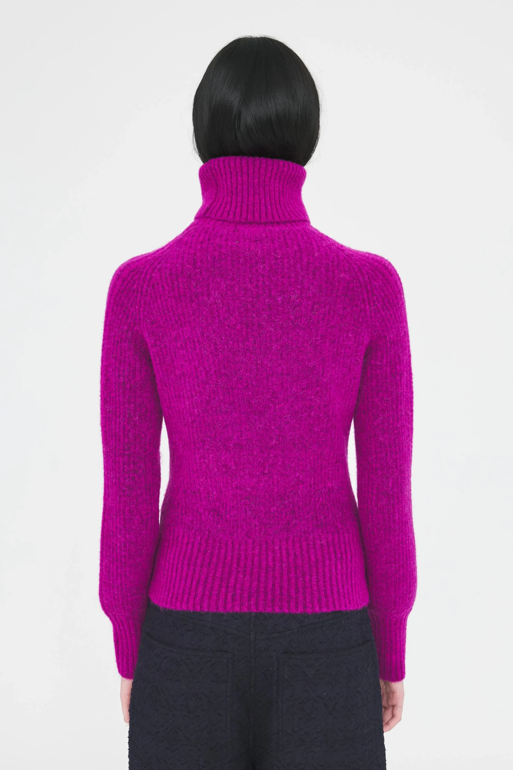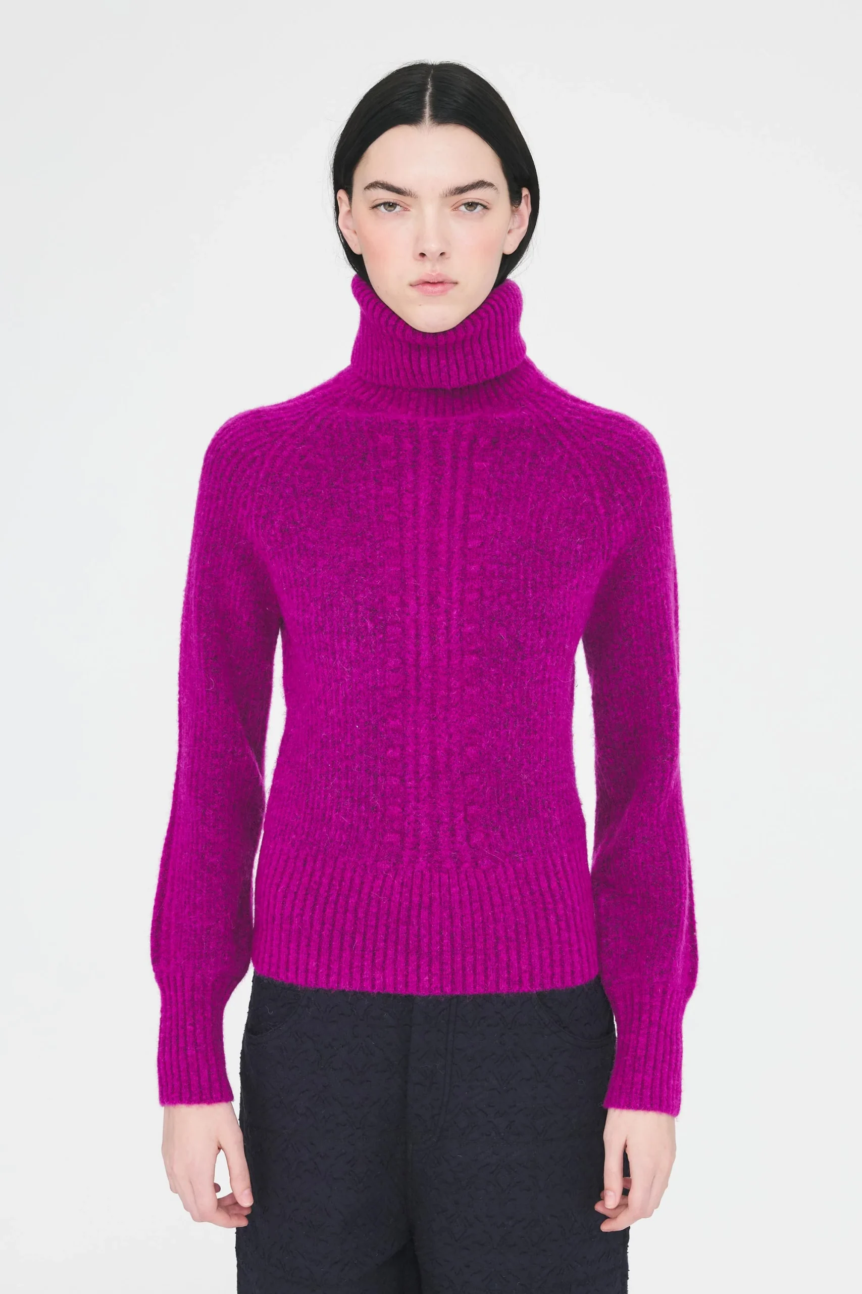 Pull tricoté en laine et alpaga. Coupe droite cintrée. Manches longues. Col roulé.