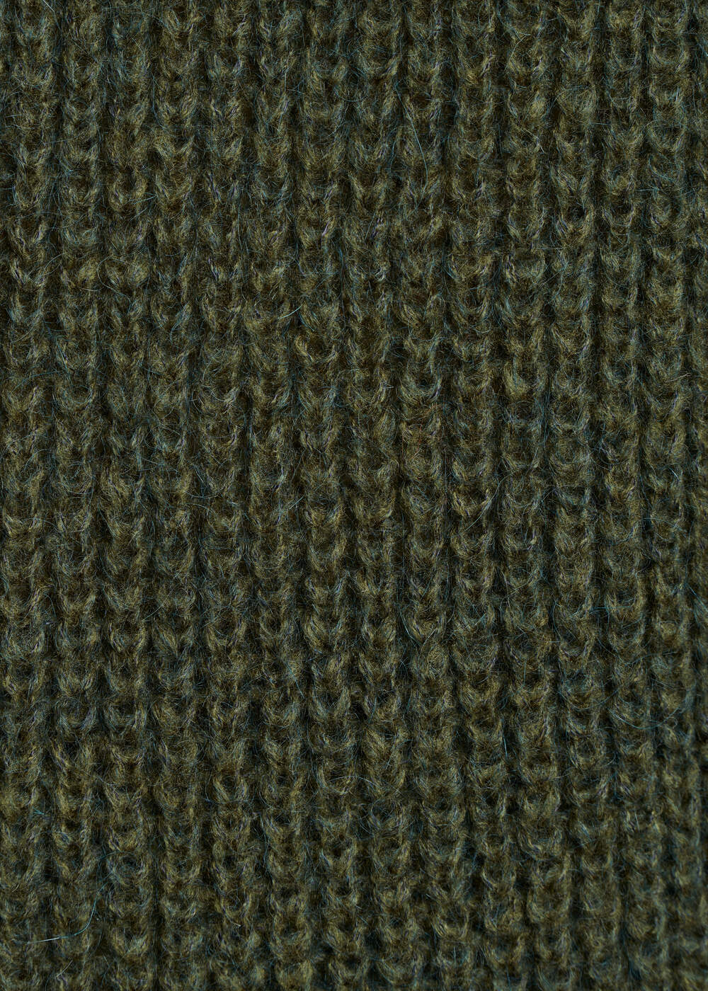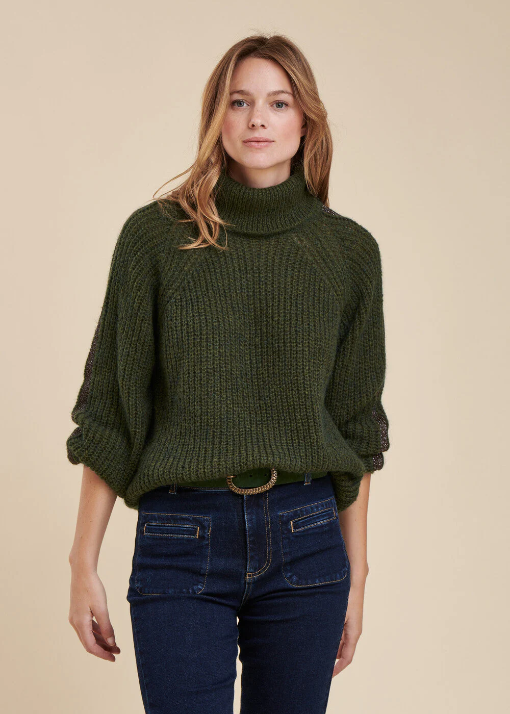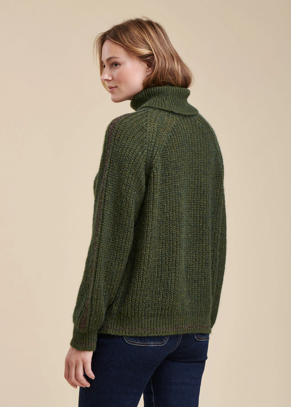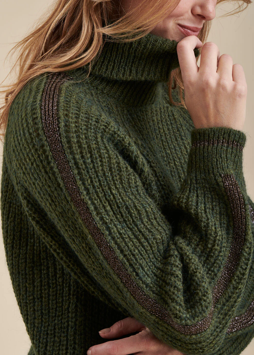 Pull col boule, emmanchures raglan, coupe généreuse. Maille côtes perlées et détails de maille irisée sur les manches.