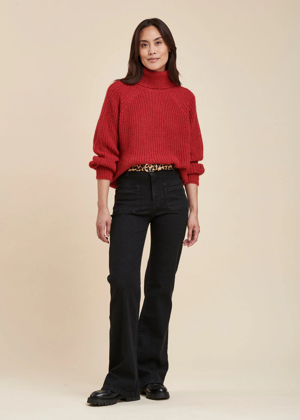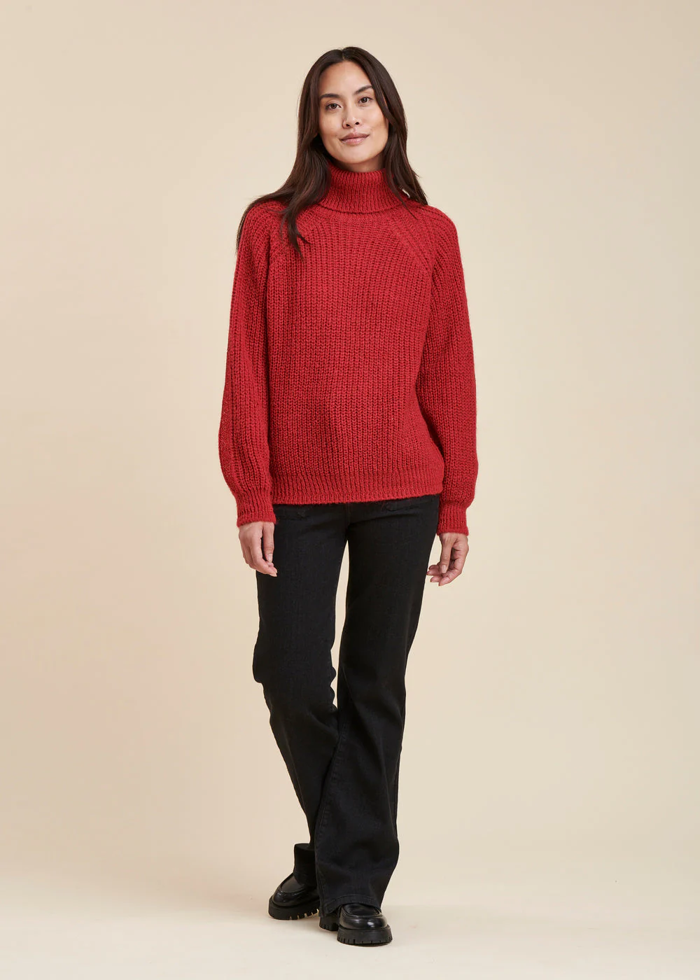 Pull col boule, emmanchures raglan, coupe généreuse. Maille côtes perlées et détails de maille irisée sur les manches.