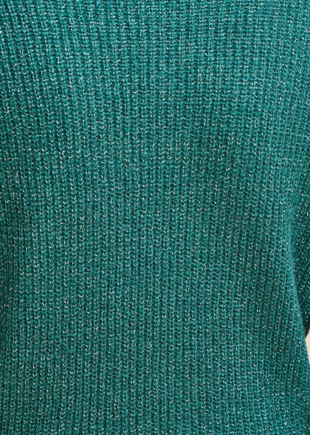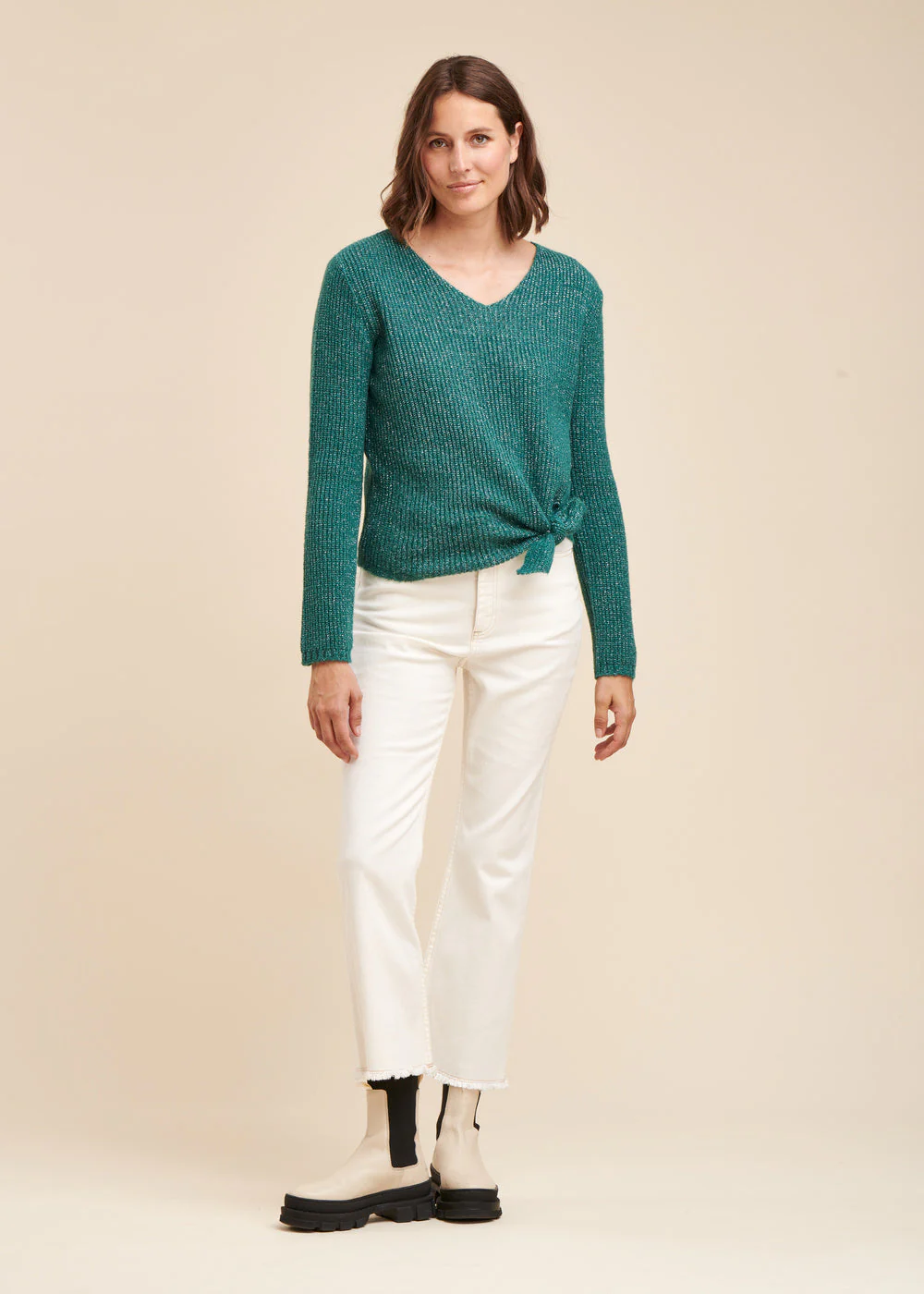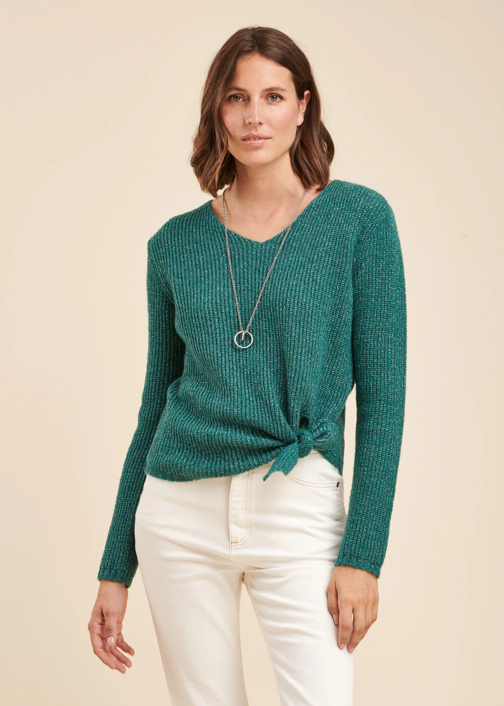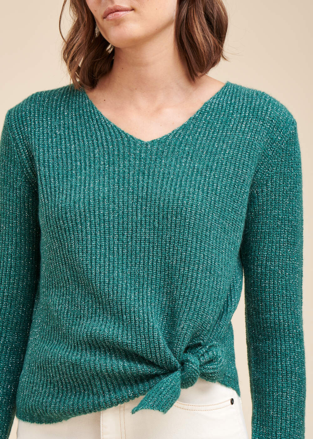 Pull court en maille côtes perlées irisées, coupe droite, manches longues légèrement évasées, encolure en V arrondi, nœud côté. Idéal à porter avec un pantalon taille haute.