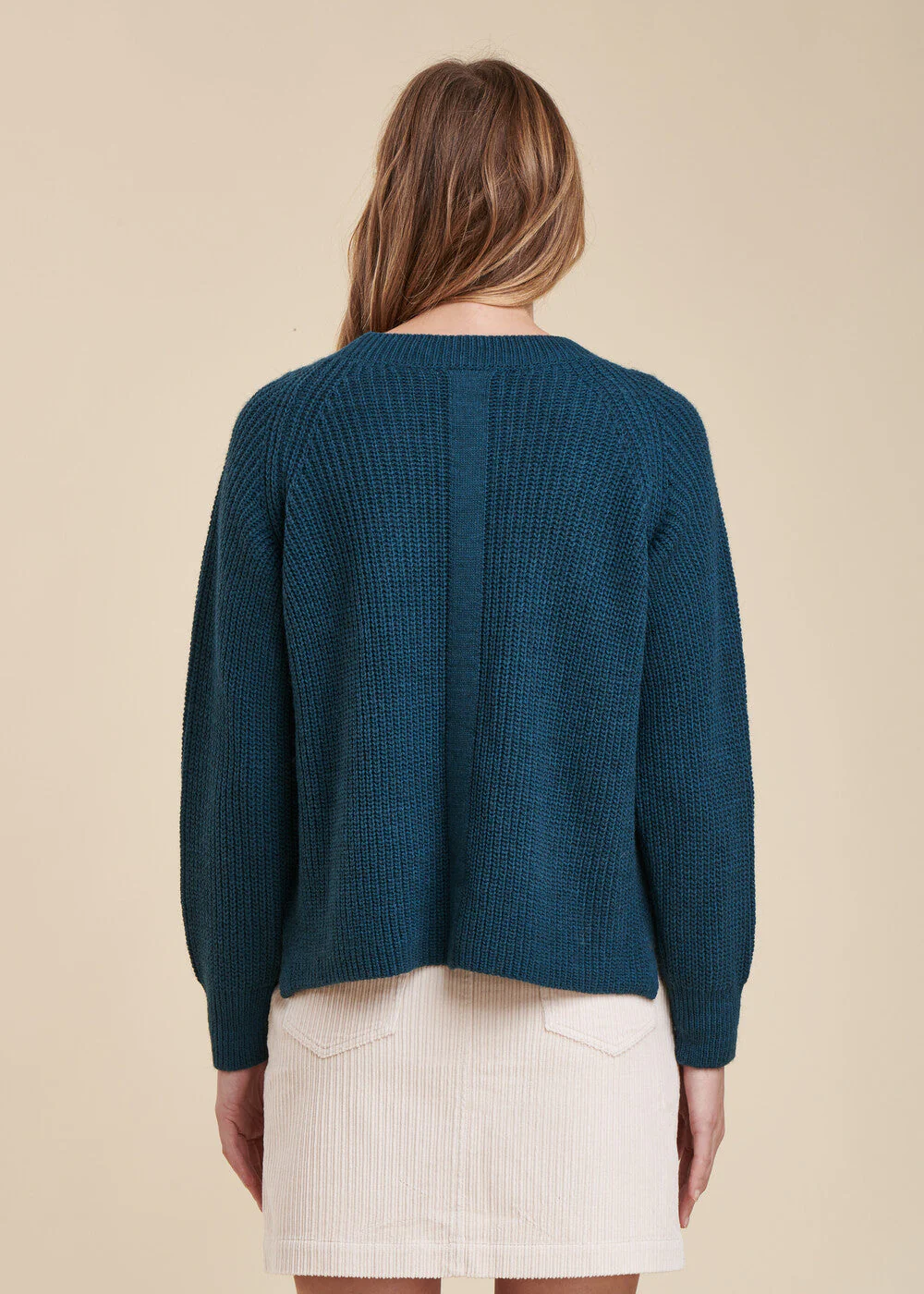 Pull en maille côtes perlées, emmanchures raglan, encolure ronde, coupe ample. Finitions bord-côte.