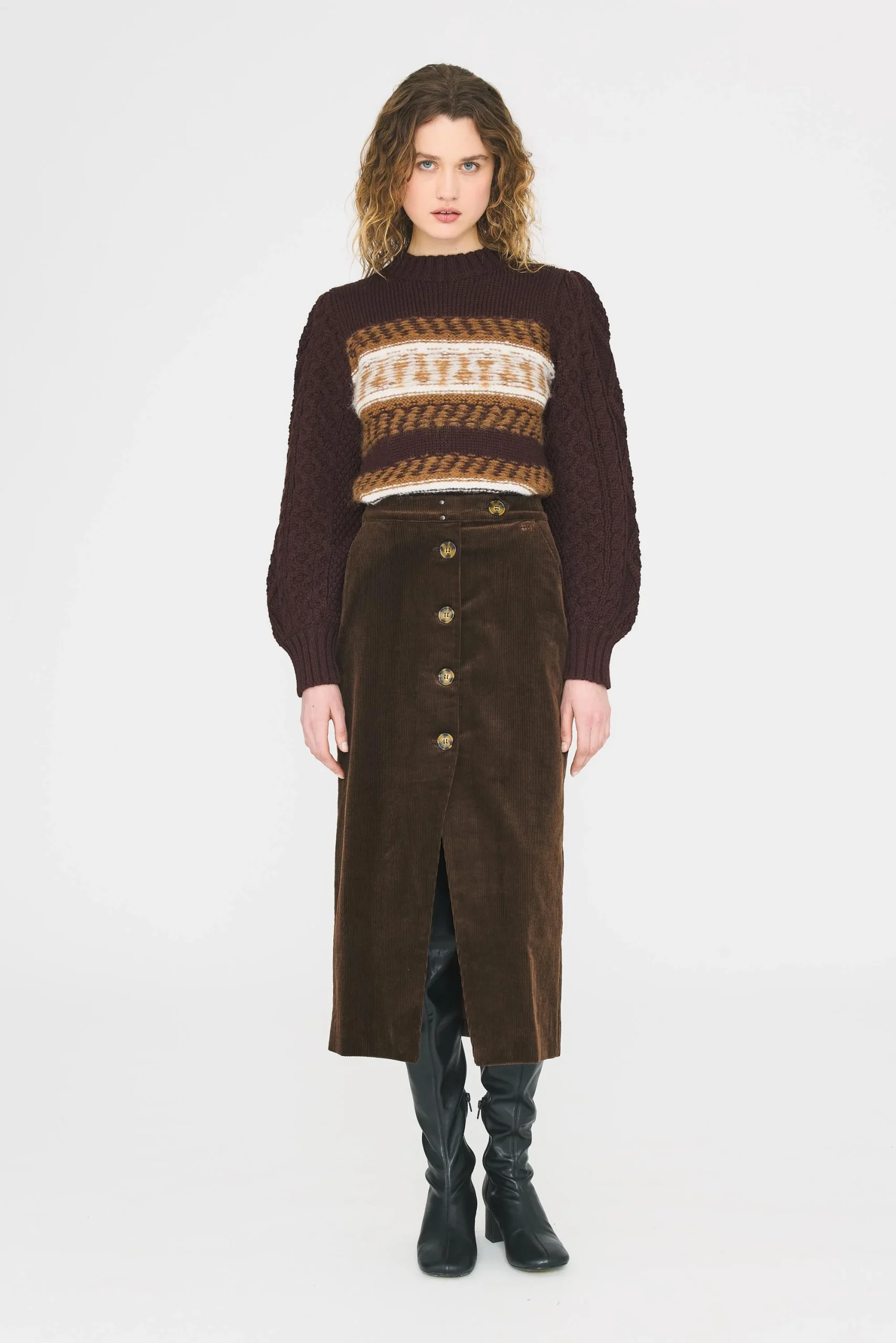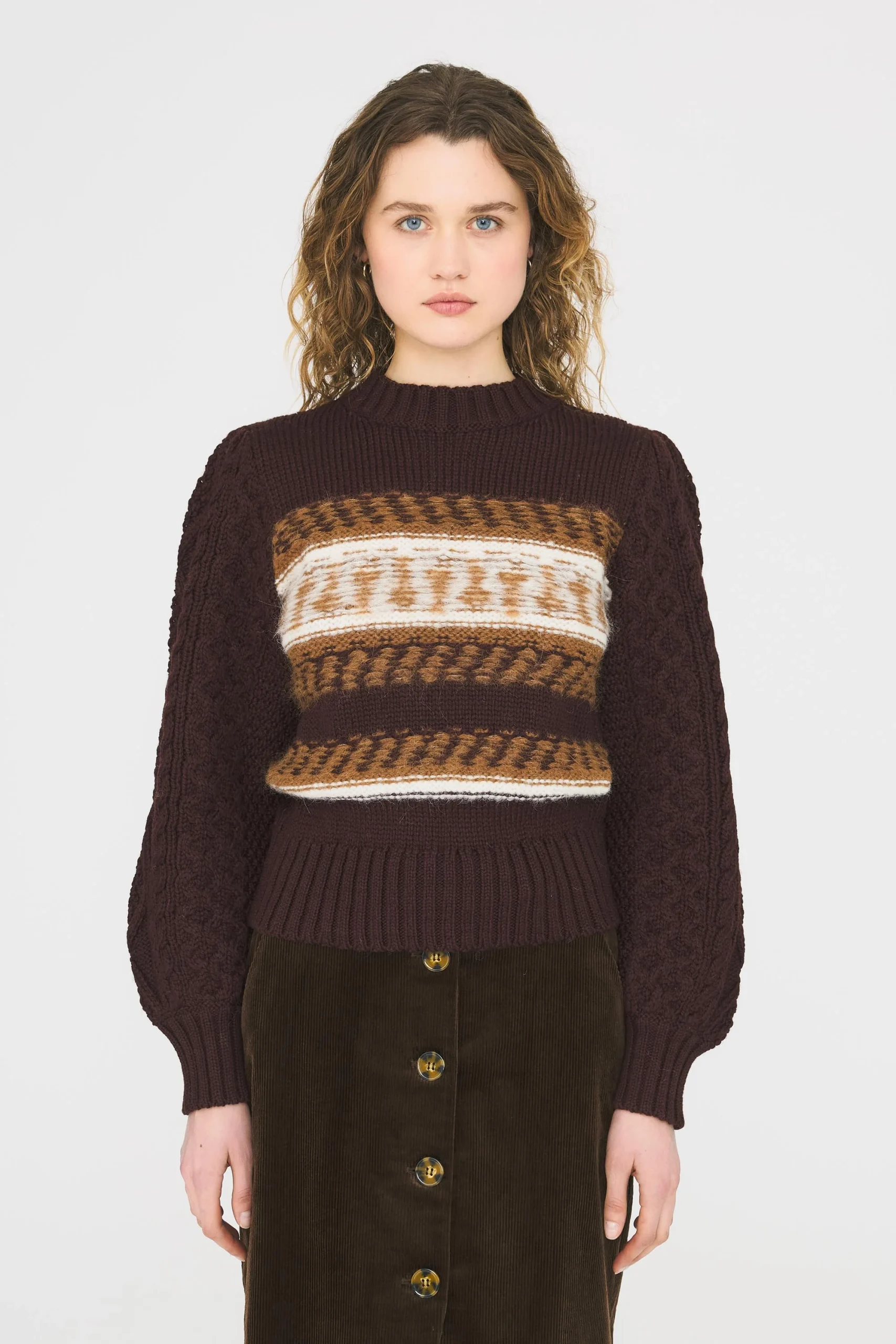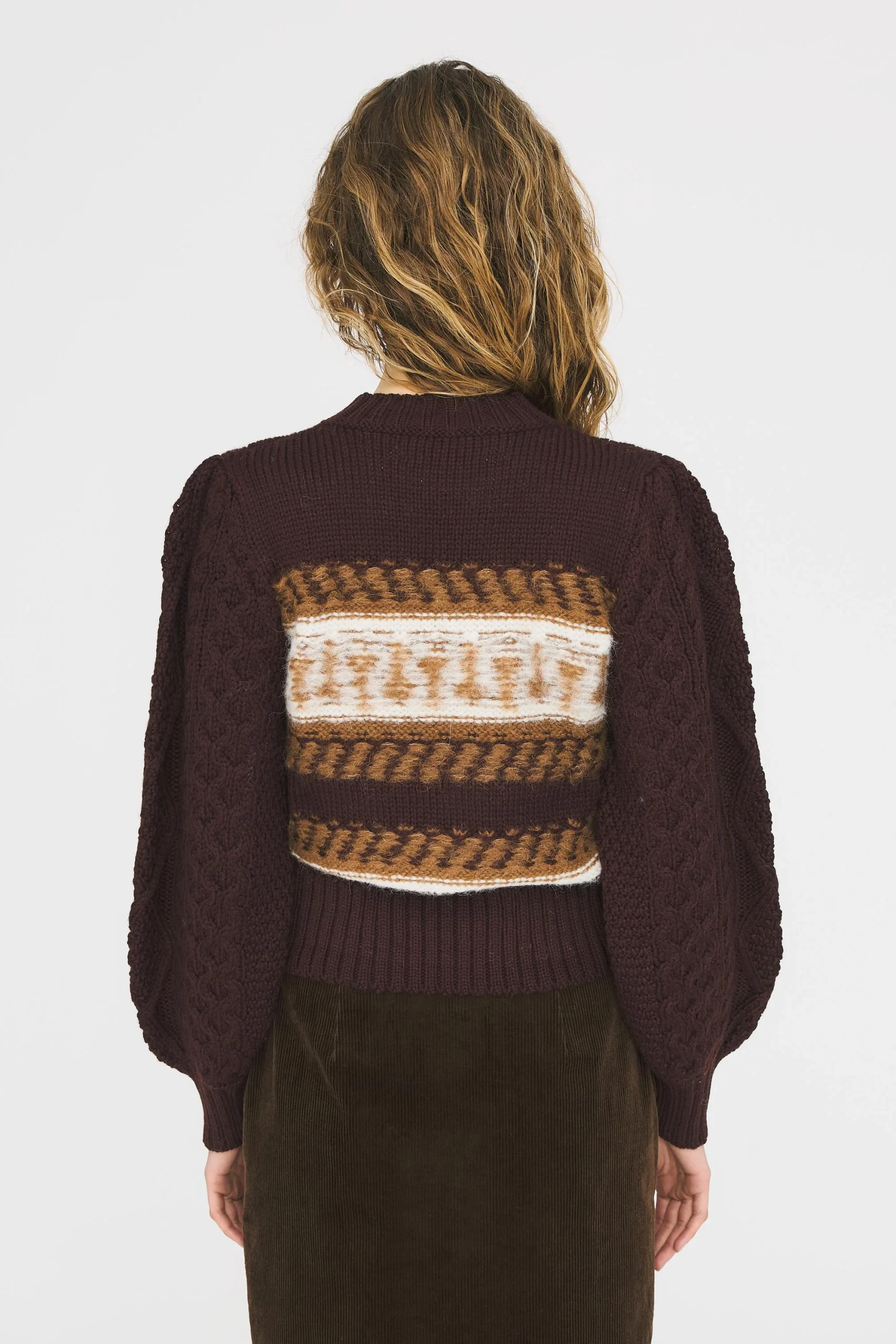 Pull tricoté en laine alpaga. Manches tricotées façon pull irlandais
