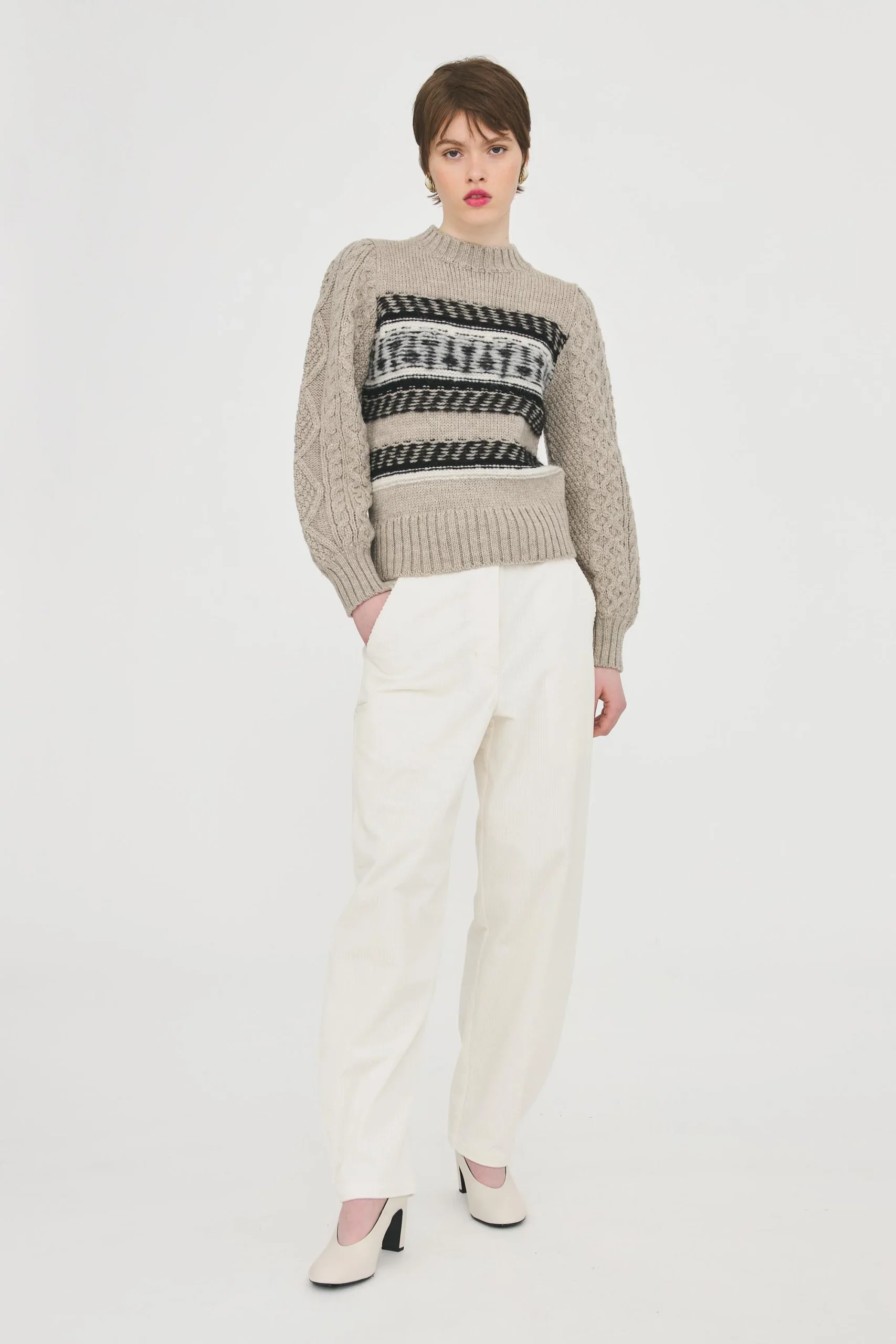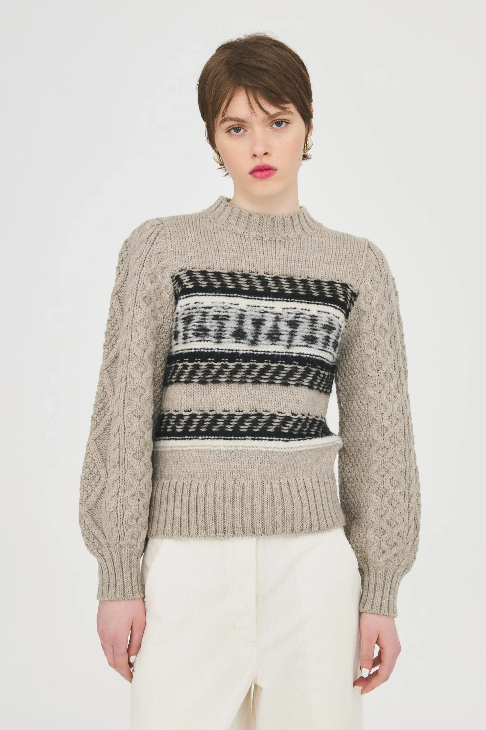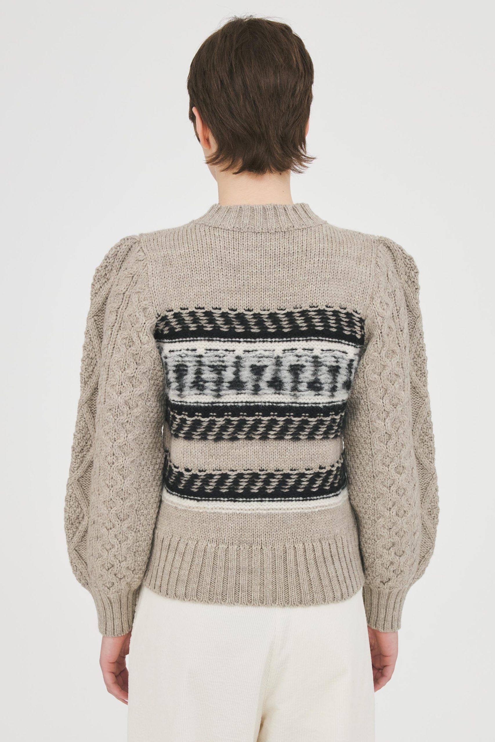 Pull tricoté en laine alpaga. Manches tricotées façon pull irlandais