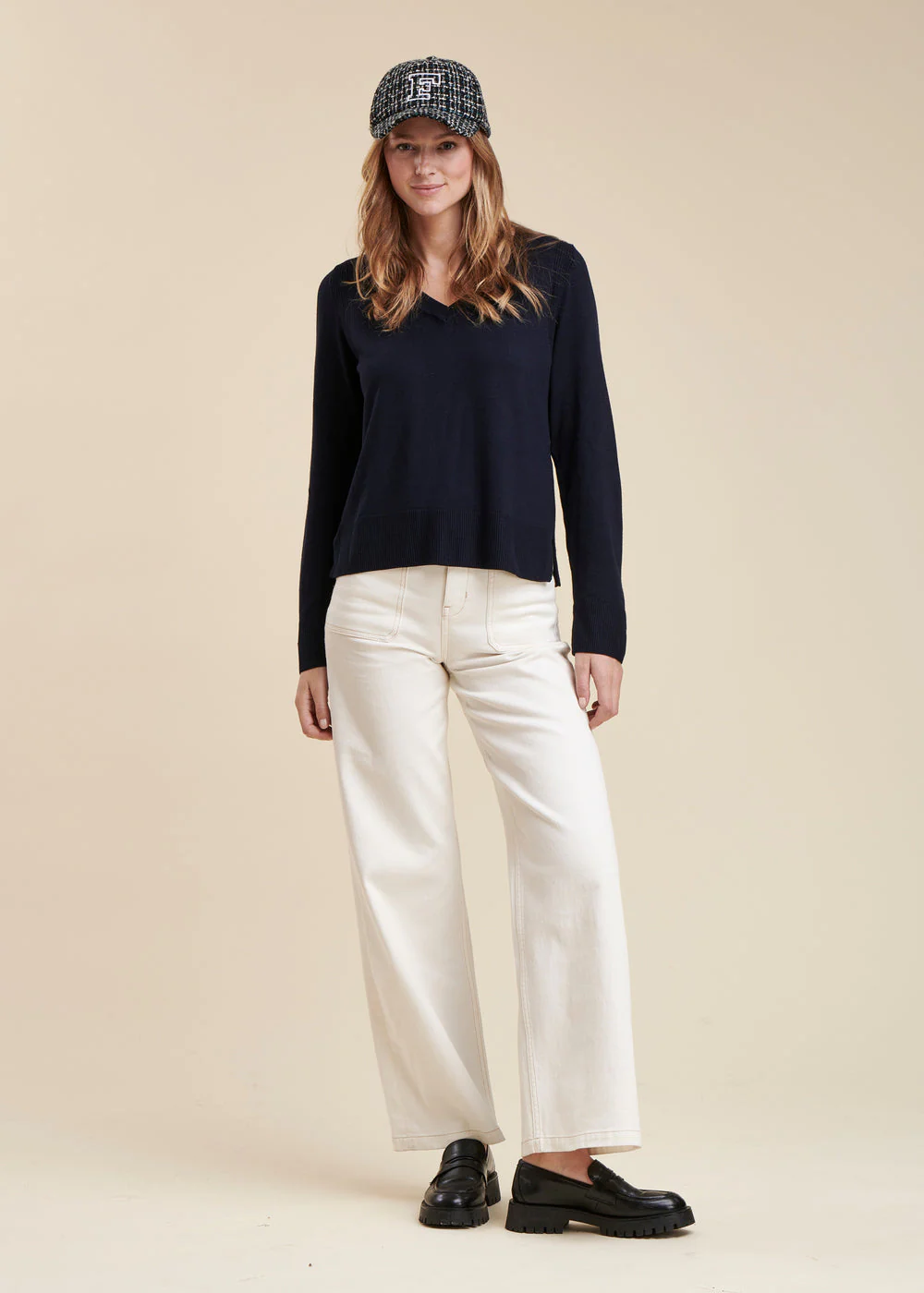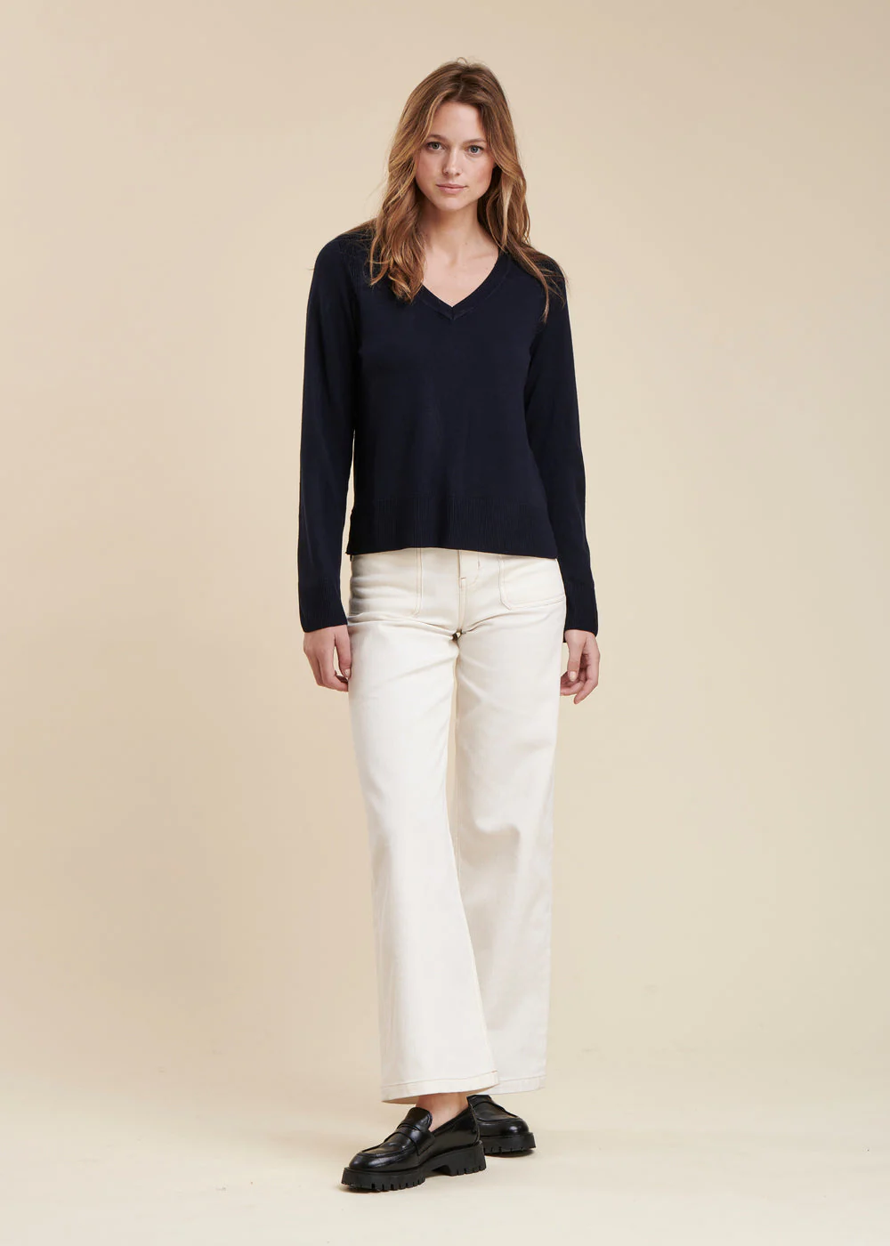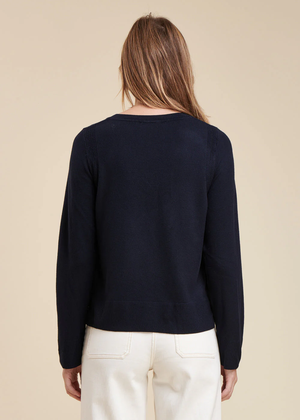 Pull en maille fine, manches longues, encolure V, délicat jeu de côtes autour des emmanchures, fentes côtés. Finitions encolure, bas de manches et bas de corps en bord-côte.