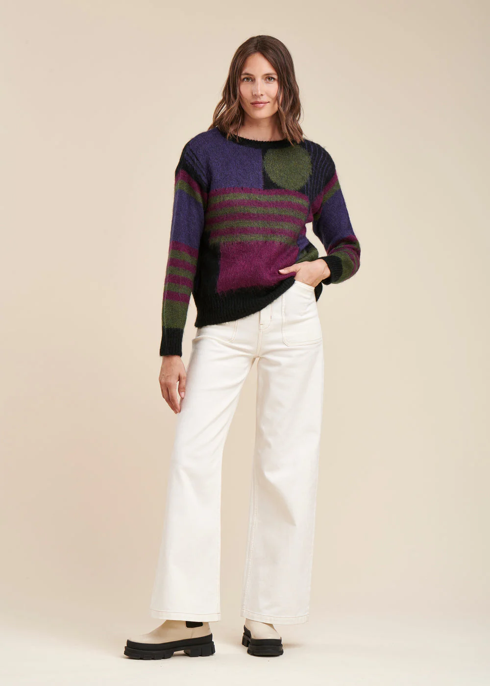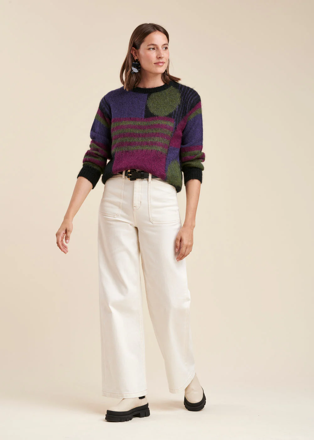 Pull maille jacquard, encolure ronde, manches longues, coupe droite. Finitions bord-côte contrastés. Motif jacquard exclusif.