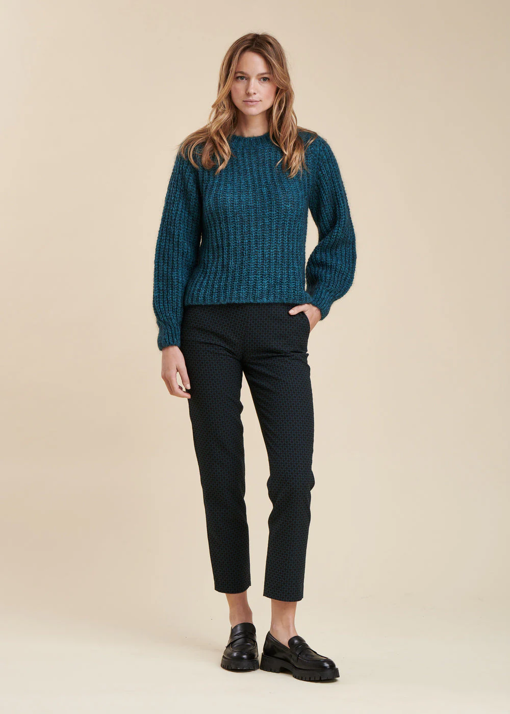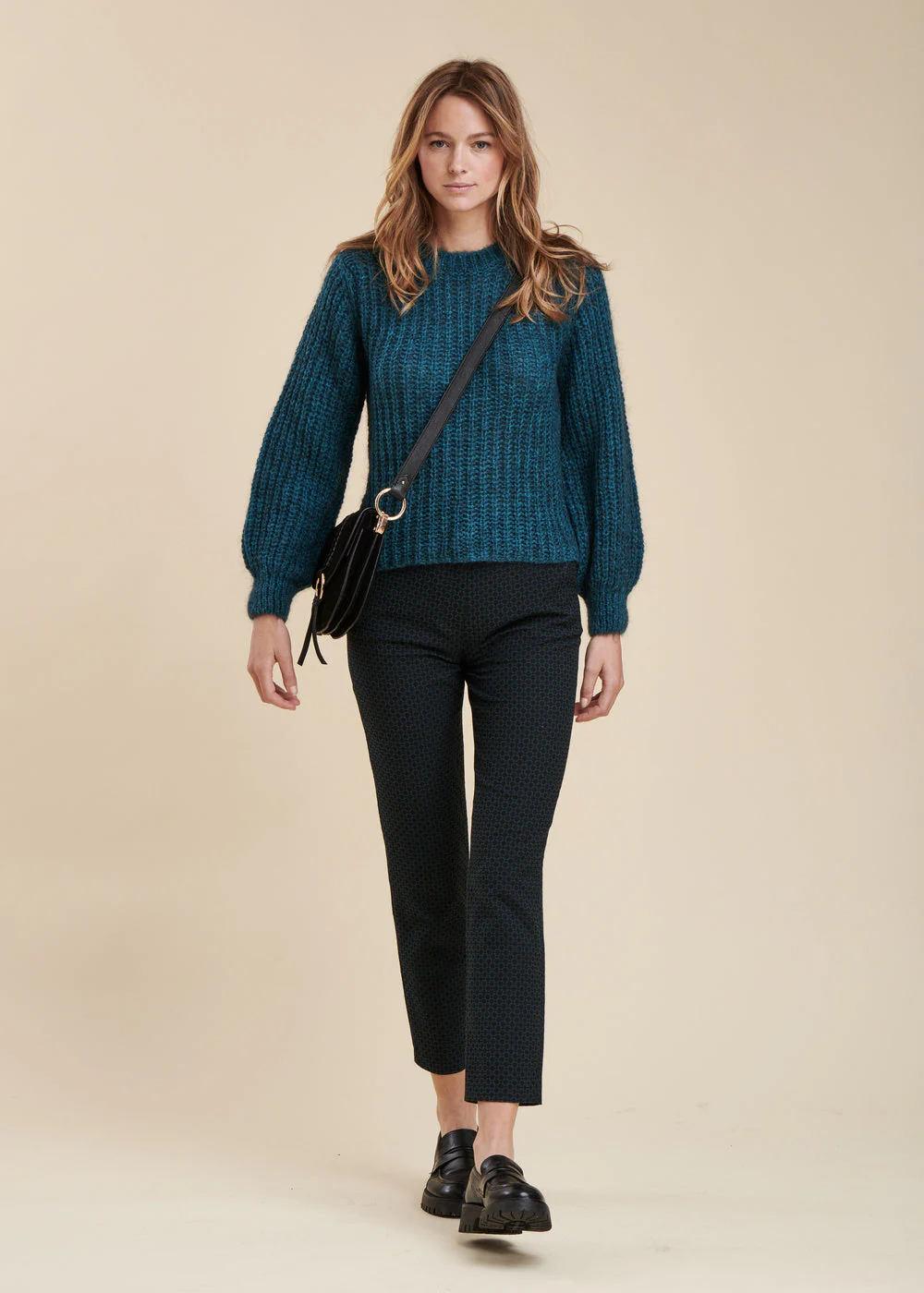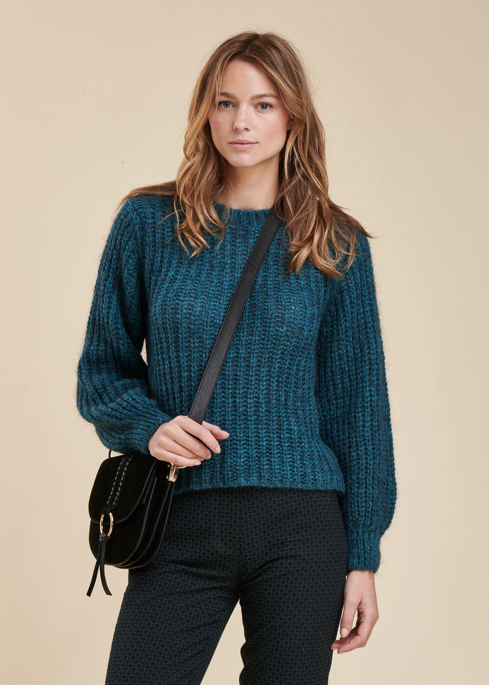 Pull en maille mohair, manches longues bouffantes, coupe ample.