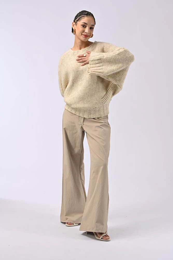 Ce pull se distingue par ses détails côtelés en finition et son col rond, apportant une touche de raffinement à son style intemporel. La couleur beige, douce et neutre, s’accorde facilement avec toutes les tenues, que ce soit pour un look quotidien ou plus sophistiqué.