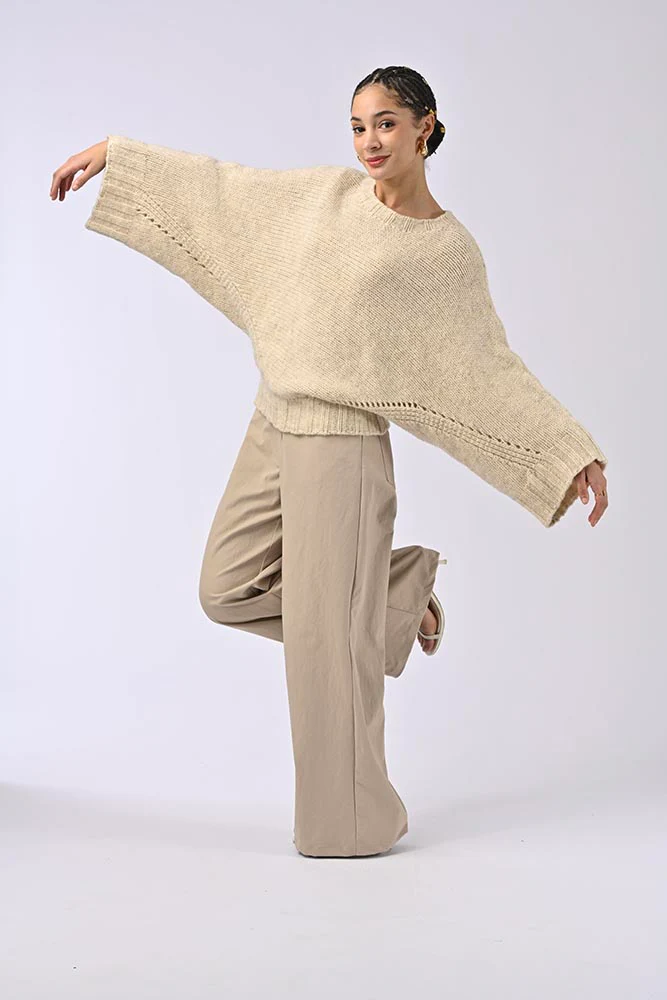 Associé à un pantalon large ou à un jean, ce pull crée un ensemble harmonieux, idéal pour les journées décontractées comme pour les occasions semi-formelles. Son tissu texturé et sa coupe fluide en font une pièce incontournable, aussi confortable que stylée.