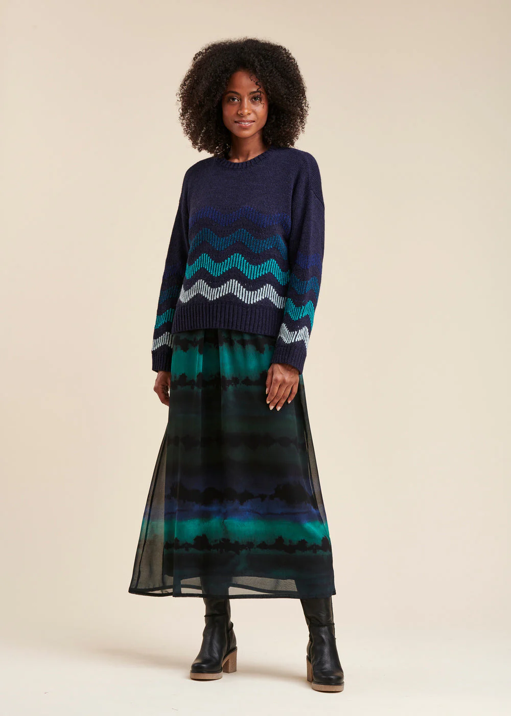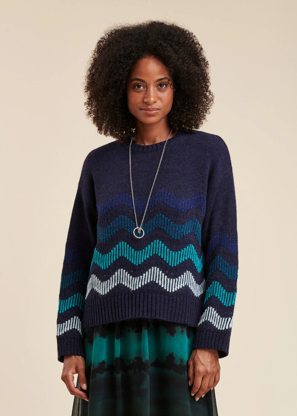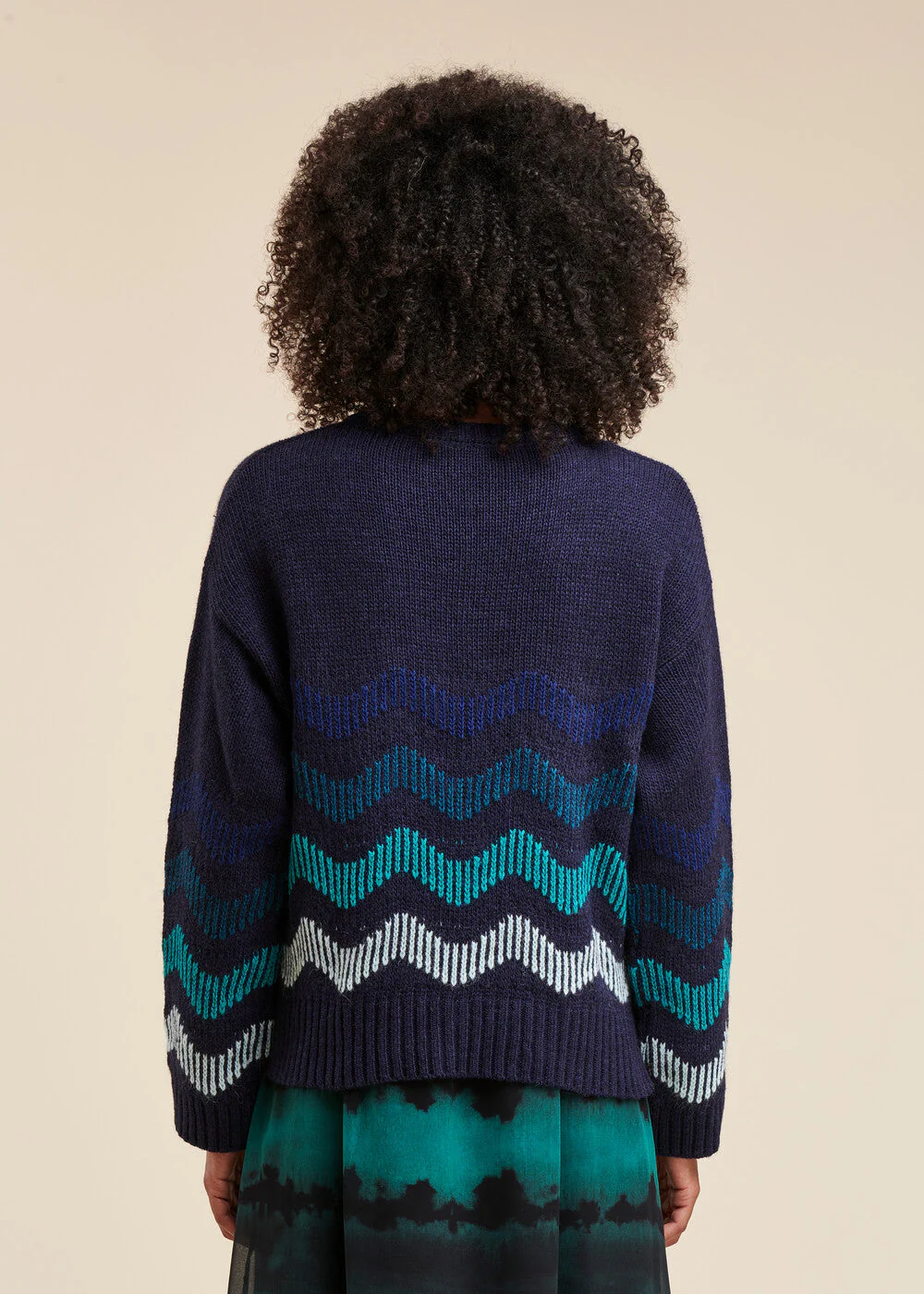Pull encolure ronde, manches longues tombantes, coupe ample. Rayures zigzag en dégradé de couleurs.