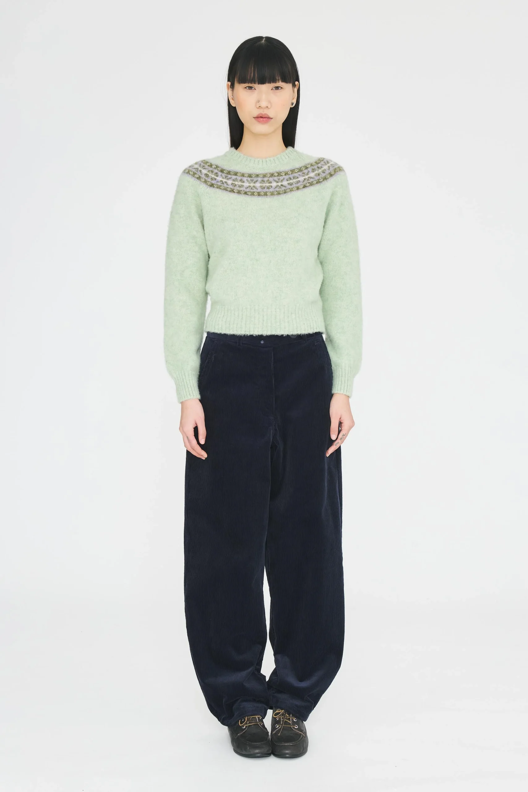 Cette capsule en pure laine Shetland a été conçue avec la maison McGeorge, une maison historique qui tricote ce fil depuis 1881. La maille est d’une qualité incomparable. Chaude, elle devient de plus en plus douce avec le temps. Ici, on retrouve un motif traditionnel Fair isle : indémodable.