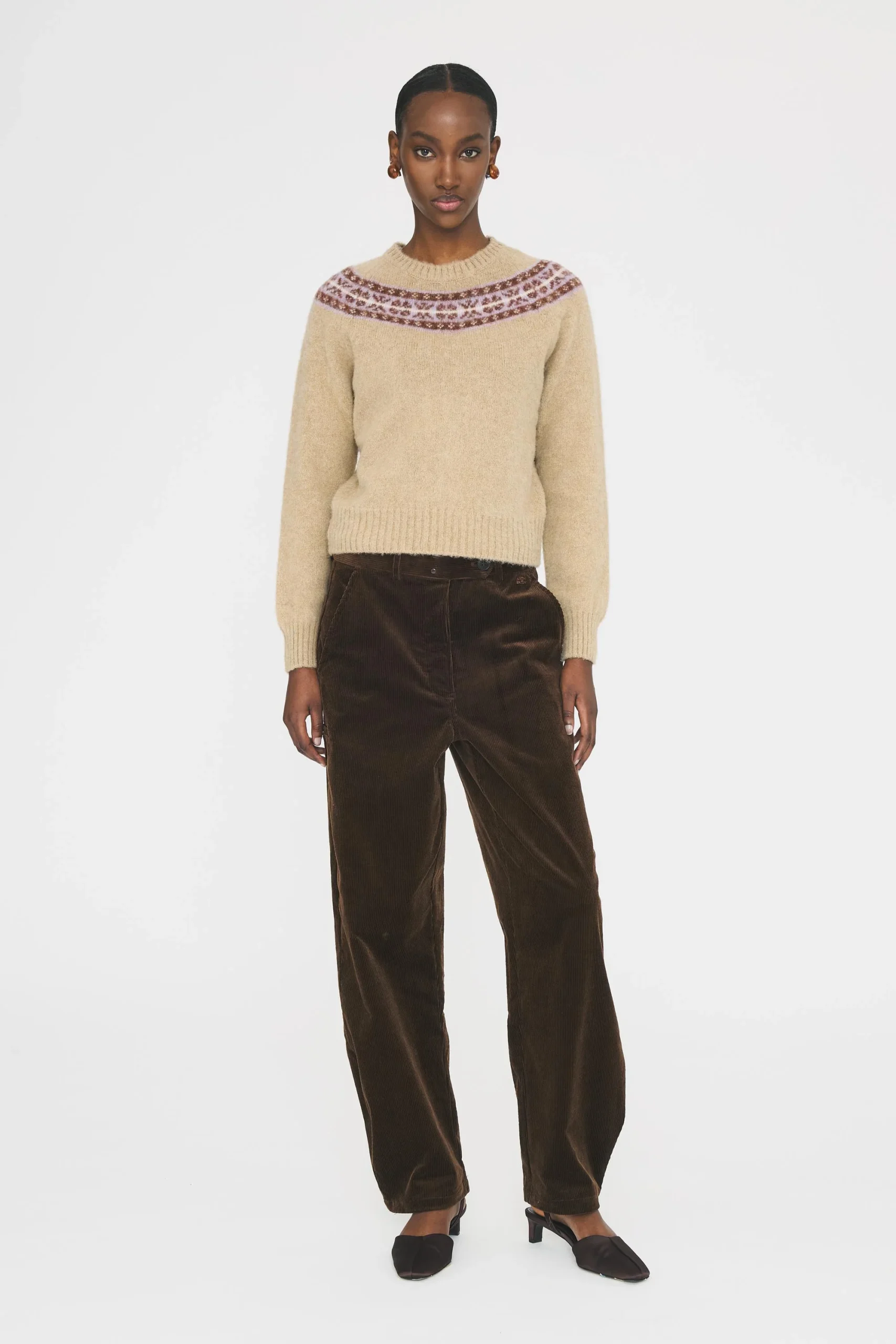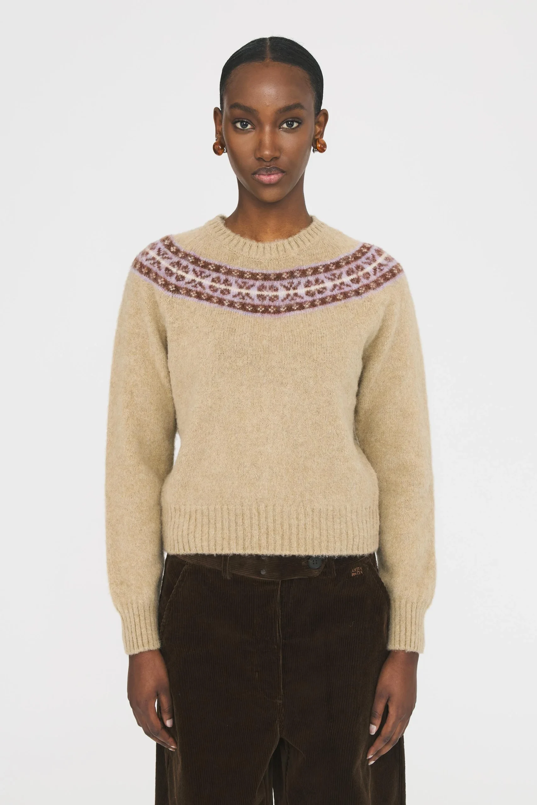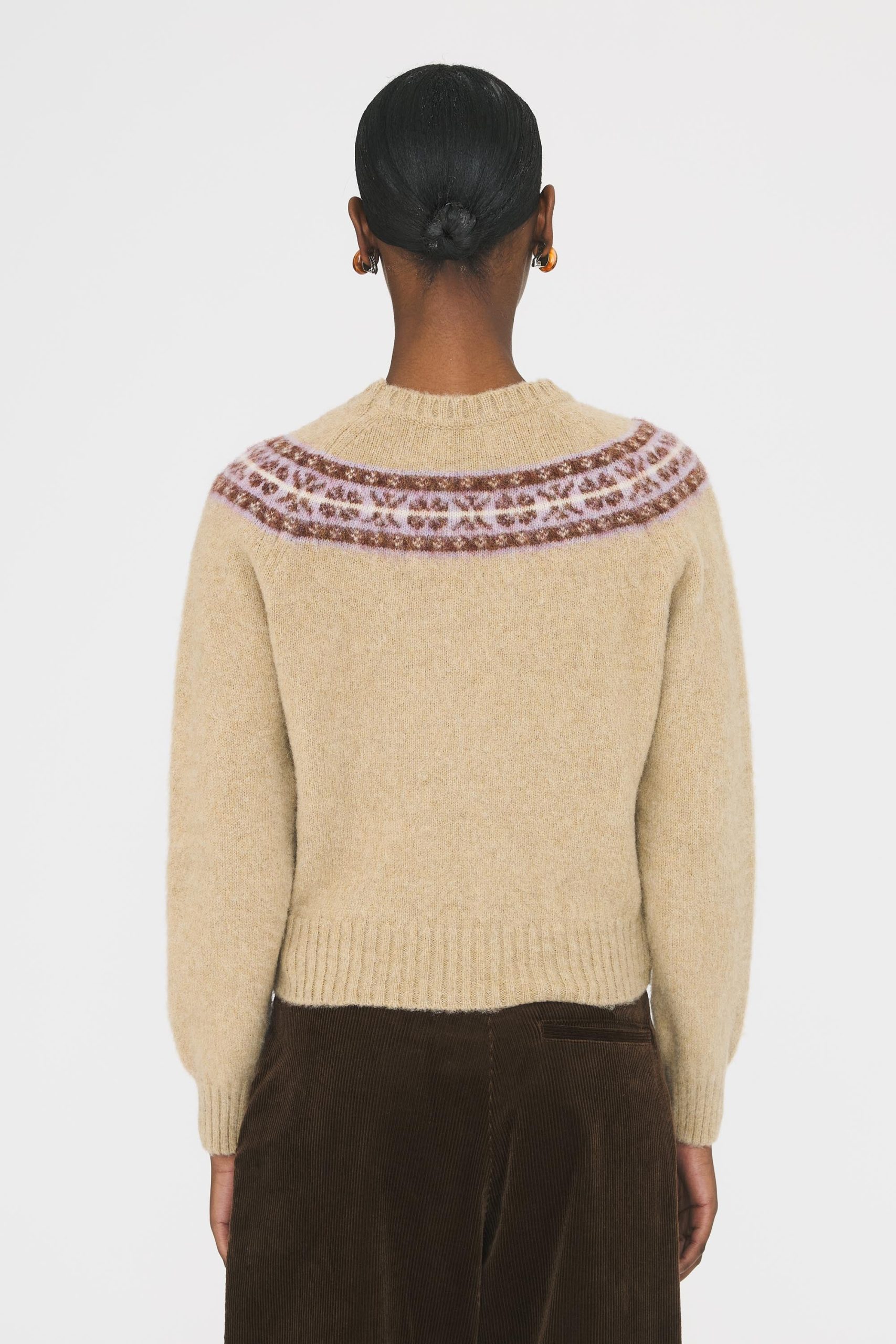 Cette capsule en pure laine Shetland a été conçue avec la maison McGeorge, une maison historique qui tricote ce fil depuis 1881. La maille est d’une qualité incomparable. Chaude, elle devient de plus en plus douce avec le temps. Ici, on retrouve un motif traditionnel Fair isle : indémodable.