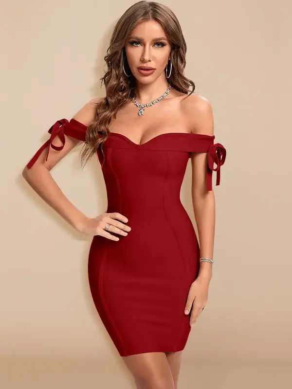 Plongez dans un bordeaux profond et velouté, une couleur riche qui évoque le luxe et la passion. Son design glamour sublime vos épaules dénudées avec un décolleté en cœur, rehaussé de délicats nœuds sur les bras pour une touche romantique. Notre tissu élastique signature sculpte votre corps avec une précision parfaite, dessinant une silhouette gracieuse et affirmée.