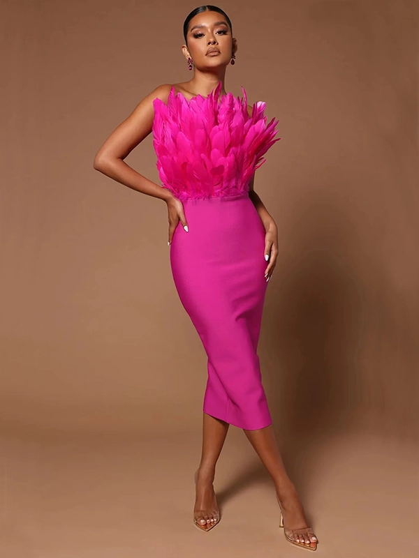 Robe Bandage de Soirée Rose Coupe Midi et Bustier en Plumes