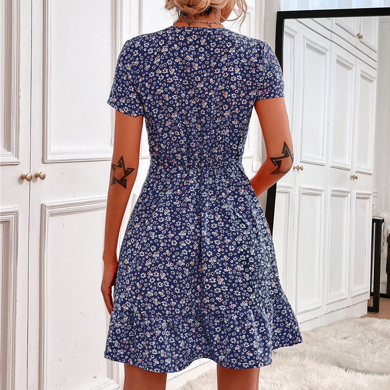 Conçue à partir d’un doux mélange de polyester et de coton, cette robe offre une sensation de légèreté et de confort tout au long de la journée. Le motif floral, élégant et intemporel, apporte une touche de féminité, tandis que le col en V souligne délicatement le décolleté. Les manches courtes, idéales pour les beaux jours, accentuent son allure estivale. La couleur bleue, dominante de cette robe, offre un véritable atout de polyvalence, se prêtant aussi bien à un contexte décontracté qu’à une occasion plus formelle.