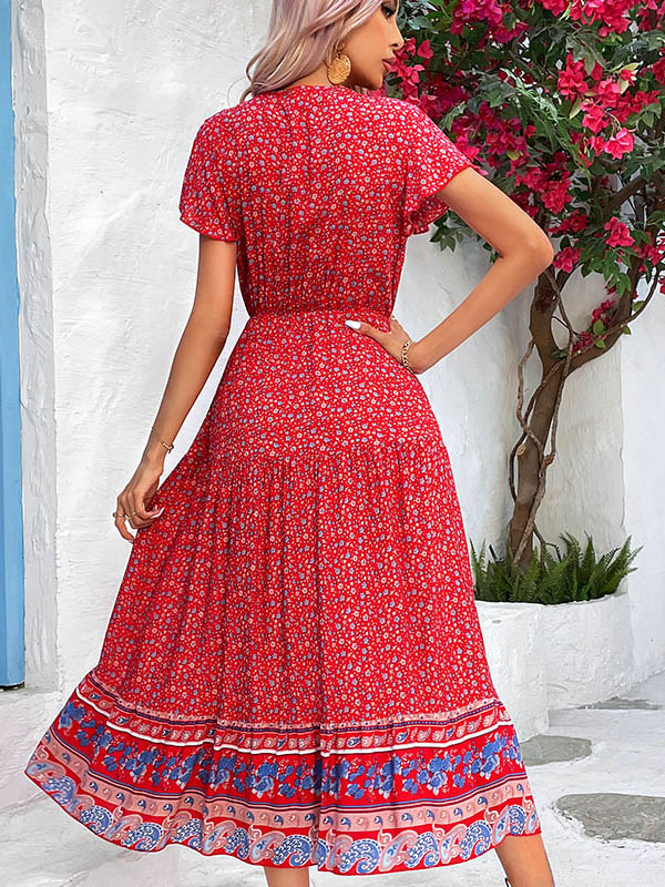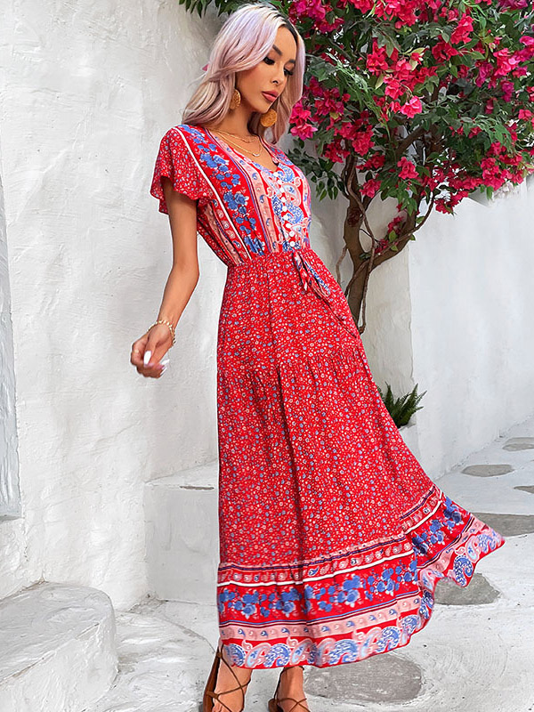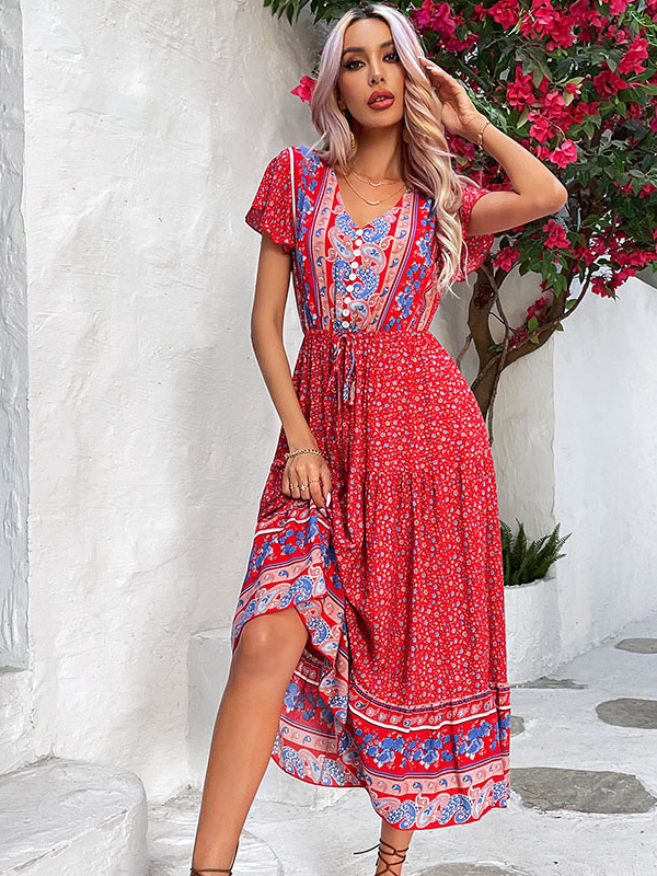 Avec son imprimé à fleurs et bandana, cette robe bohème longue fleurs rouge est un vrai bonheur pour les yeux. La poitrine est joliment mise en valeur par un décolleté en V agrémenté de petits boutons. On adore son côté boho avec ses manches courtes évasées, son jupon volanté imprimé bandana et son nœud décoratif.