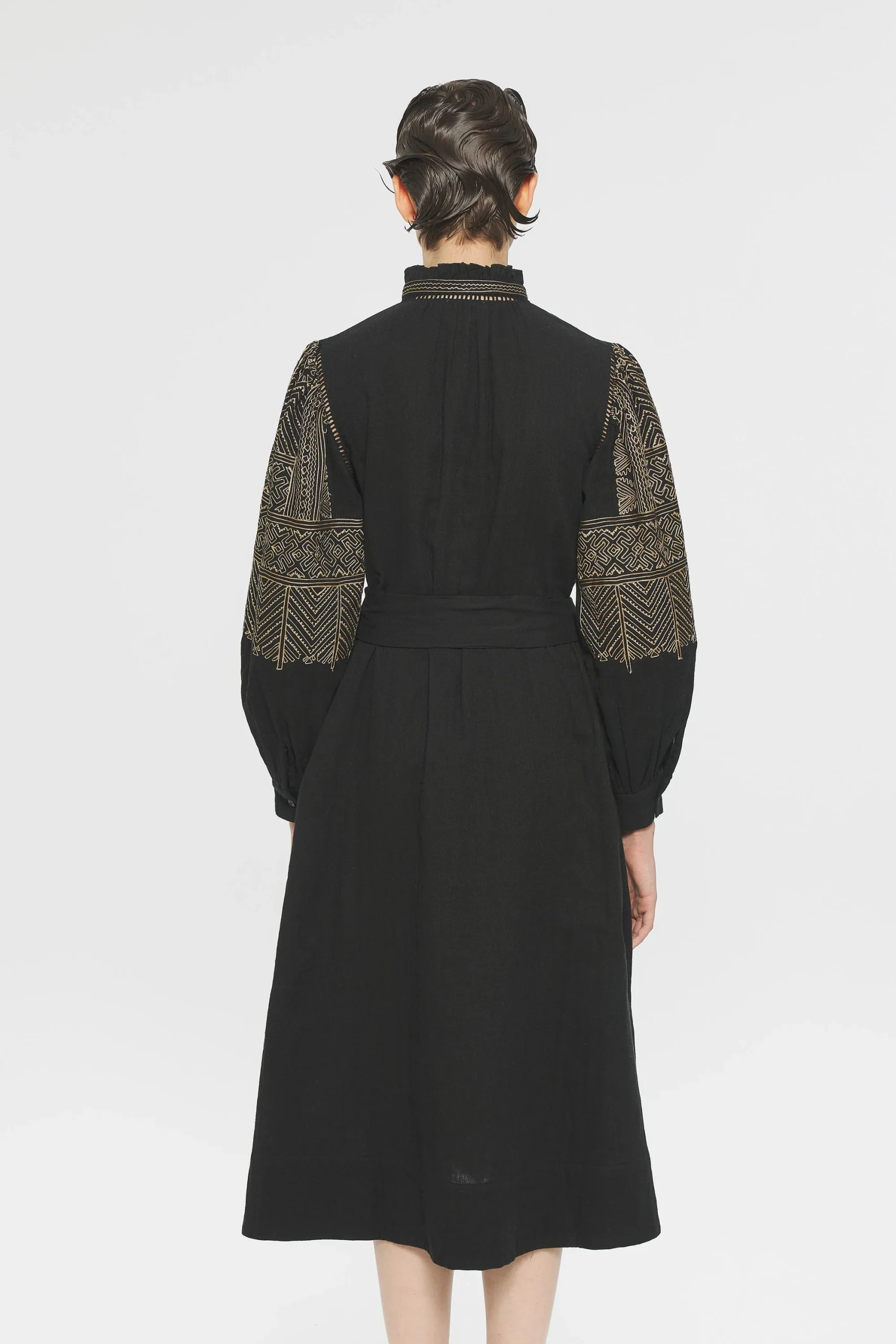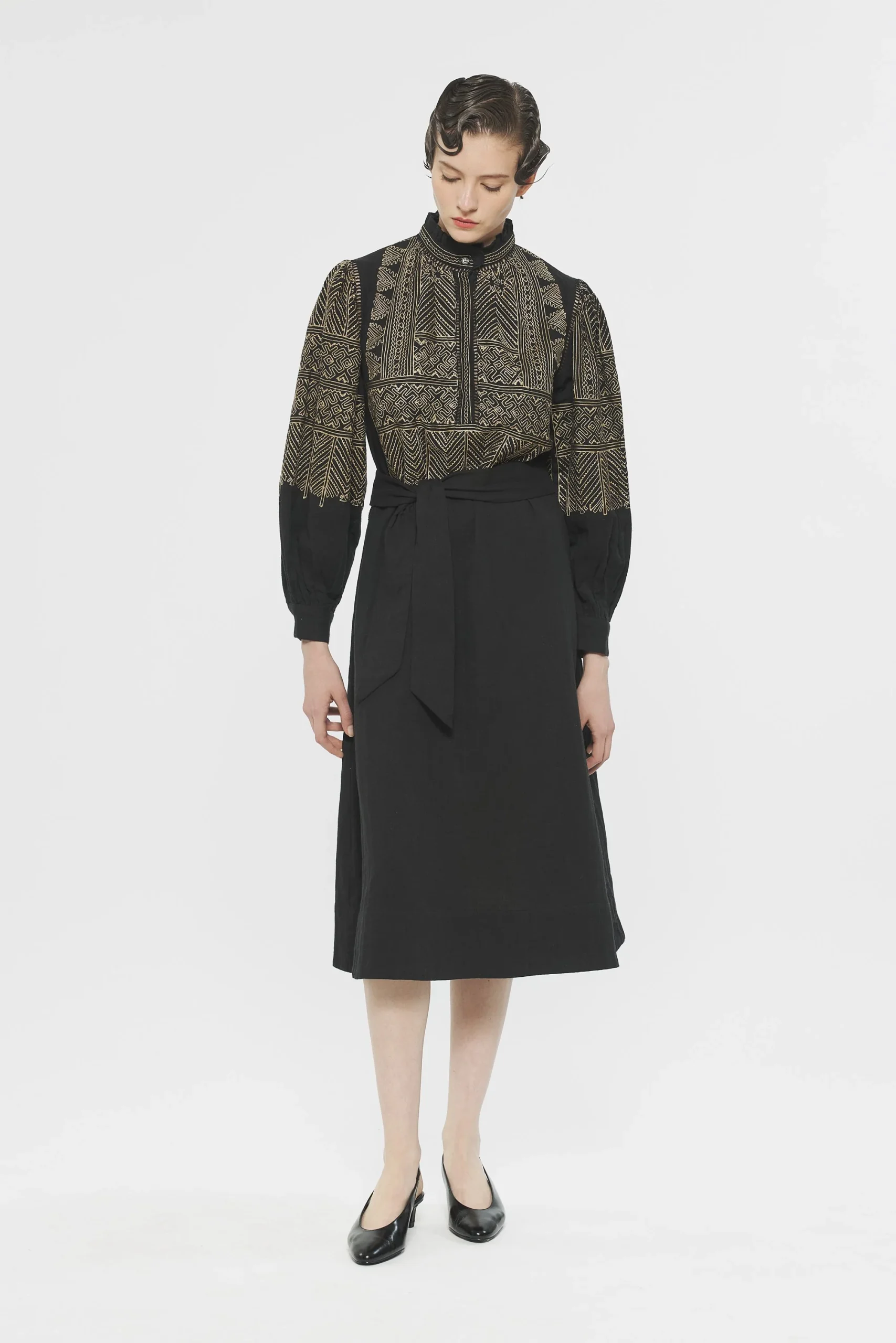 Robe mi-longue en double gaze de coton. Broderies géométriques et artisanales sur le devant et les manches. Détails ajourés aux épaules et sur le devant. Ruban en coton inséré au niveau du col. Froncée au bas des manches. Patte de boutonnage sur le devant. Ceinture amovible. Manches ballon ressérées aux poignetx par un bouton. Bouton en polyamide. Doublure en coton.