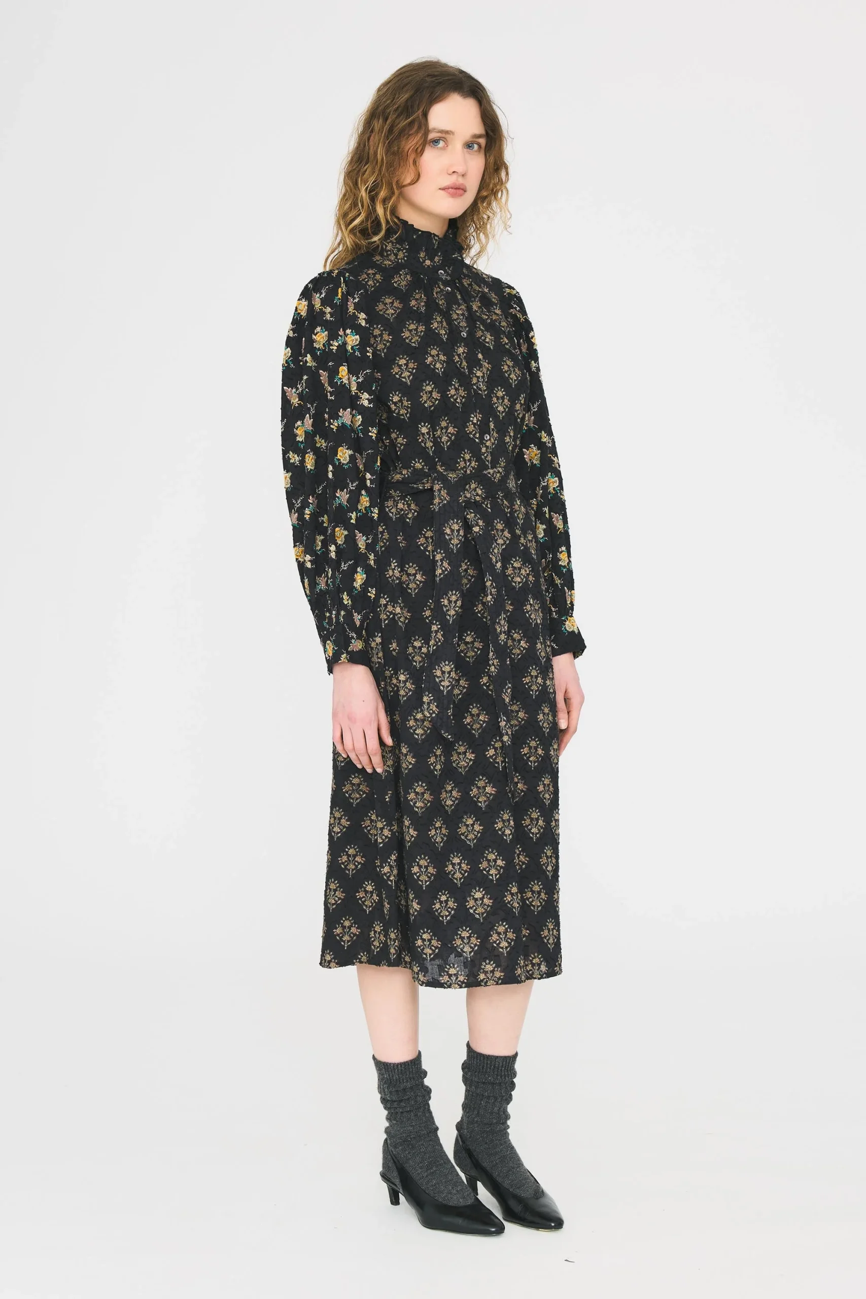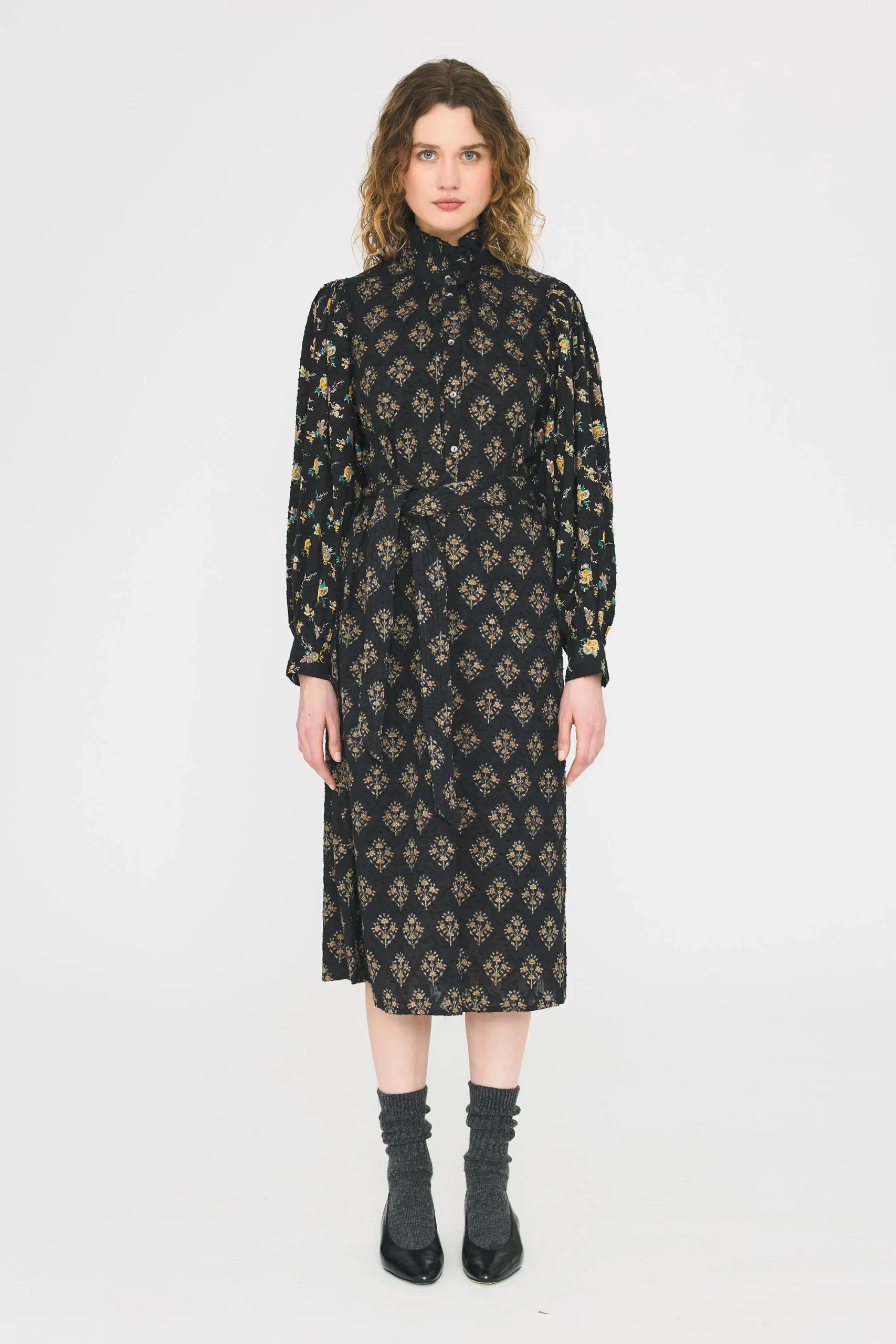 Robe mi-longue en jacquard de coton imprimé. Col froncé et montant. Froncés aux épaules et sur l’avant des manches. Patte de boutonnage sur l’avant. Fermée aux poignets par un bouton. Ceinture amovible quiltée.