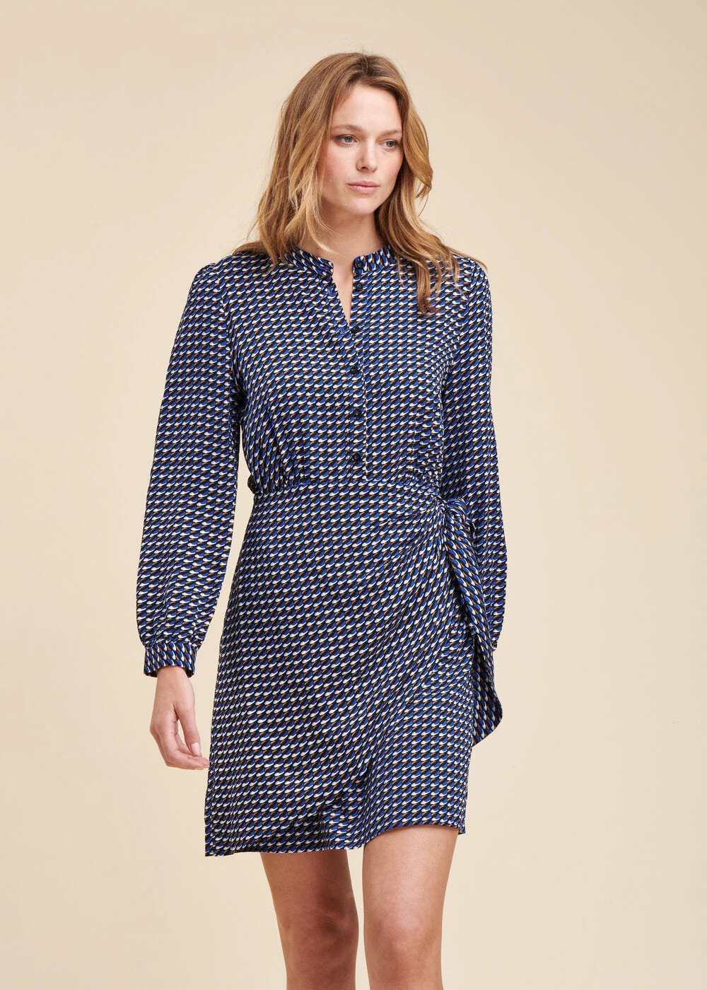 Robe courte à imprimé graphique en viscose écoresponsable Ecovero, petit col mao, manches longues bouffantes avec poignets boutonnés, devant boutonné jusqu’à la taille, découpe taille avec fronces sous poitrines, jupe courte avec faux pan à nouer, zip côté. Longueur : 92 cm.